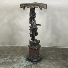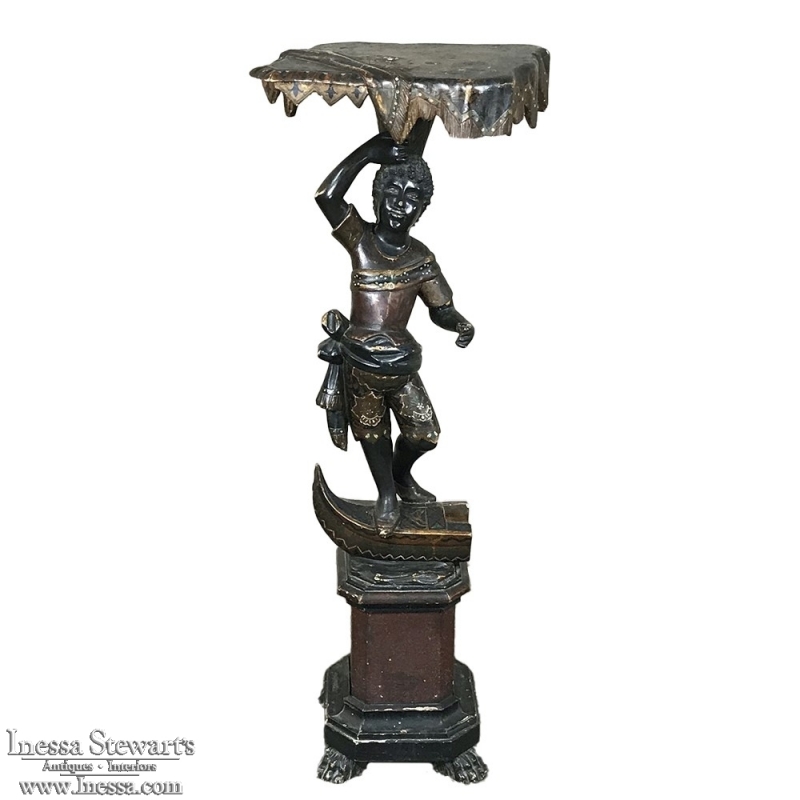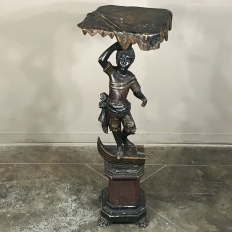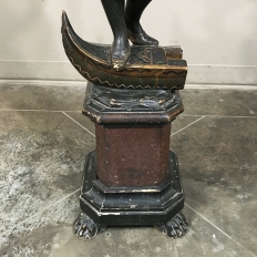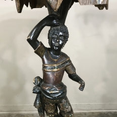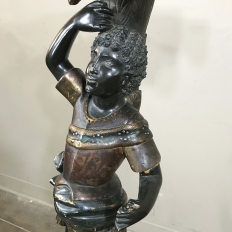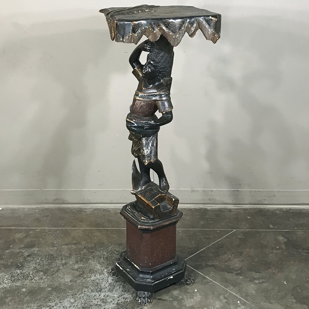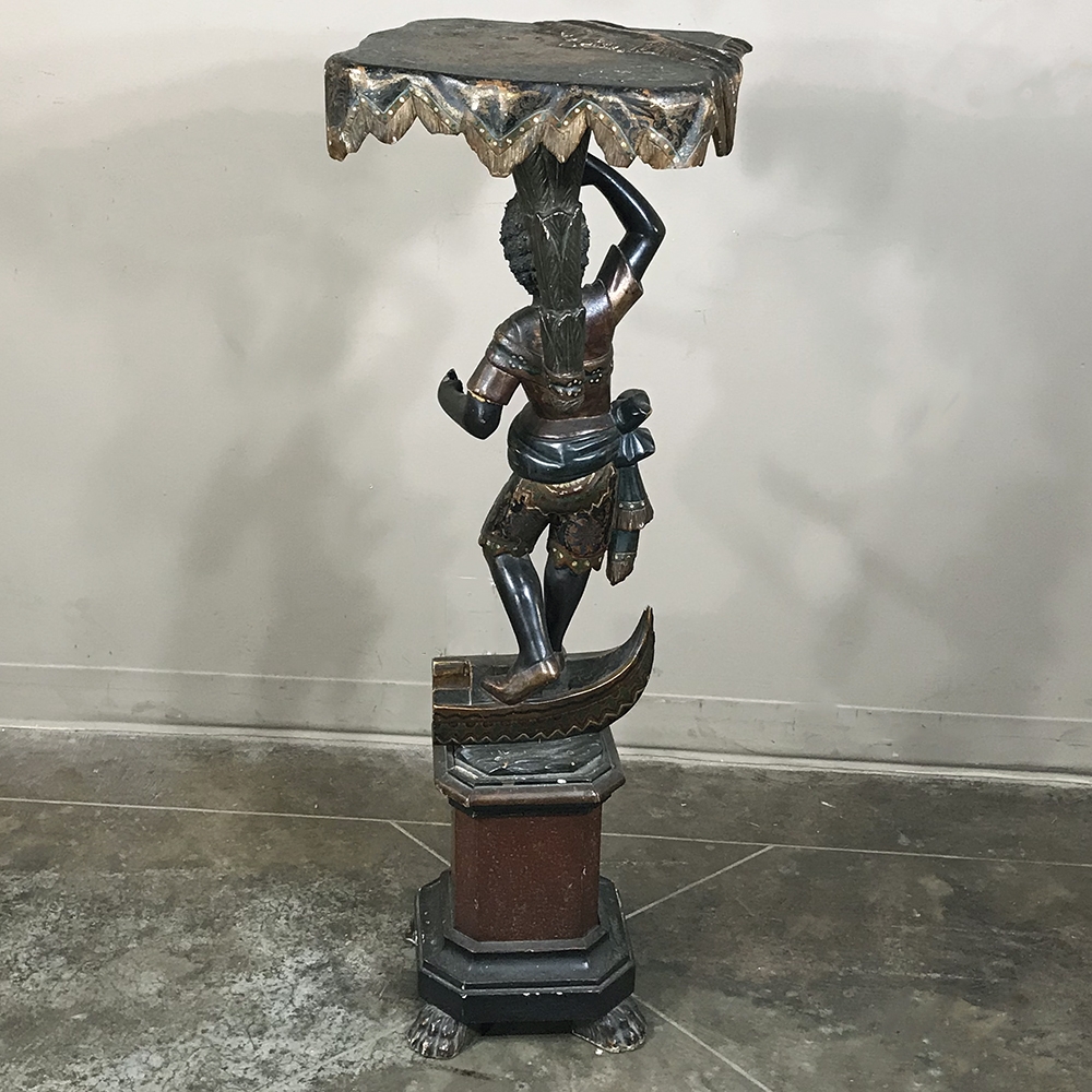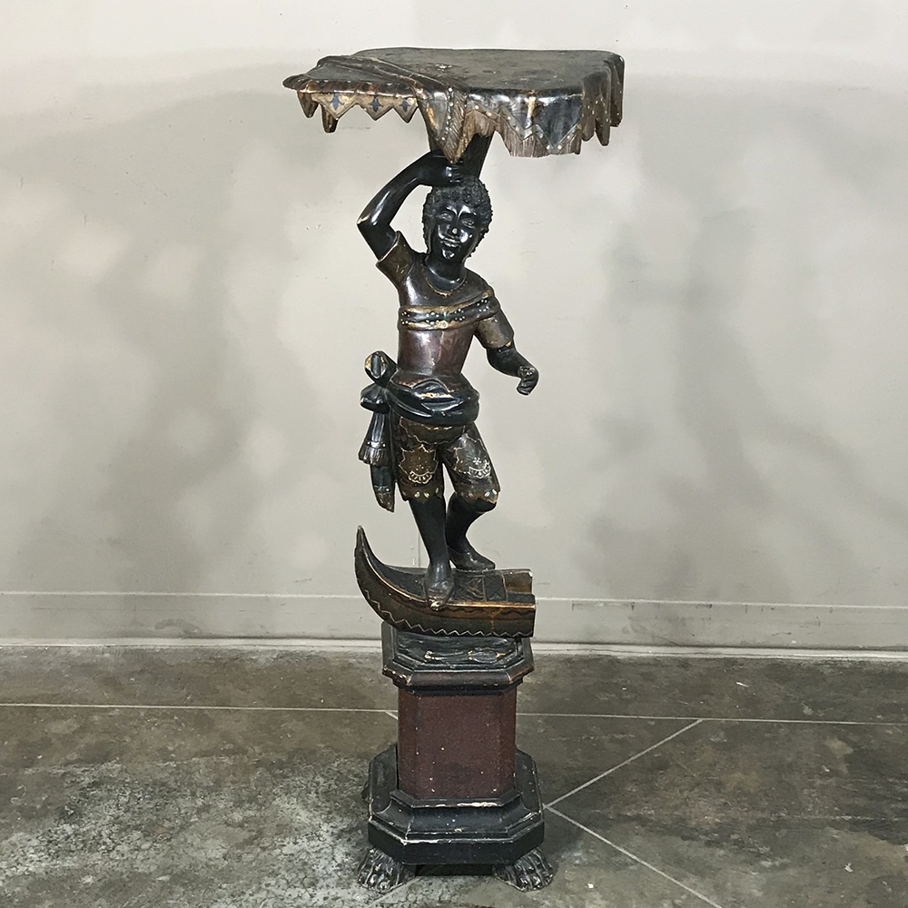 Sale19th Century Hand-Painted Venetian Blackamore Pedestal is a wonderful example of the works coming out of Venice during the latter half of the 19th century, identified by their extraordinary artistry and craftsmanship, plus the gondola represented at the bottom of the figure just above the elaborately adorned pedestal. Each sculpture is hand-painted to perfection and given a special proprietary finish to preserve the coloration, but Venetian versions usually have an added complexity to the pediment top above representing folded cloth, or some other artistic touch.