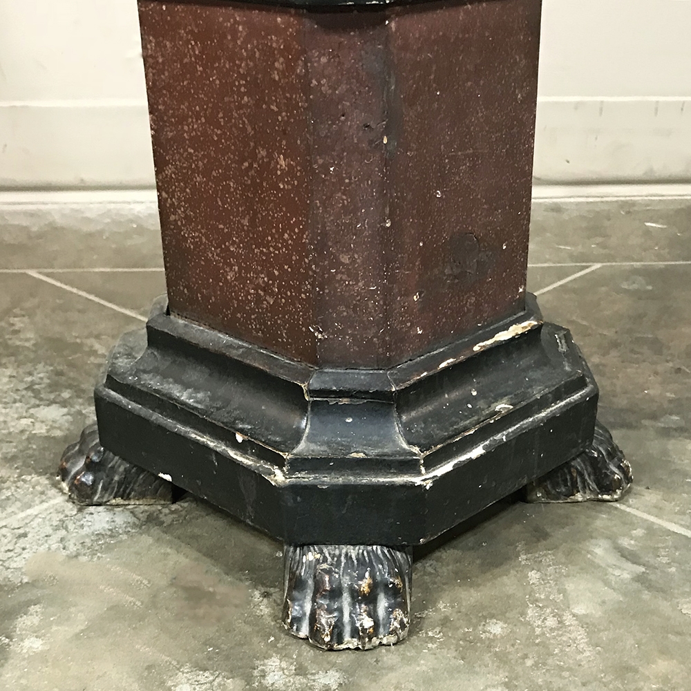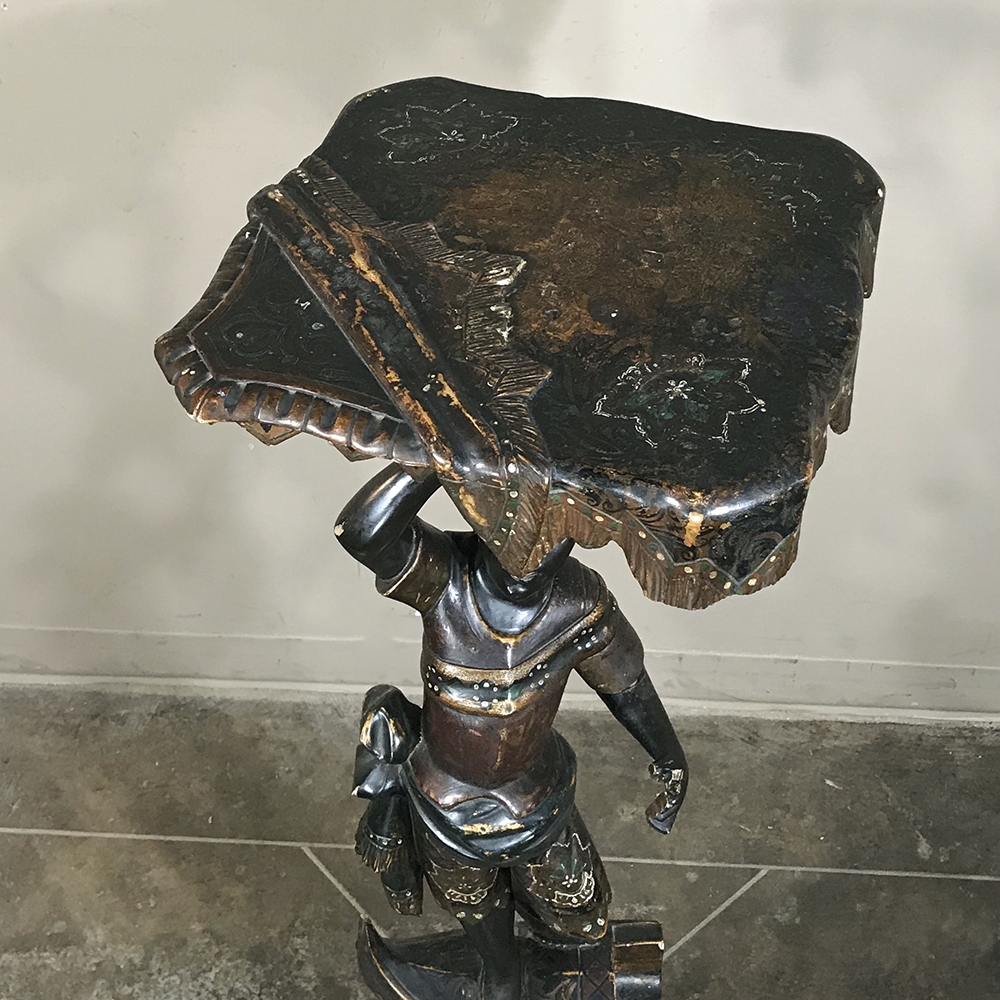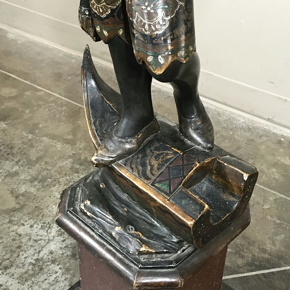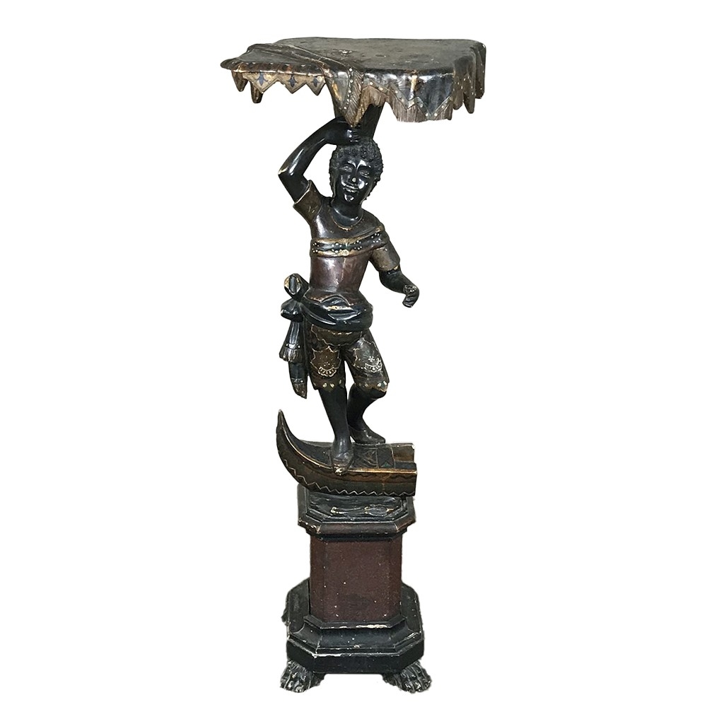 Sale19th Century Hand-Painted Venetian Blackamore Pedestal is a wonderful example of the works coming out of Venice during the latter half of the 19th century, identified by their extraordinary artistry and craftsmanship, plus the gondola represented at the bottom of the figure just above the elaborately adorned pedestal. Each sculpture is hand-painted to perfection and given a special proprietary finish to preserve the coloration, but Venetian versions usually have an added complexity to the pediment top above representing folded cloth, or some other artistic touch.