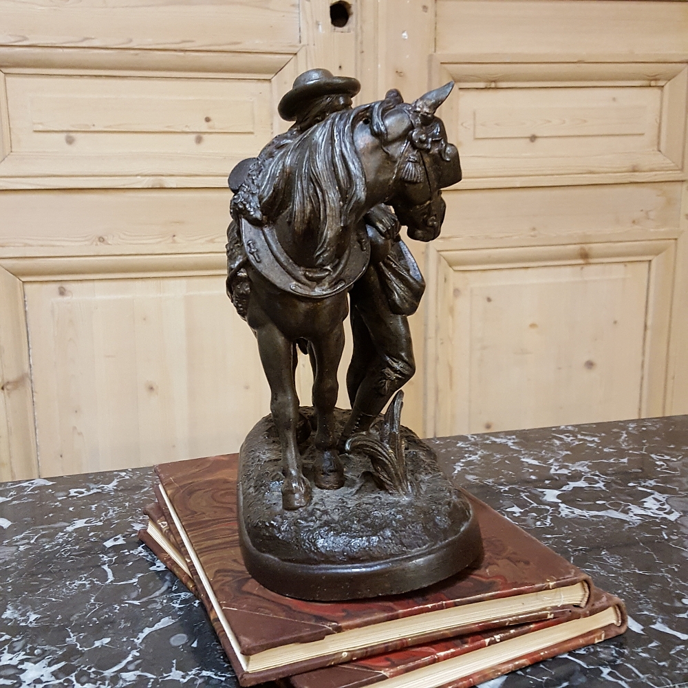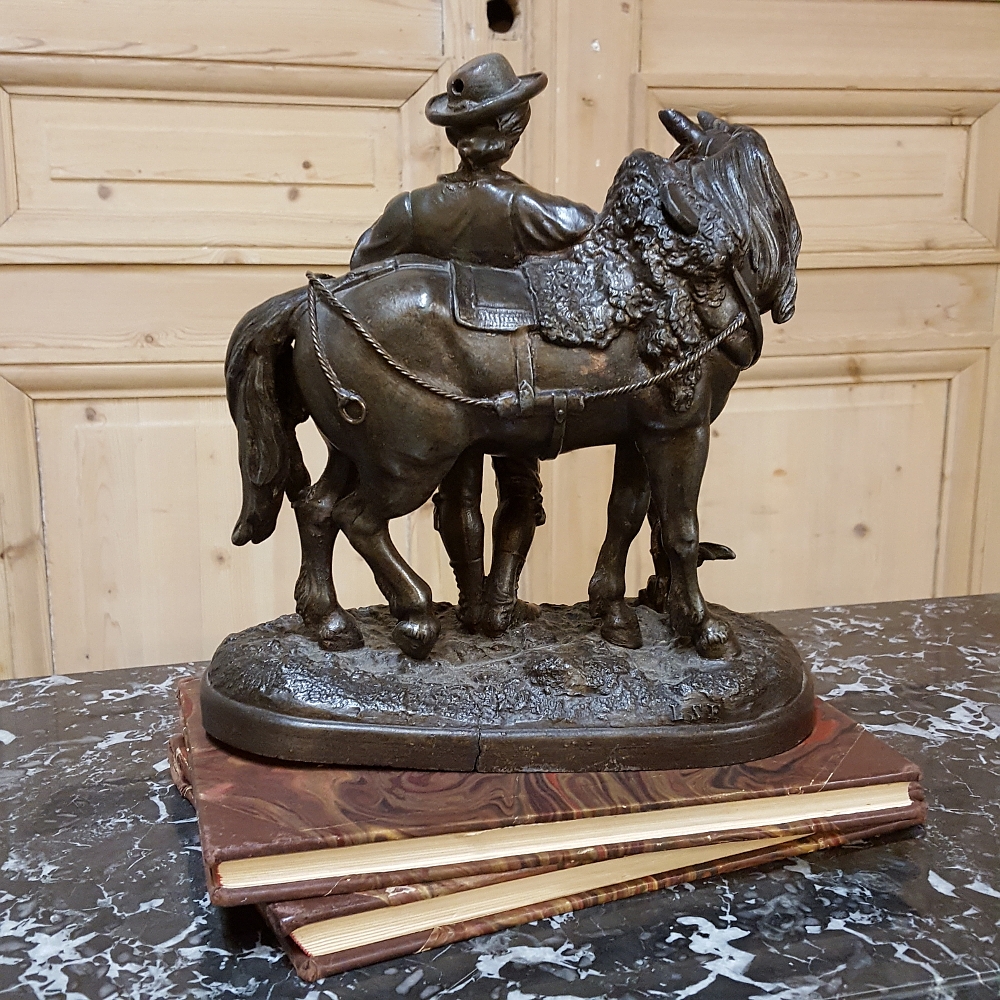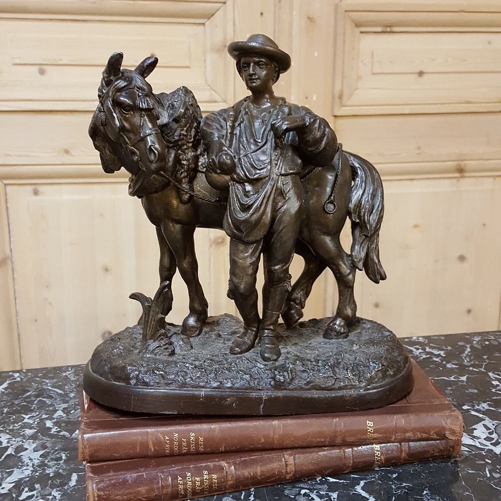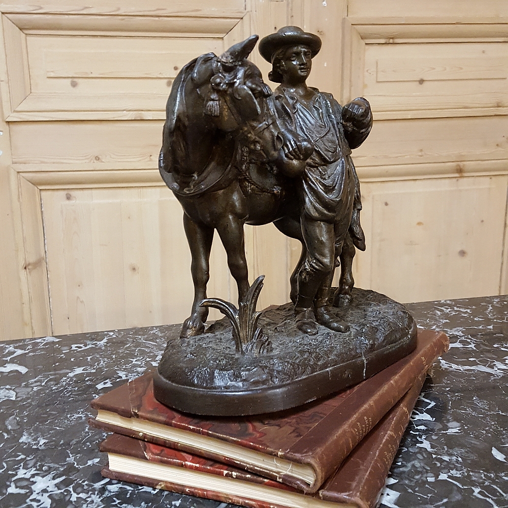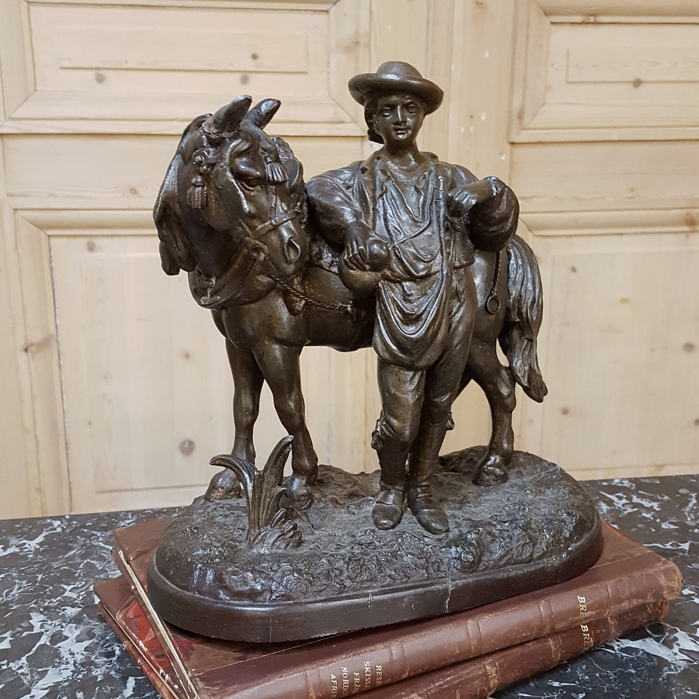 SaleThis charming 19th Century Country French Spelter Statue of Horse & Rider has been given a patinaed bronze finish, and depicts a country lad with his faithful steed.