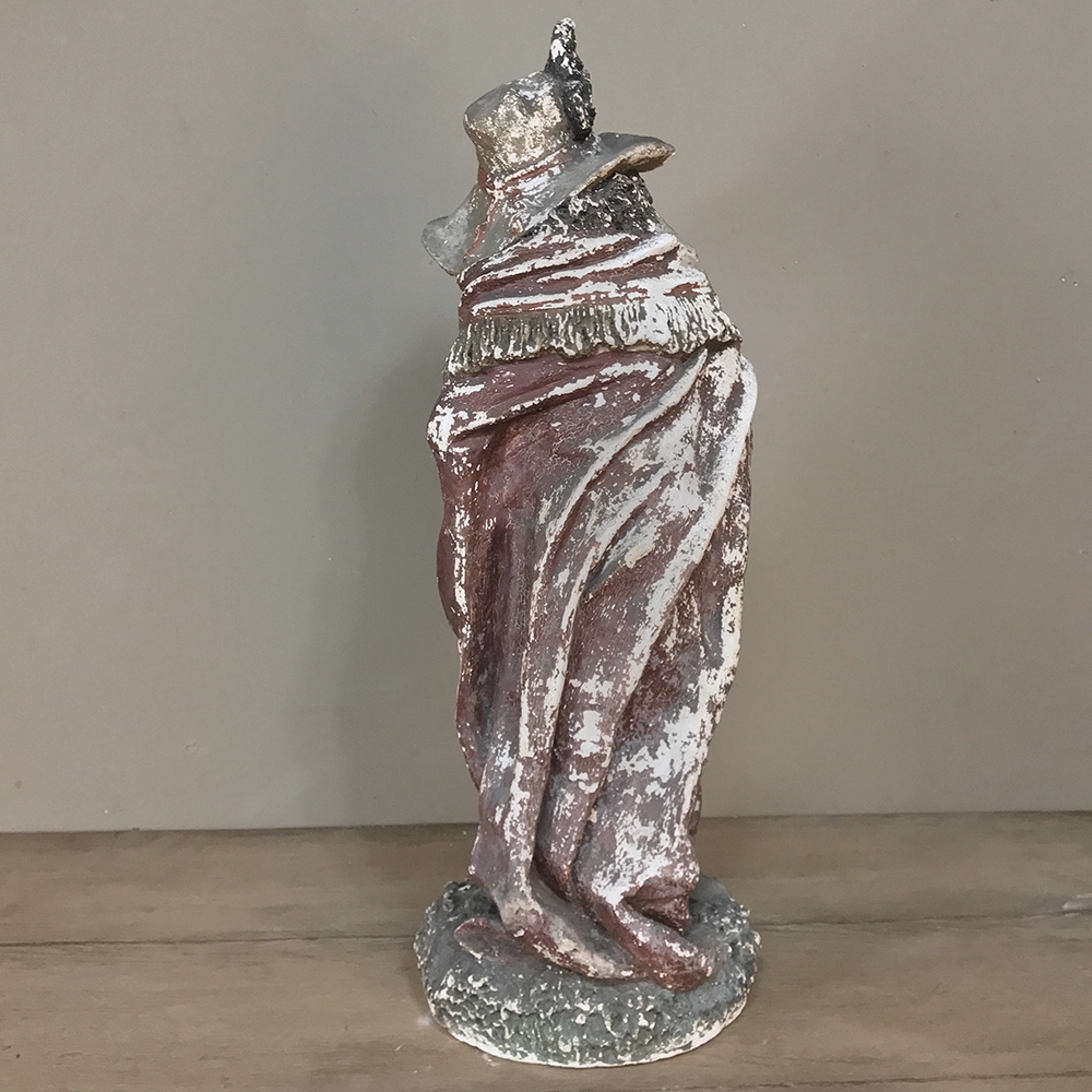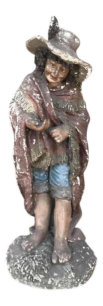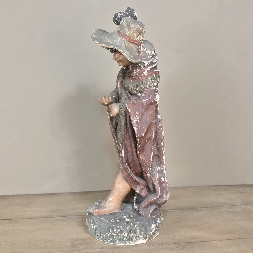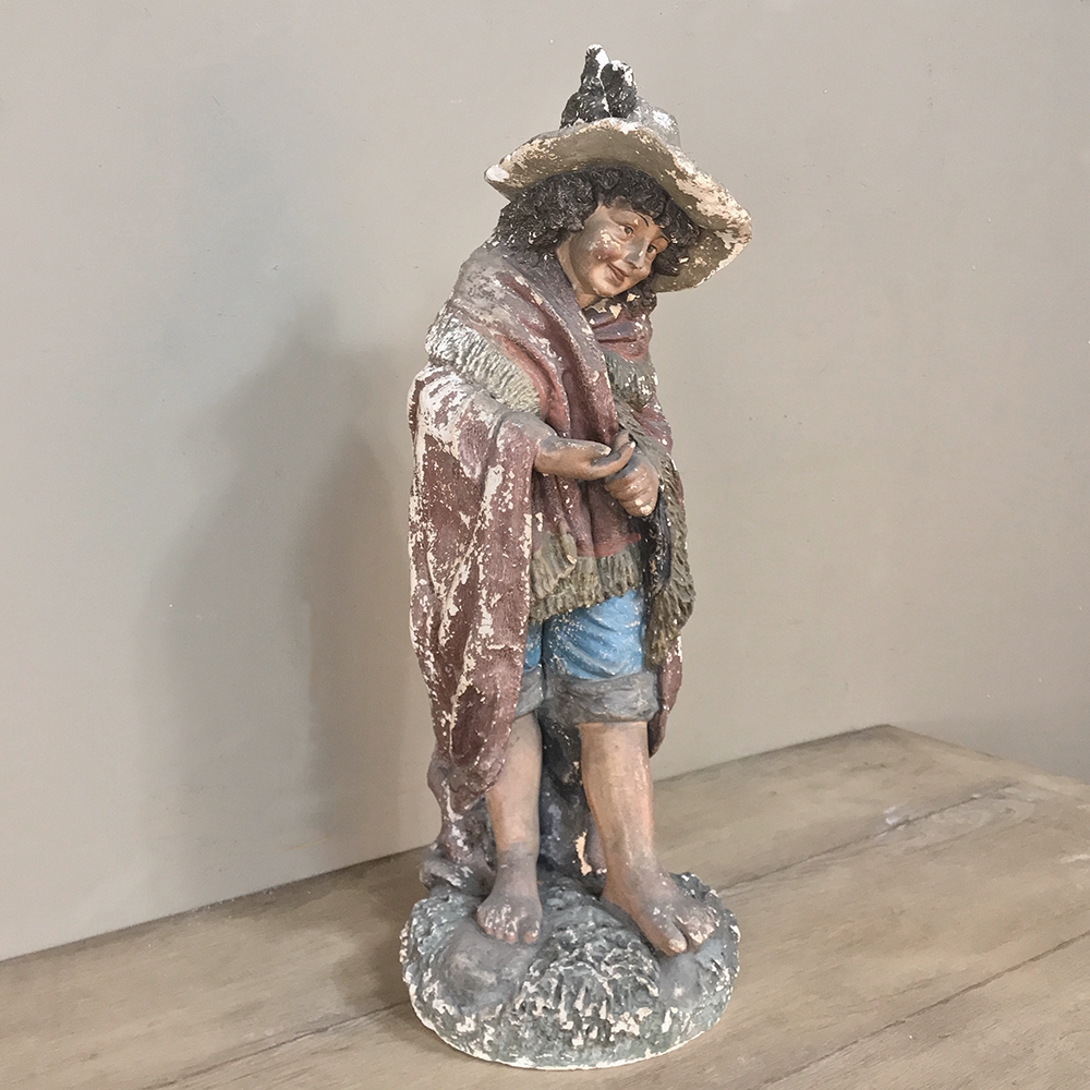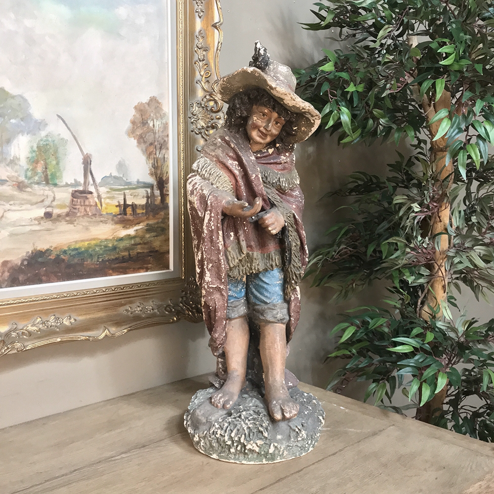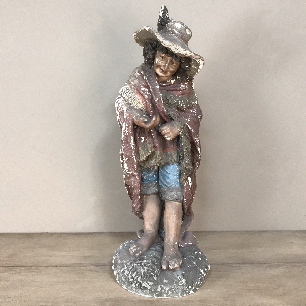 Terra Cotta Painted Statue is a whimsical depiction of a well-dressed young lad who is obviously amused. The method used to embellish it was "chalk painting", performed by hand and resulting in a splendid finish effect.