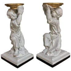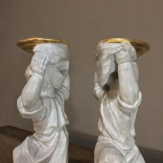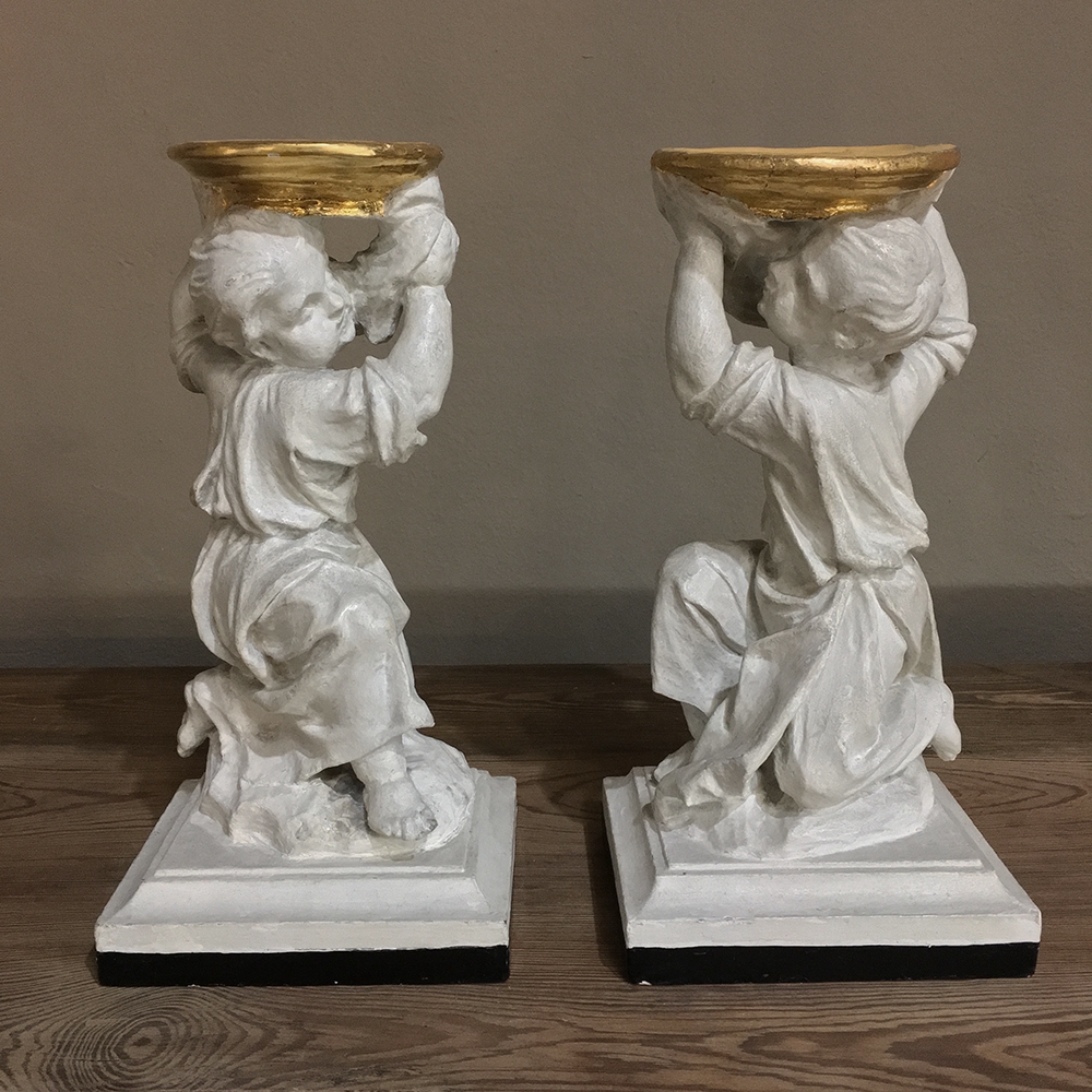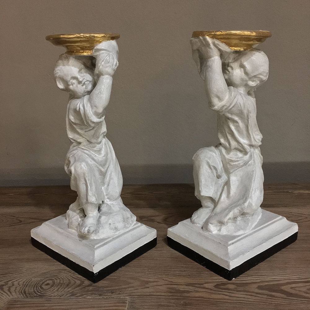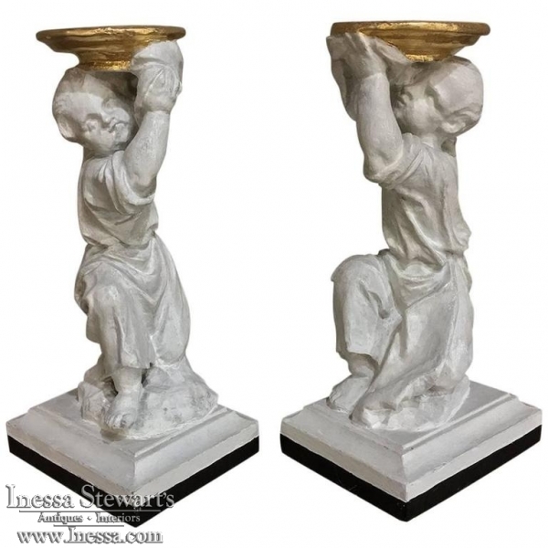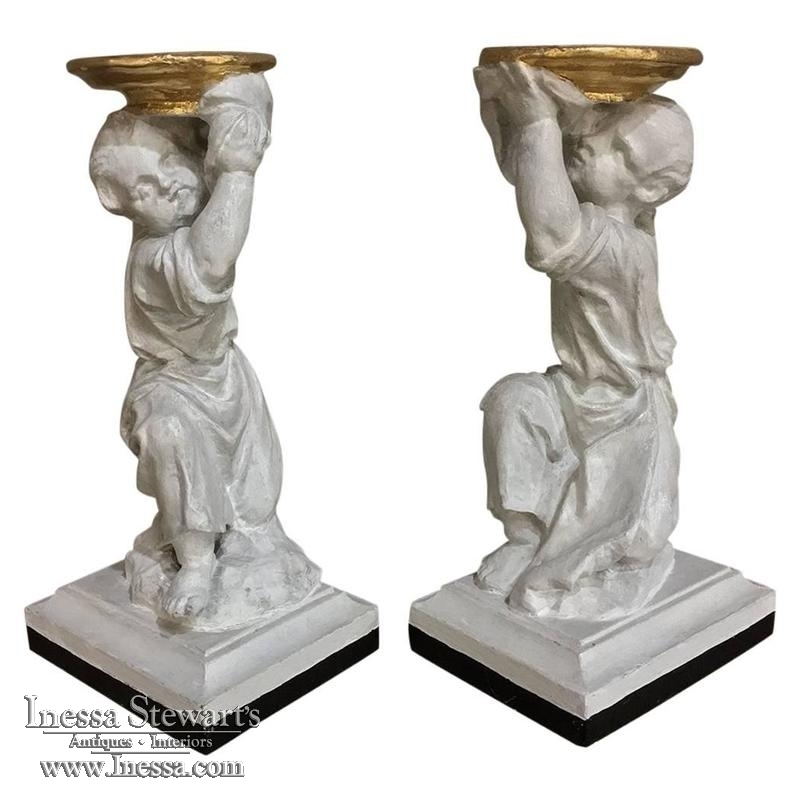 SalePair 19th Century Italian Painted Statues of Cherubs feature a mirrored image effect, with the cherubs depicted in a kneeling stance holding up a golden bowl. The painted finish on carved wood has achieved a lovely distressed patina over the decades that will add an Old World charm to any room, as well as an attractive symmetrical accent! The pair also works great as pedestals for pillar candles, rose bowls, or other such decorative items.