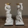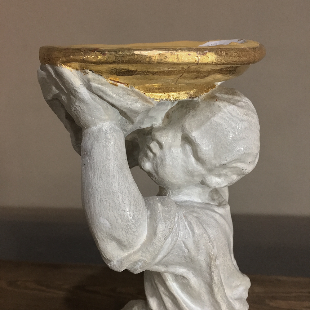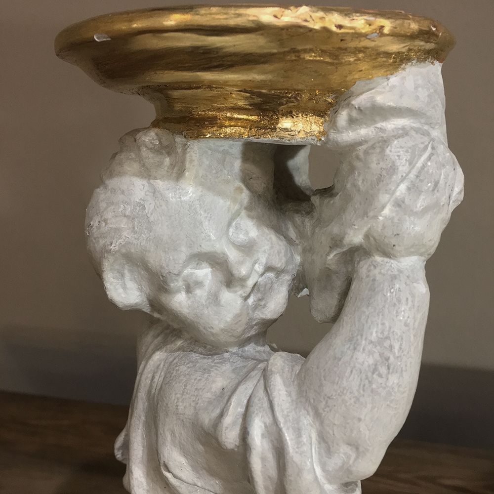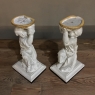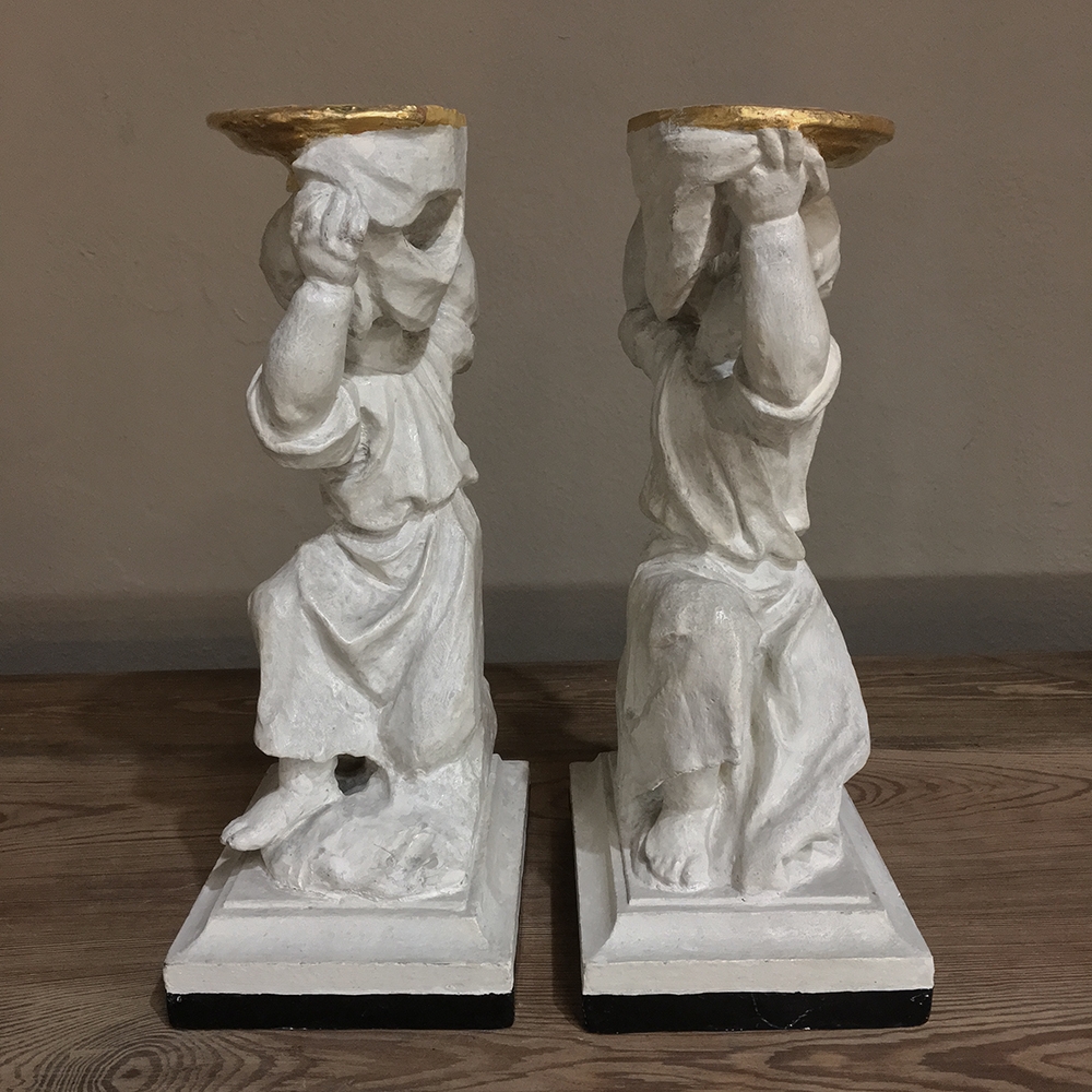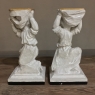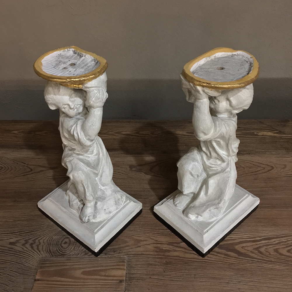 SalePair 19th Century Italian Painted Statues of Cherubs feature a mirrored image effect, with the cherubs depicted in a kneeling stance holding up a golden bowl. The painted finish on carved wood has achieved a lovely distressed patina over the decades that will add an Old World charm to any room, as well as an attractive symmetrical accent! The pair also works great as pedestals for pillar candles, rose bowls, or other such decorative items.