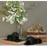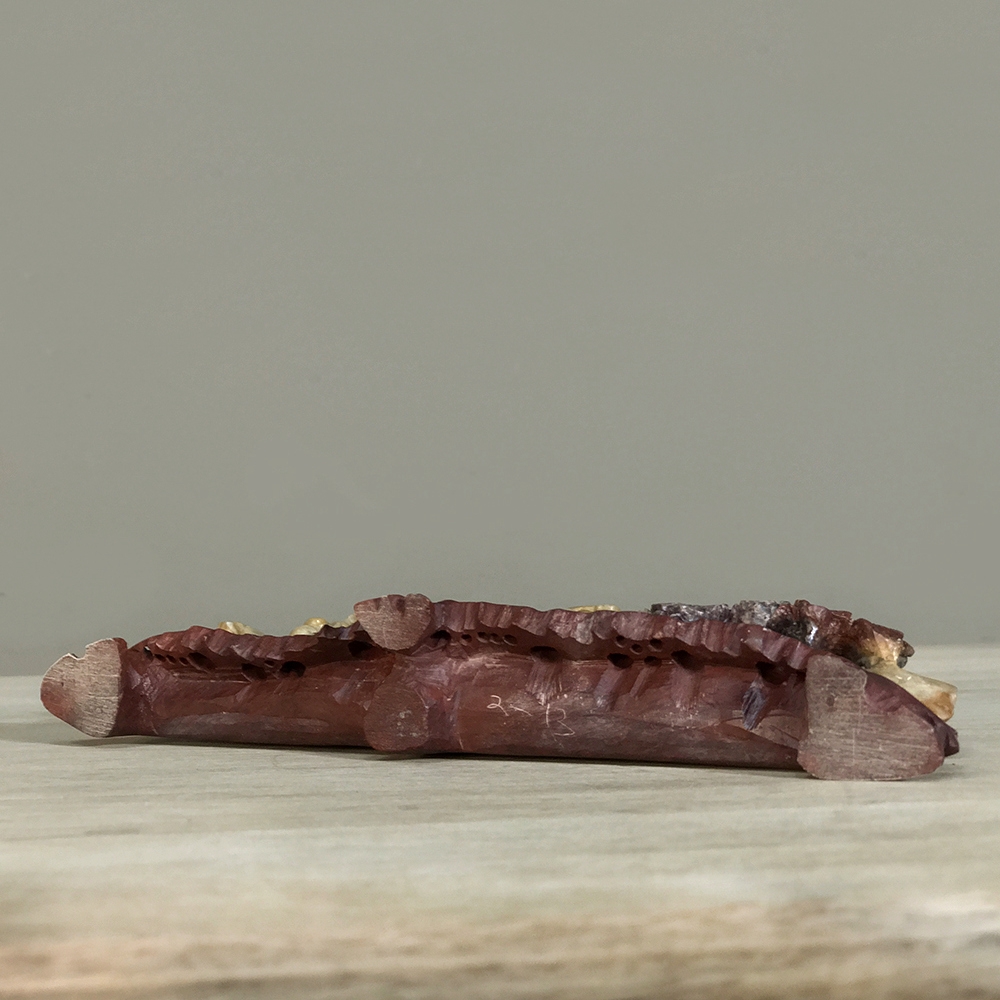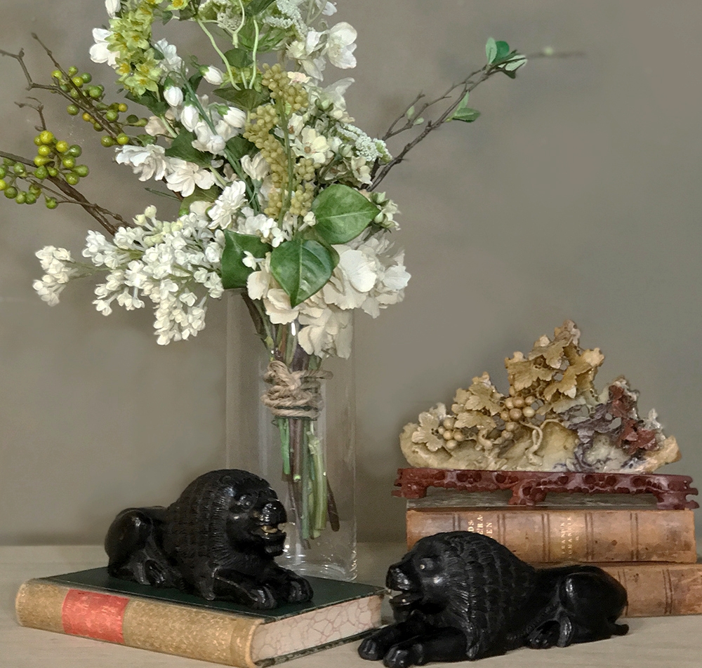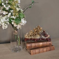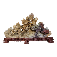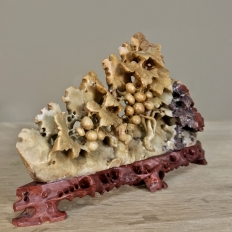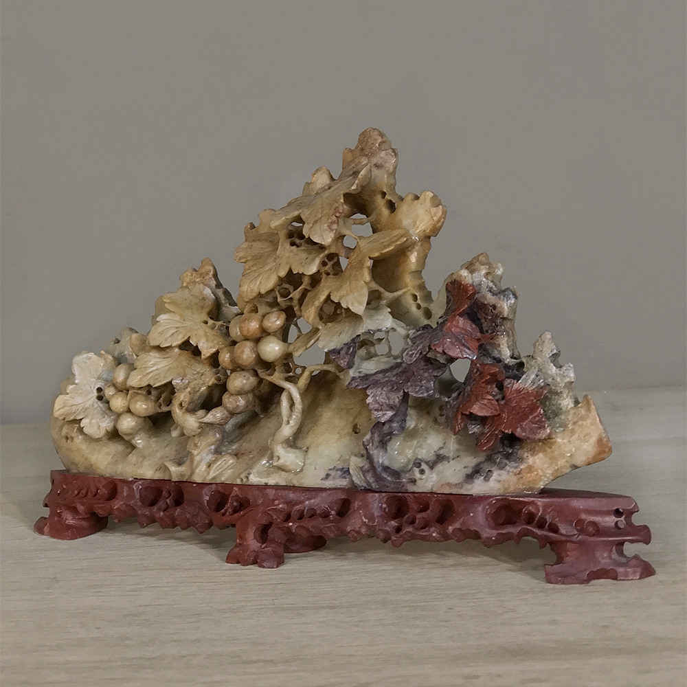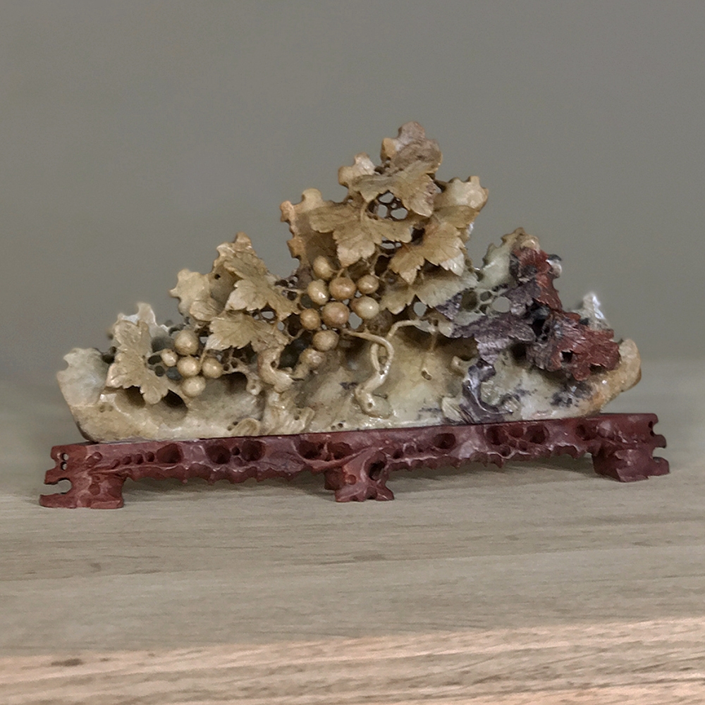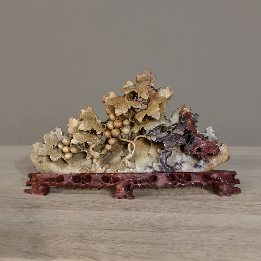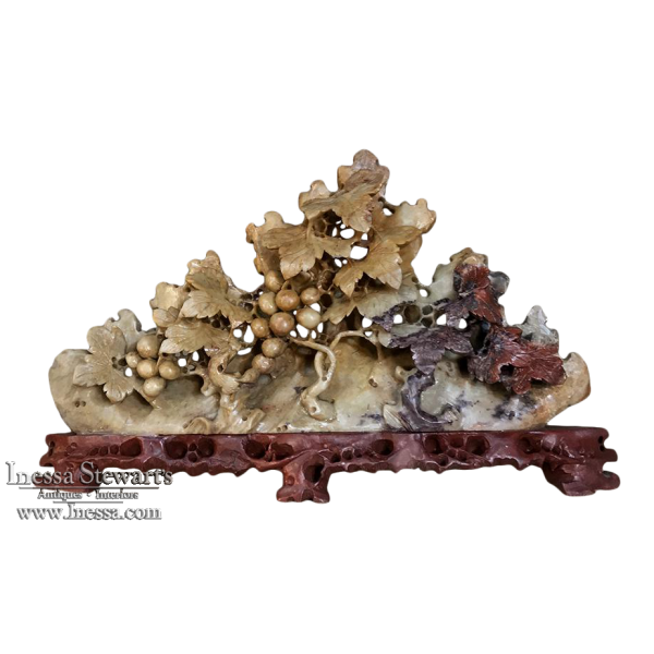 Vintage Hand-Carved Jade Stone Statue was cleverly sculpted to depict fully laden grapevines, combined with a naturally colored rouge segment below creating the illusion of a gnarly grapevine root. The variation in colors of the natural stone lend astonishing visual interest to the sculpture, showcasing the artist's deft hand with his implements in creating a wonderful three-dimensional work.