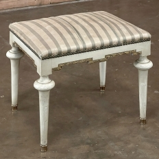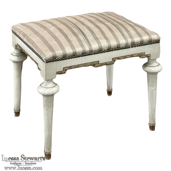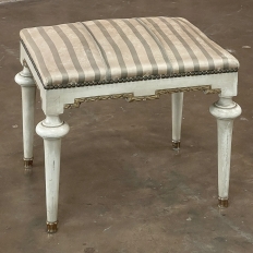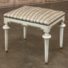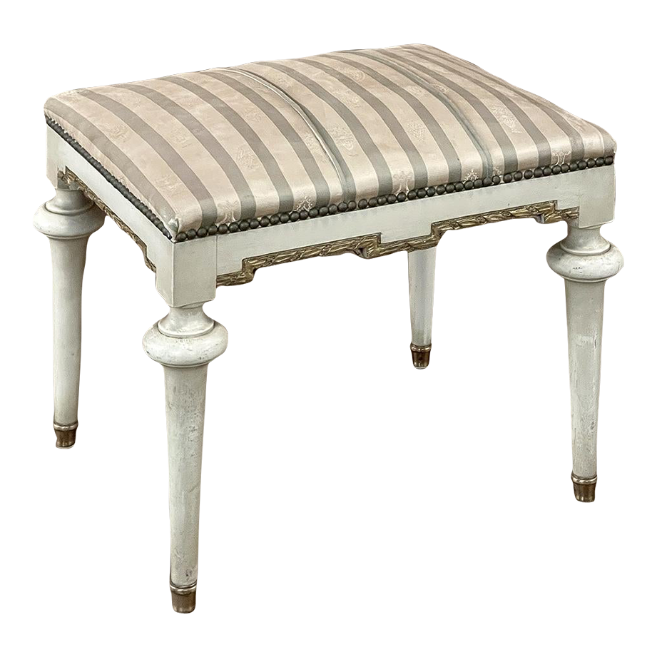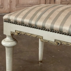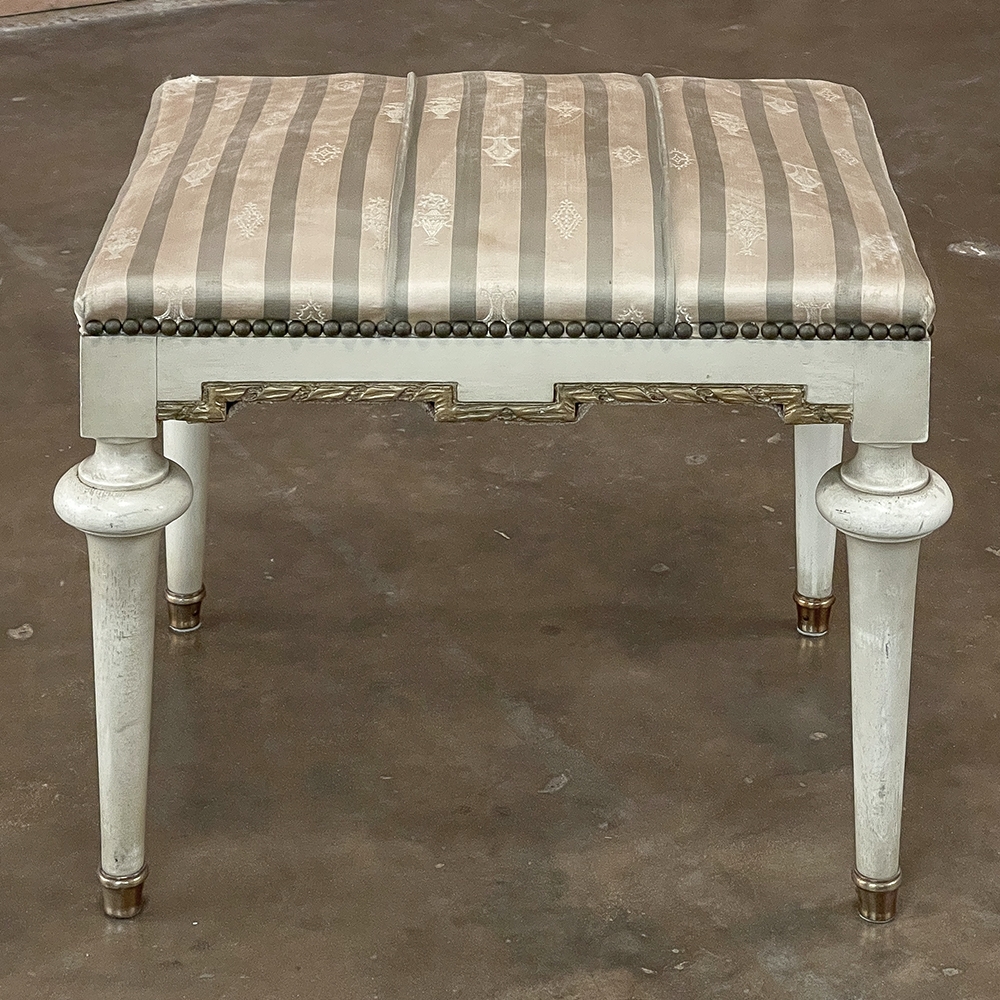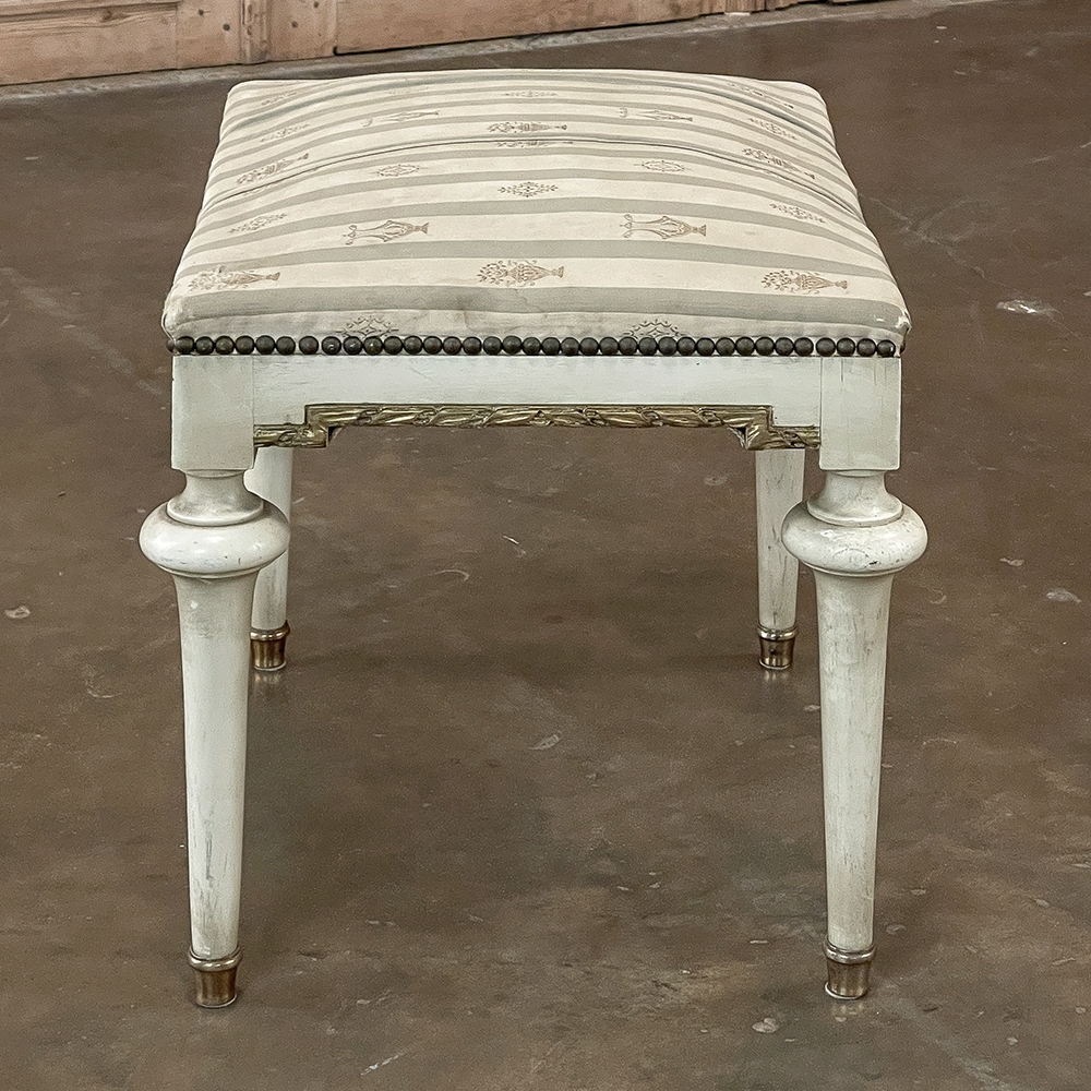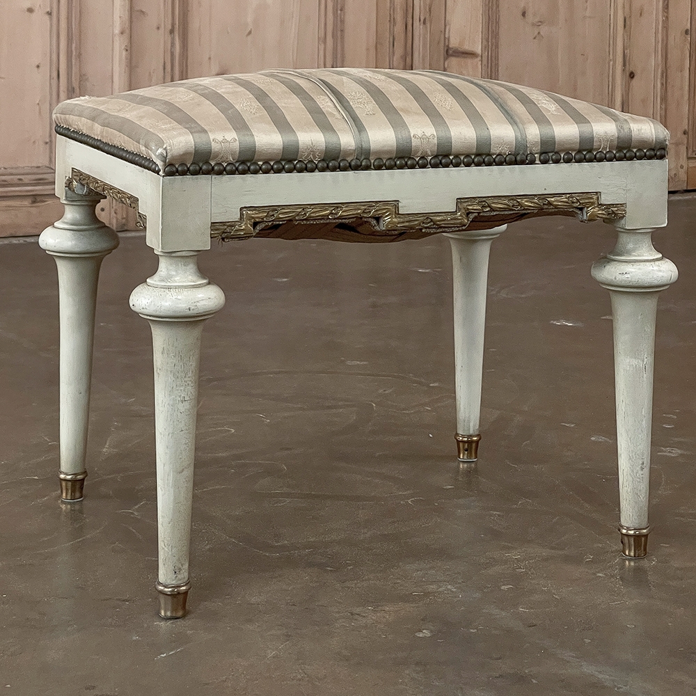 19th Century French Louis XVI Painted Footstool ~ Vanity Bench represents a tailored expression of the neoclassical revival that for all practical purposes never really ended! Hand-crafted from seasoned fruitwood, it features four tailored, tapered legs with a bun form towards the top just before they join to the apron. The apron is of a Greek form, with angular features embellished by carved laurel wreath motif highlighted in gold. Gold trim on the legs and brass foot tips add a nice touch. The painted finish has achieved a lovely patina over the decades. Upholstered in silk, it is ready to reupholster in your coordinating fabric.