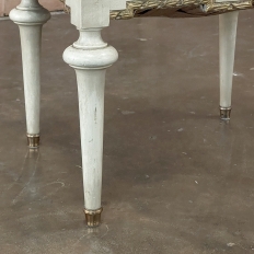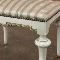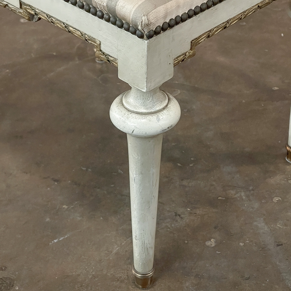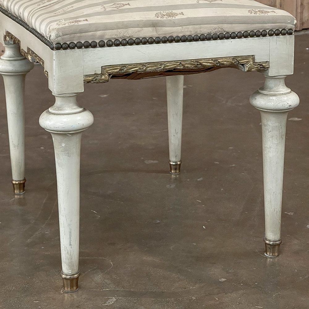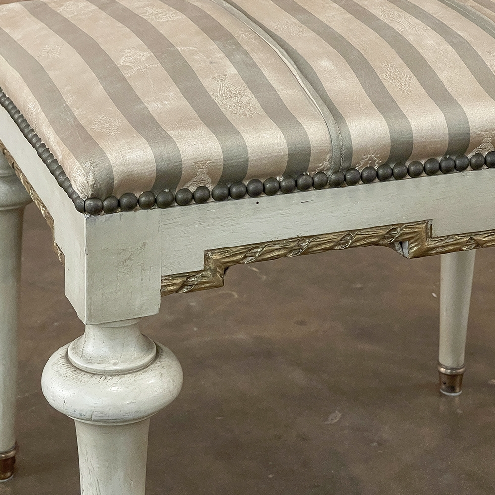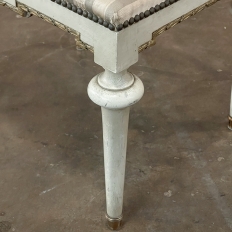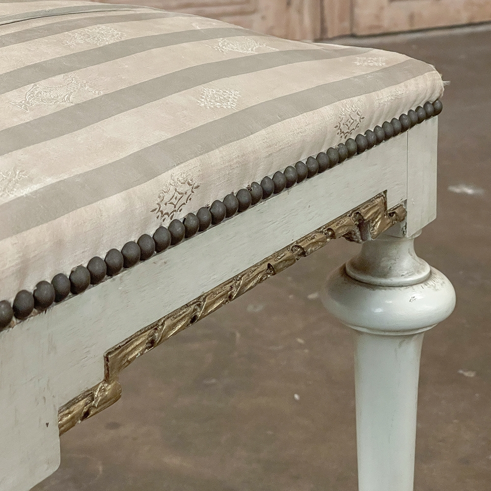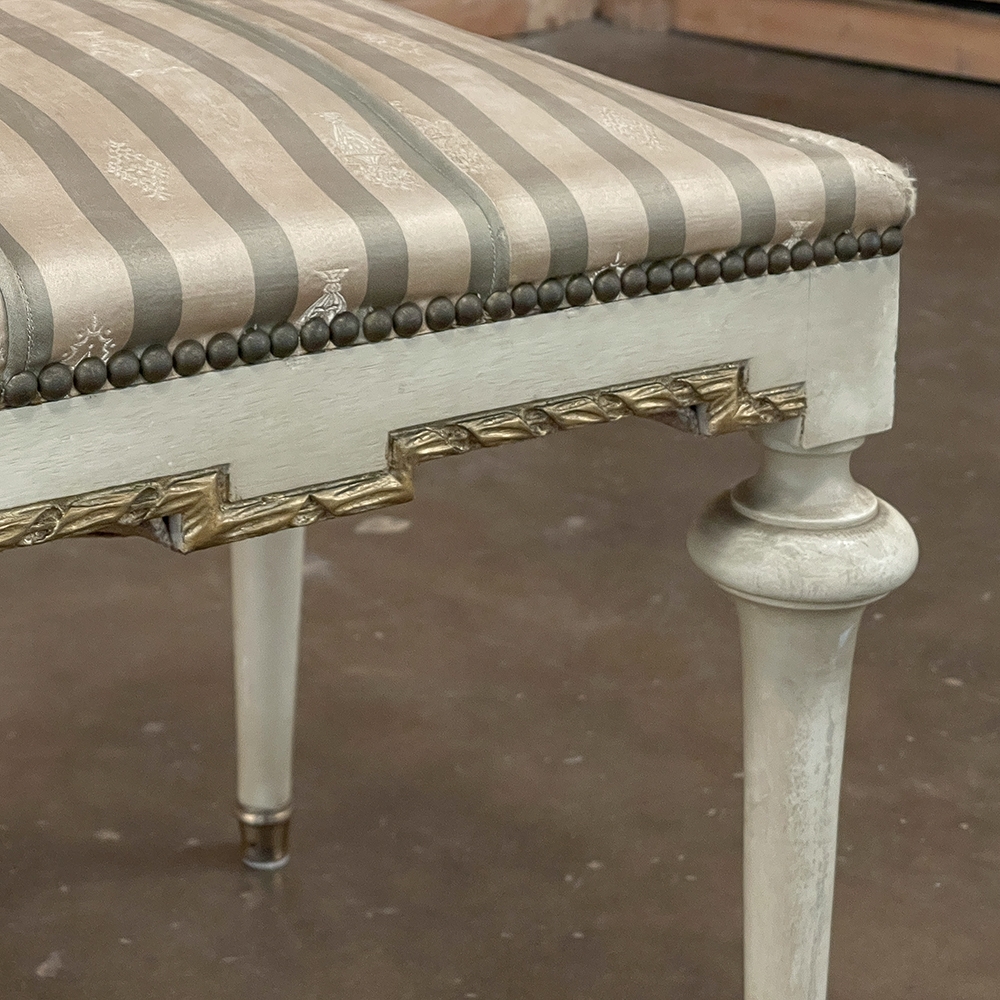 19th Century French Louis XVI Painted Footstool ~ Vanity Bench represents a tailored expression of the neoclassical revival that for all practical purposes never really ended! Hand-crafted from seasoned fruitwood, it features four tailored, tapered legs with a bun form towards the top just before they join to the apron. The apron is of a Greek form, with angular features embellished by carved laurel wreath motif highlighted in gold. Gold trim on the legs and brass foot tips add a nice touch. The painted finish has achieved a lovely patina over the decades. Upholstered in silk, it is ready to reupholster in your coordinating fabric.