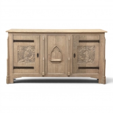 A handsome Gothic Revival buffet in stripped oak, with the clean architectural lines and carved detail that make this style so appealing. The pale oak finish gives the piece a fresh, natural look while still allowing the grain and quiet age of the wood to show through. Across the front, the carved panels bring depth and character, with grape and vine...