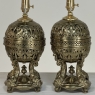 Pair 19th Century Bronze French Napoleon III Period Oil Lanterns converted to Table Lamps will make the perfect finishing touch to any room!  Nothing adds ambiance like antique lighting, and this pair are exceptional.  Cast in bronze, the design features an orb form hollow on the inside to enhance the intricate detailing that encompasses the entire sphere, including stylized fleurs de lys with foliates, a colonnade design, and drapery swags with fruit representing the bounty of the earth.  Each orb is held aloft by four dolphins bearing anthropomorphic faces which in turn rest on a footed base centered with a finial.
