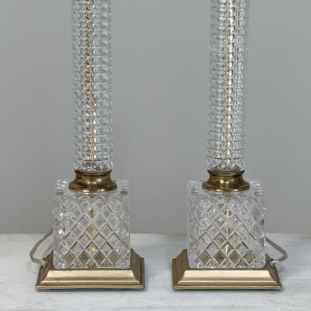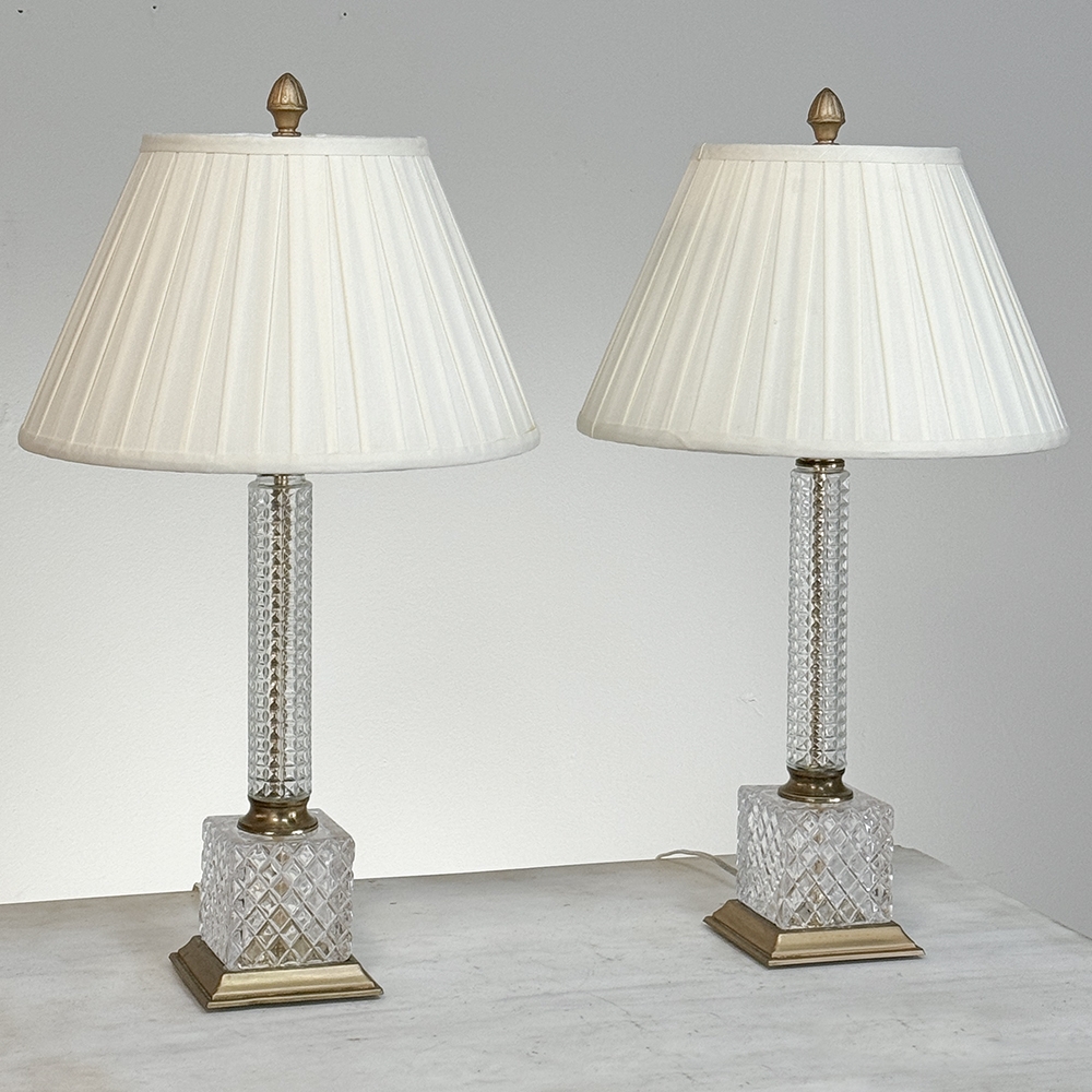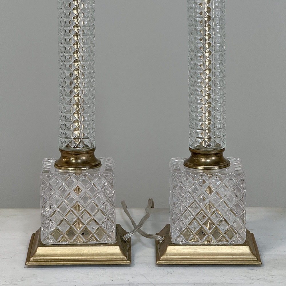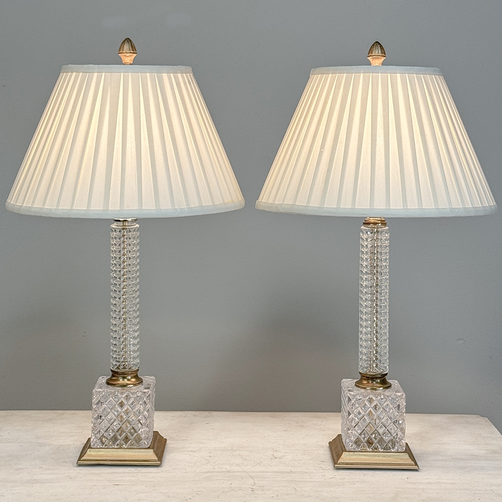 Pair Mid-Century Neoclassical Cut Crystal & Brass Table Lamps feature a design influenced by neoclassical architecture, yet rendered with a modern flair. The diamond patterns of the design provide an opulent look, with a round cylindrical shaft set upon a cubic base, separated by a brass ring. Brass base molding flares out for extra support and style. Pleated silk shades are new, as well as the standard electrical wiring, making the pair ready to use and enjoy for decades to come! Includes hand-sewn silk shades as shown.