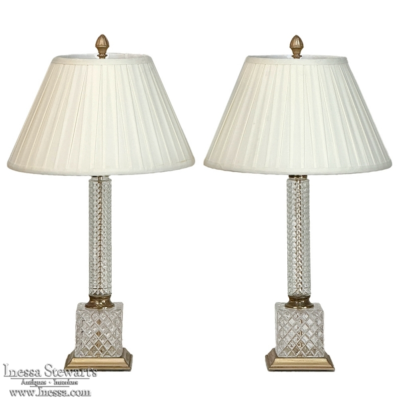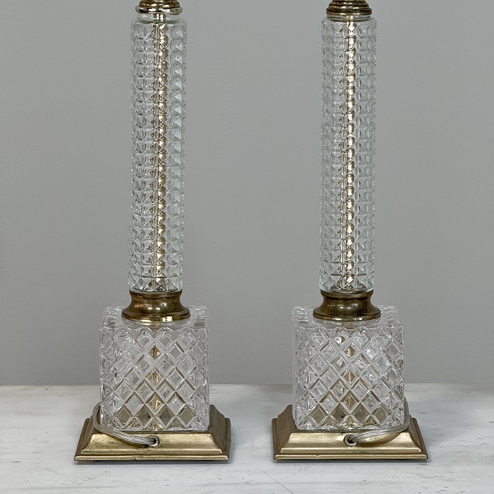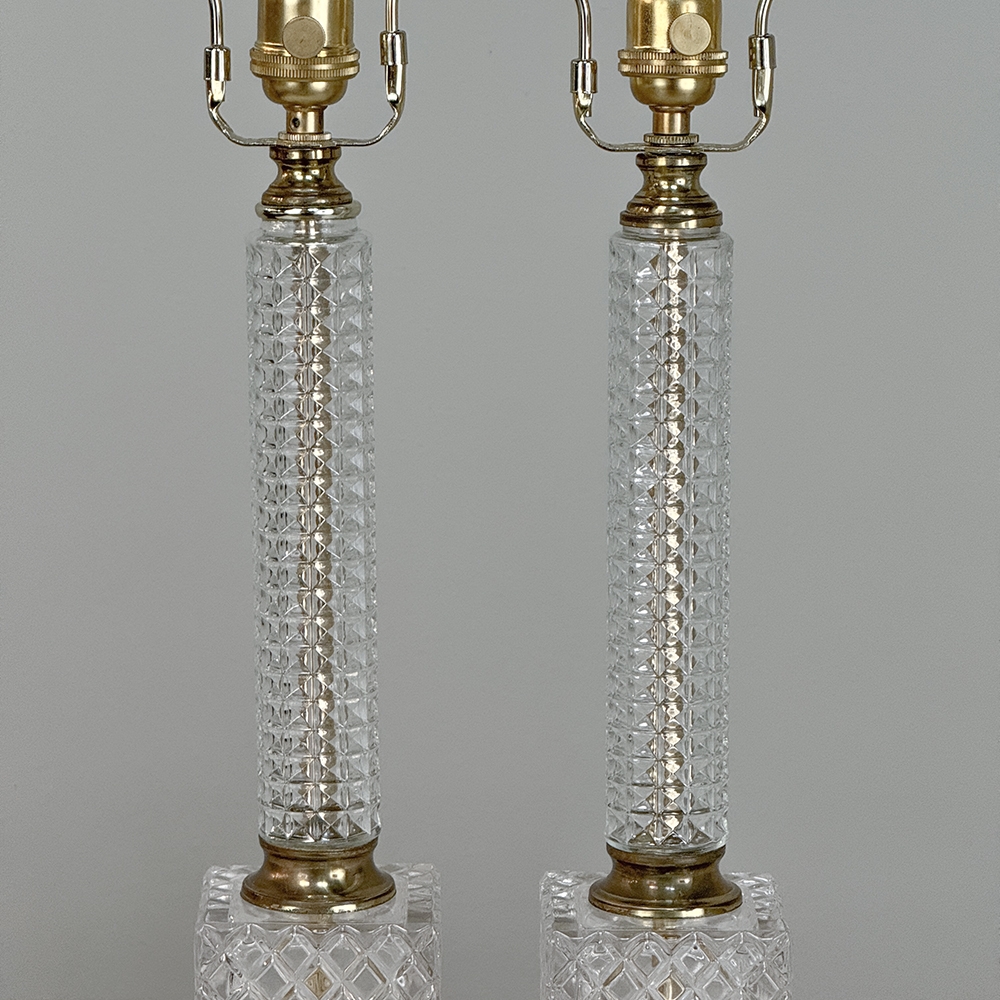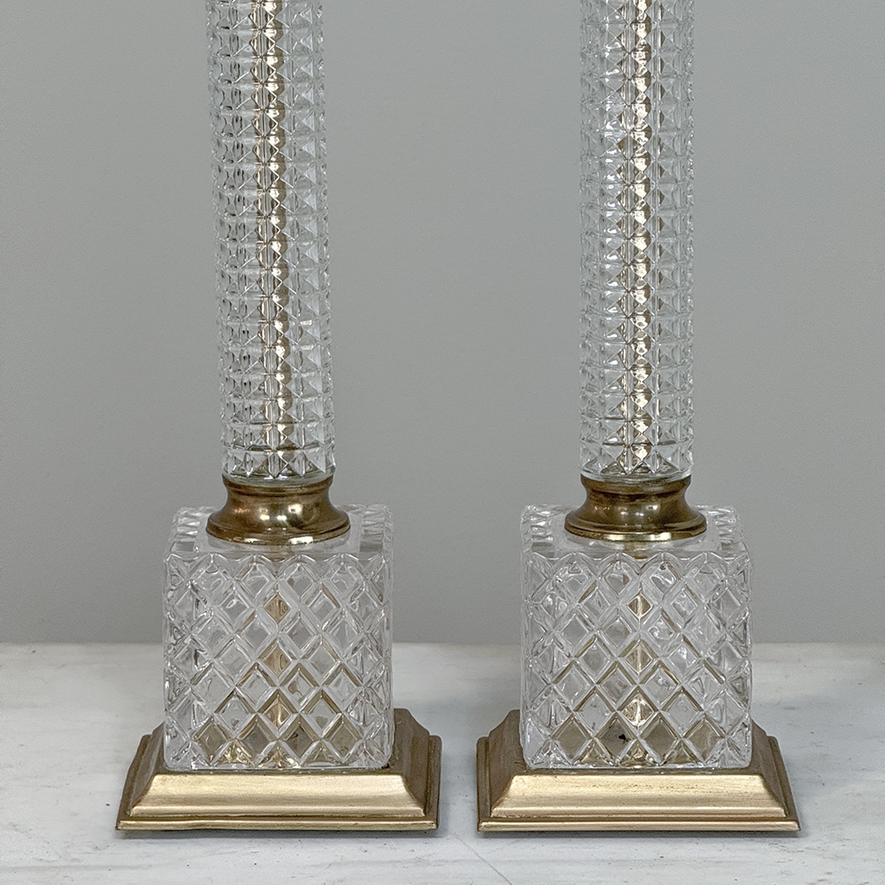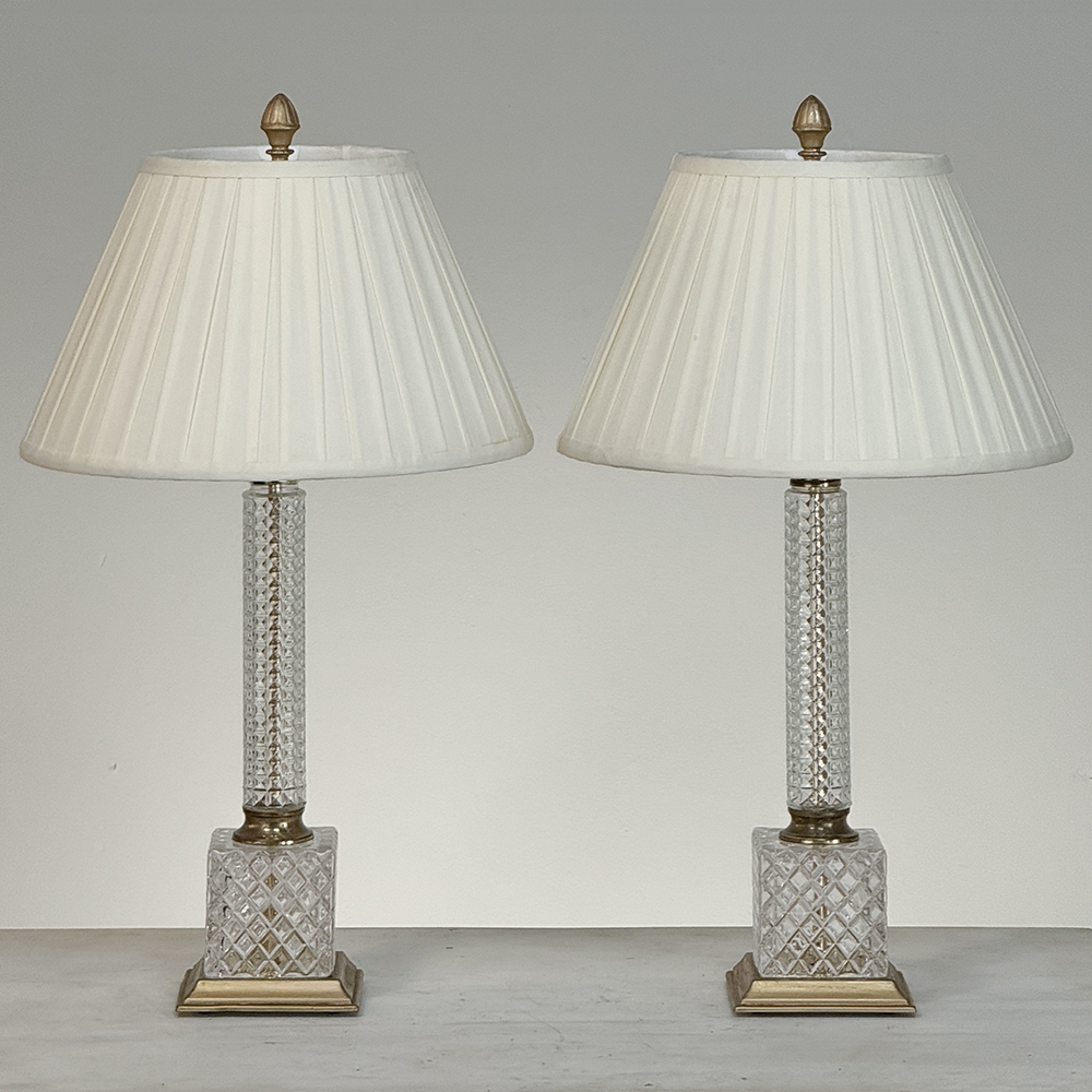 Pair Mid-Century Neoclassical Cut Crystal & Brass Table Lamps feature a design influenced by neoclassical architecture, yet rendered with a modern flair. The diamond patterns of the design provide an opulent look, with a round cylindrical shaft set upon a cubic base, separated by a brass ring. Brass base molding flares out for extra support and style. Pleated silk shades are new, as well as the standard electrical wiring, making the pair ready to use and enjoy for decades to come! Includes hand-sewn silk shades as shown.