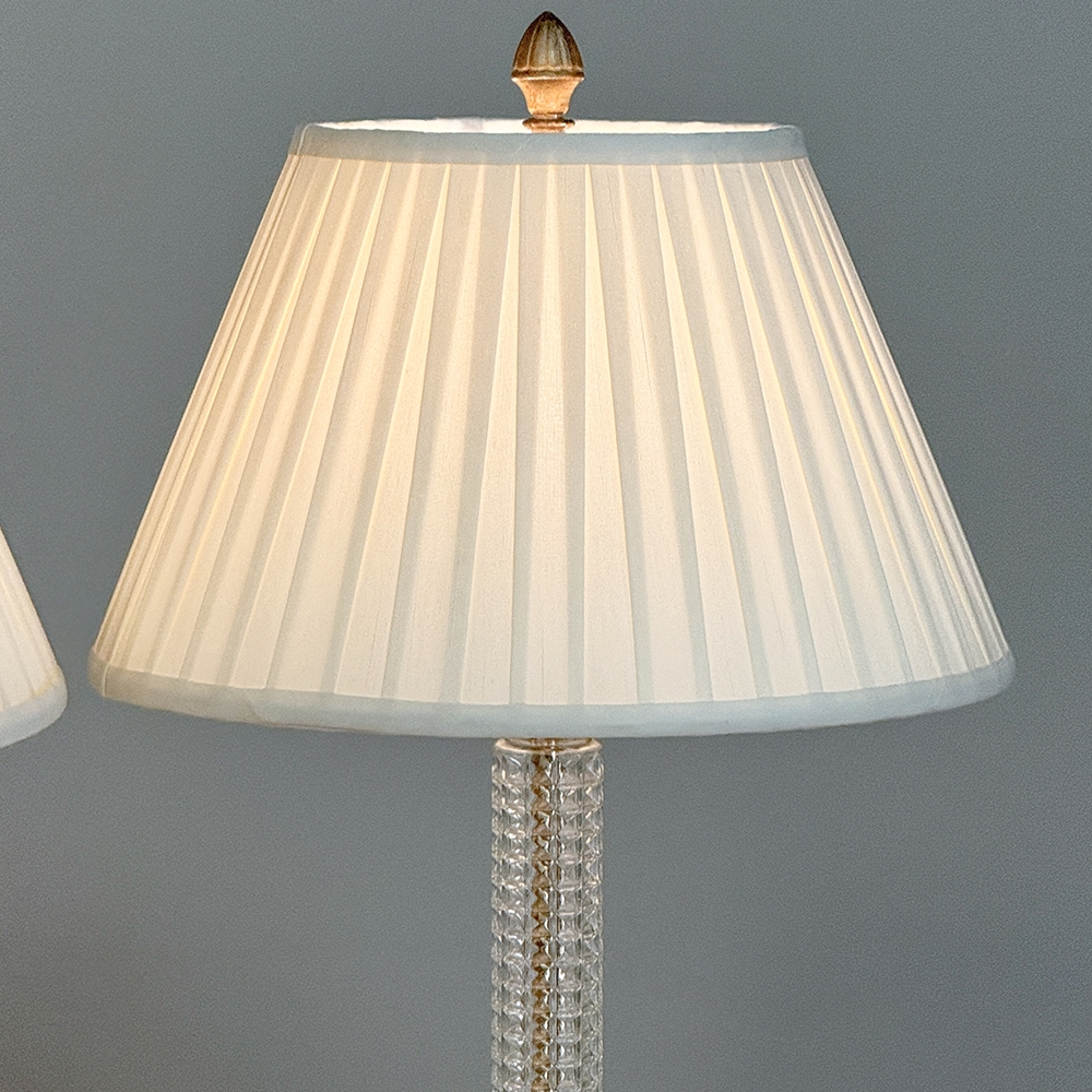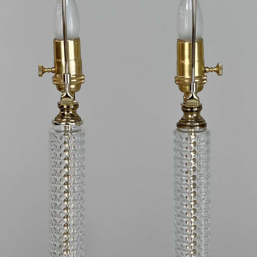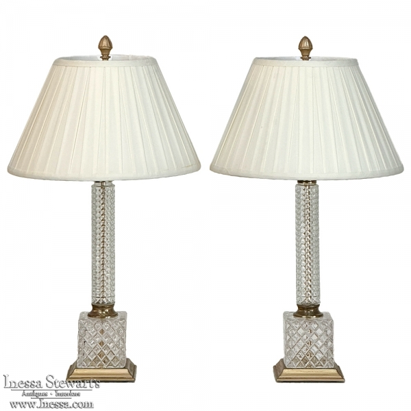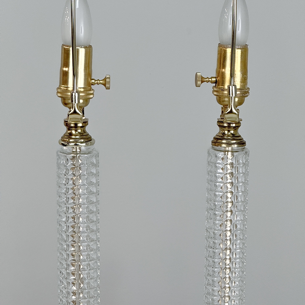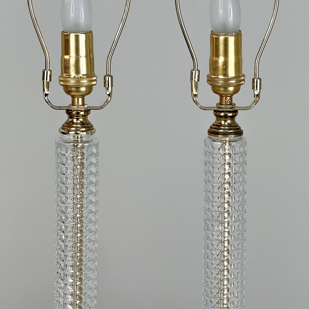 Pair Mid-Century Neoclassical Cut Crystal & Brass Table Lamps feature a design influenced by neoclassical architecture, yet rendered with a modern flair. The diamond patterns of the design provide an opulent look, with a round cylindrical shaft set upon a cubic base, separated by a brass ring. Brass base molding flares out for extra support and style. Pleated silk shades are new, as well as the standard electrical wiring, making the pair ready to use and enjoy for decades to come! Includes hand-sewn silk shades as shown.