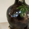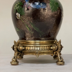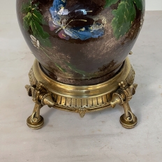 Pair Napoleon III Period Glazed Faience Table Lamps with Bronze Bases will make a timeless style addition to any room, enhanced by the craftsmanship and quality of a bygone era! Two earthenware urns were hand-painted so they're a pair, but each is its own individual work. The jewel tones of the flowers and foliate designs appear on the almost black background as a more unusual combination for such a pair. Each has been mounted onto a circular bronze base with fine molded detail as well as four dramatically styled feet, with a pine cone motif halfway between each foot for an added delightful touch. Fitted with new harps and silk shades, each has been newly electrified by an expert electrician for the perfect combination of antique art and modern convenience!