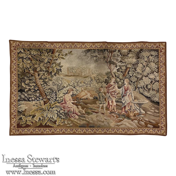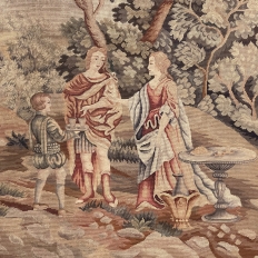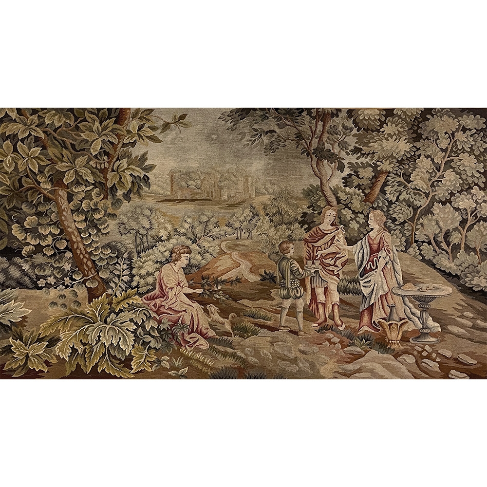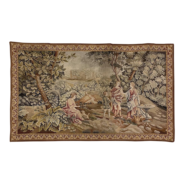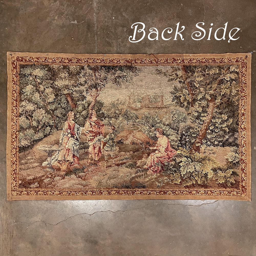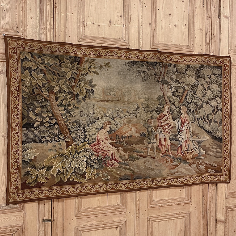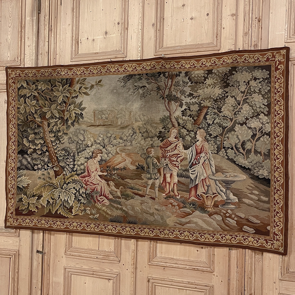 Sale19th Century Flemish Hand-Knotted Romantic Tapestry depicts an affluent family on an outing to the grounds of their estate, with the manoir visible in the distance. Lush greenery including a tree canopy that envelopes the scene is a sign of fertile grounds. A footpath leads the way back to the manoir. Three are engaged in conversation, with the fourth playing with a young pup in the foreground. The bordering is intact and surrounds the artwork with a repeating stylized foliate pattern. Note the hand work visible in the last shot of the back side. Tapestries were developed centuries ago to adorn walls of stone castles and helped keep away cold drafts during the long winter nights. Over time they became an art form unto themselves, and developed in several European countries most notably what is today Belgium and France. This work was inspired by the Flemish school.