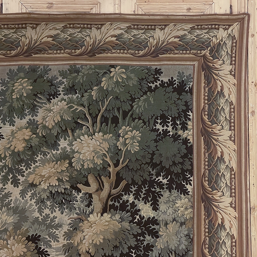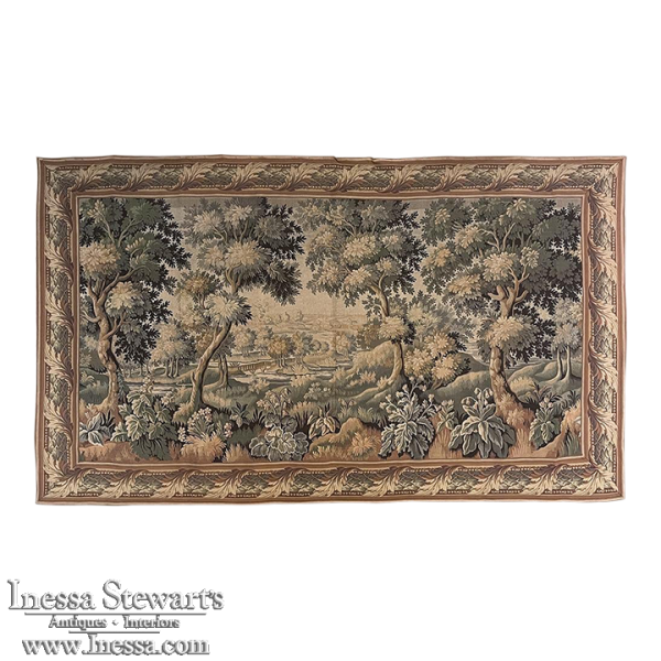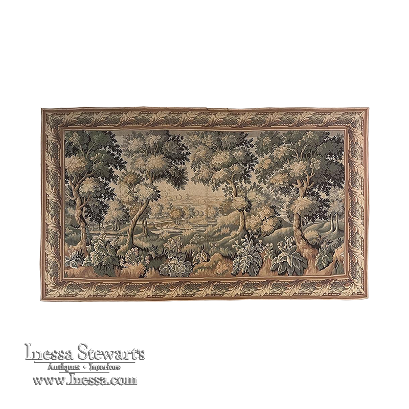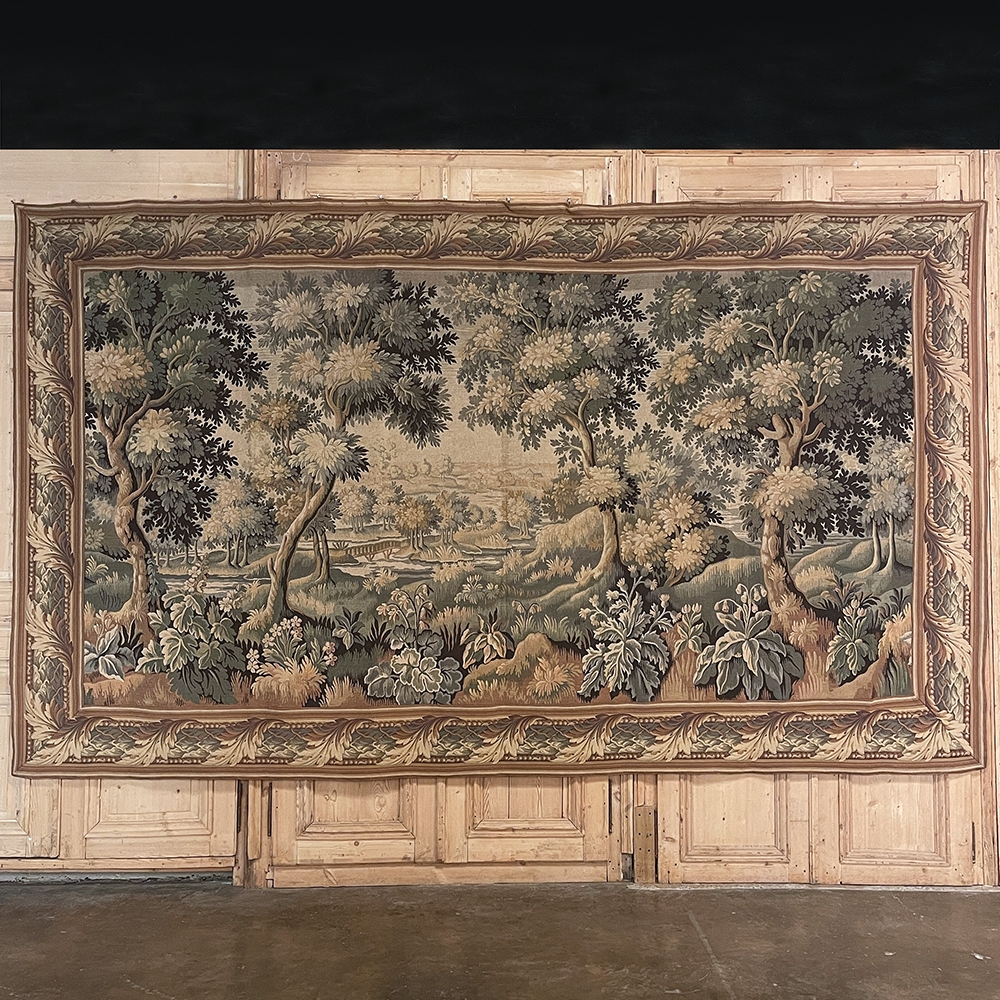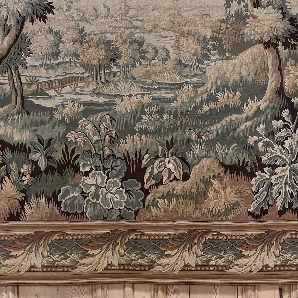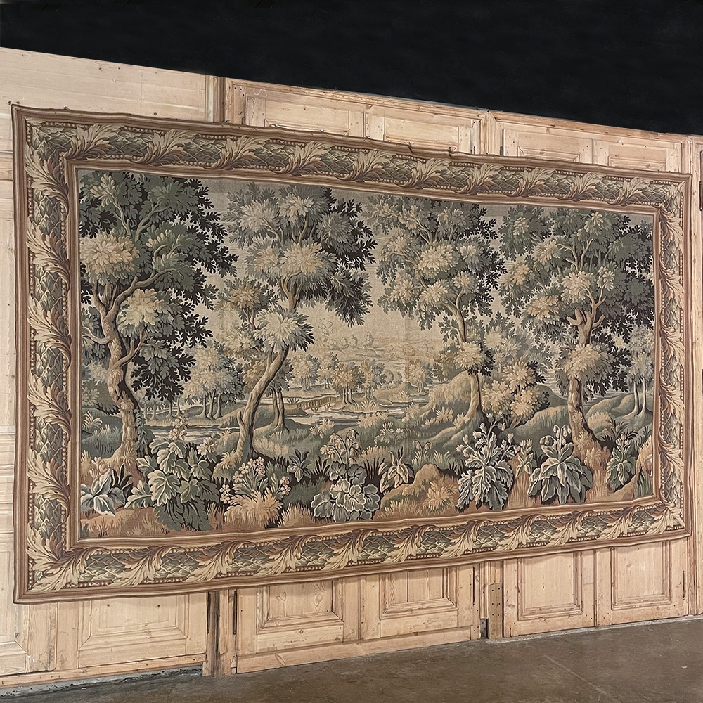 Grand Antique French Tapestry by Gobelins of Paris is a stunning panoramic landscape scene depicting a lush wooded area on the outskirts of a rural village. Crafted on a large scale, it spans almost seven and a half feet tall by almost thirteen feet wide! Styled after the storied Oudenaarde tapestries produced by the Flemish in past centuries, it reveals the level of sophistication that the French achieved using more modern looming methods. Note the exquisite border intact all around that depicts laurel bundles encircled with acanthus leaves and framed by beading. The scene itself depicts a wide variety of flora, utilizing an amazing assemblage of different hues of earth tones creating a subtle, relaxing effect. Little touches like a foot bridge over the water and a small cottage in the distance add a very subtle humanistic touch. Such idealistic renderings reached a new level of popularity during the Renaissance when the Gobelins first practiced their artistic craft. Louis XIV promoted the industry to the point it received worldwide acclaim. The French Ministry of Culture still maintains a tapestry factory in Paris near Les Gobelins métro station in the 13th arrondissement of Paris. It was originally established on the site as medieval dyeing business by the family Gobelin.