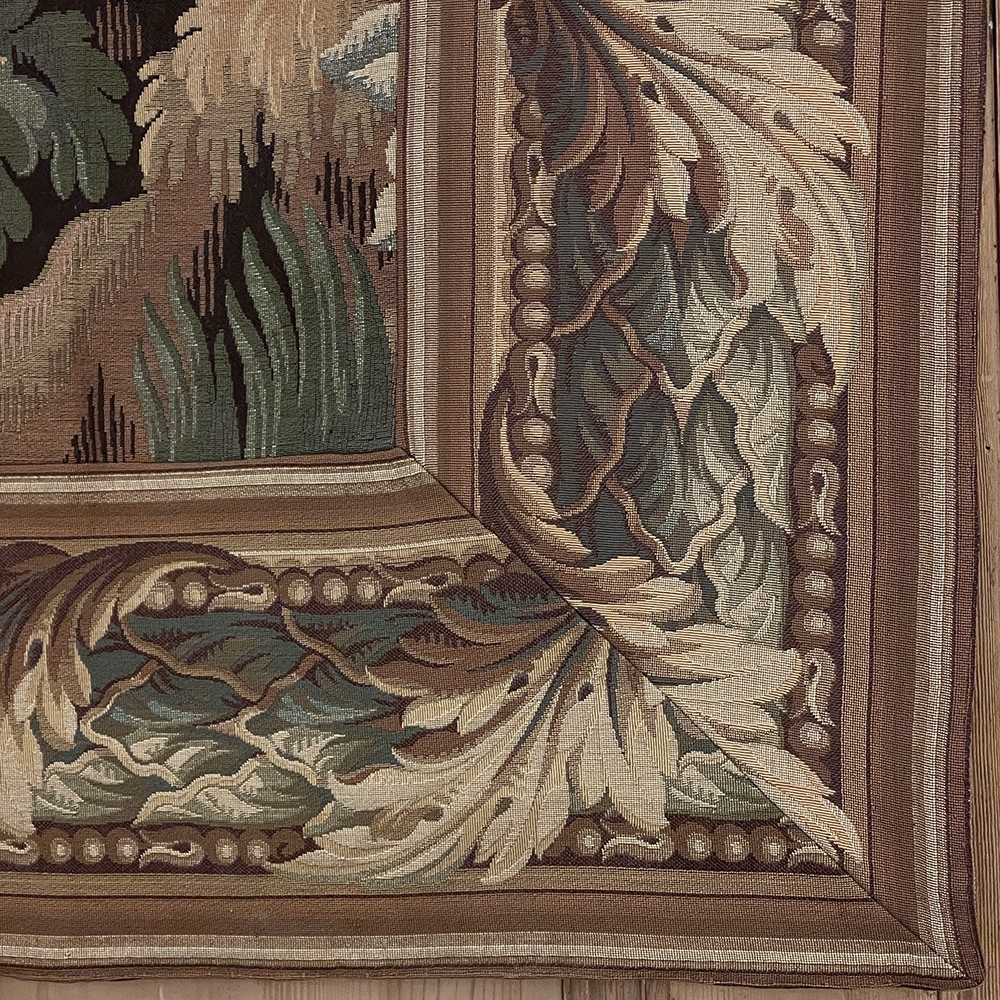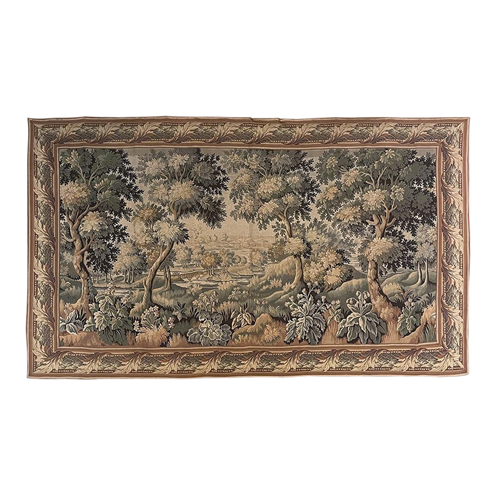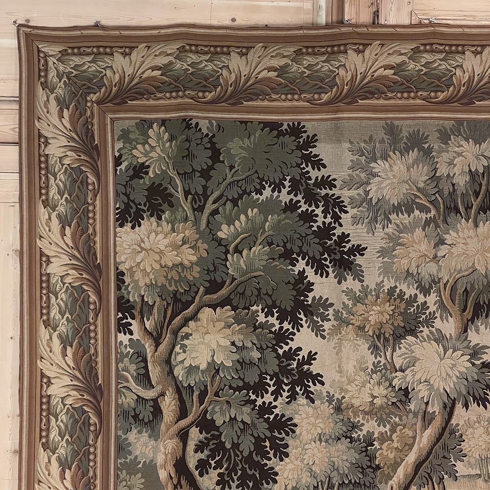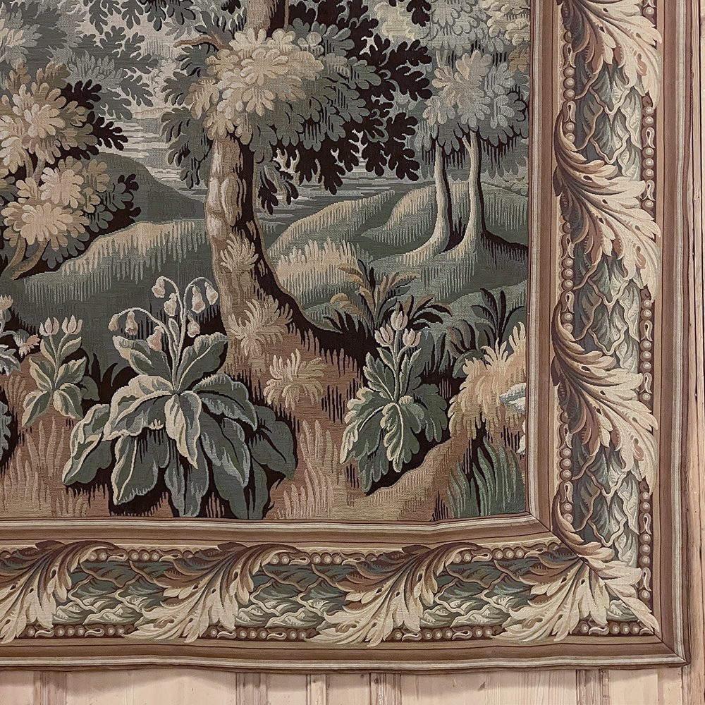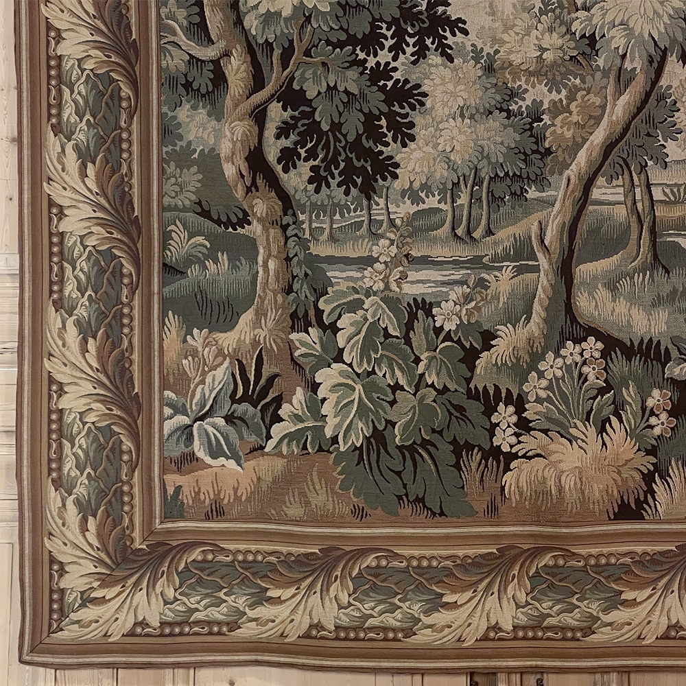Grand Antique French Tapestry by Gobelins of Paris is a stunning panoramic landscape scene depicting a lush wooded area on the outskirts of a rural village. Crafted on a large scale, it spans almost seven and a half feet tall by almost thirteen feet wide! Styled after the storied Oudenaarde tapestries produced by the Flemish in past centuries, it reveals the level of sophistication that the French achieved using more modern looming methods. Note the exquisite border intact all around that depicts laurel bundles encircled with acanthus leaves and framed by beading. The scene itself depicts a wide variety of flora, utilizing an amazing assemblage of different hues of earth tones creating a subtle, relaxing effect. Little touches like a foot bridge over the water and a small cottage in the distance add a very subtle humanistic touch. Such idealistic renderings reached a new level of popularity during the Renaissance when the Gobelins first practiced their artistic craft. Louis XIV promoted the industry to the point it received worldwide acclaim. The French Ministry of Culture still maintains a tapestry factory in Paris near Les Gobelins métro station in the 13th arrondissement of Paris. It was originally established on the site as medieval dyeing business by the family Gobelin.