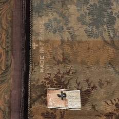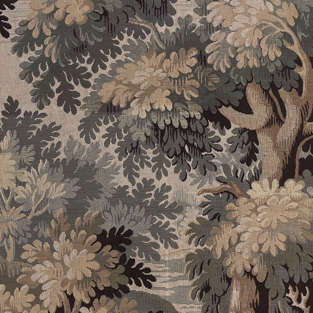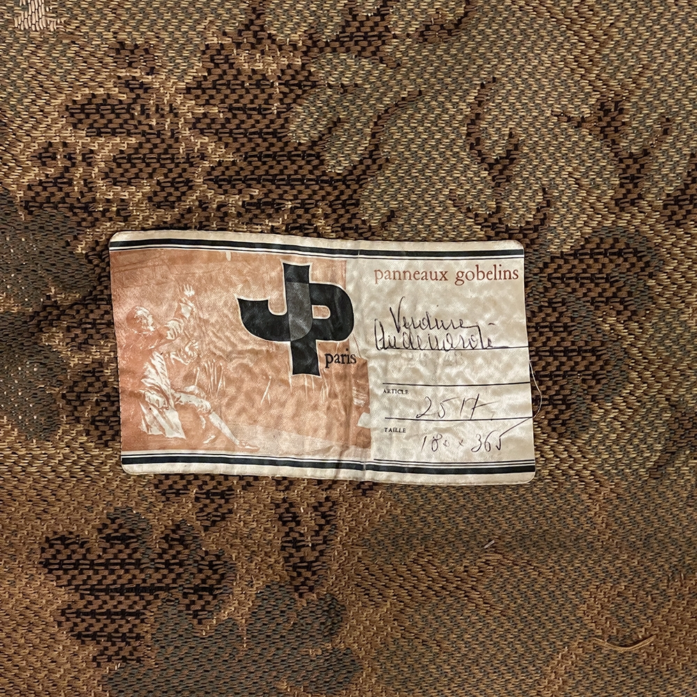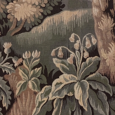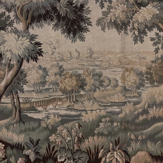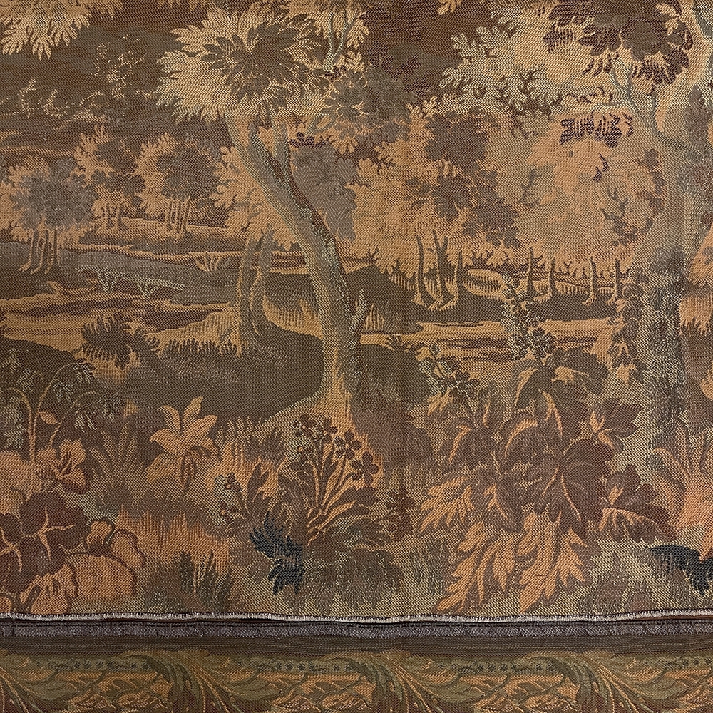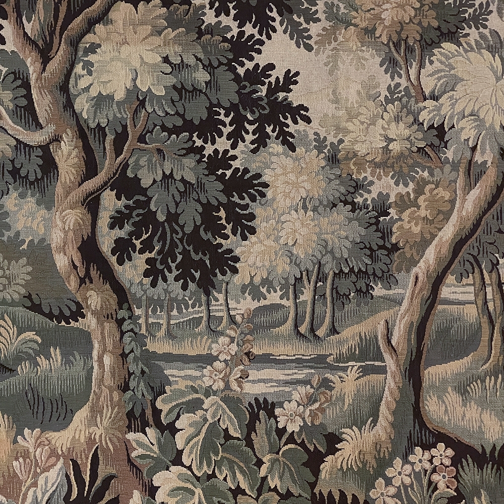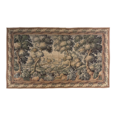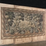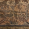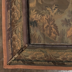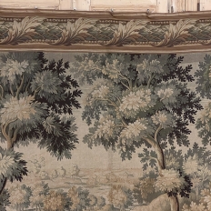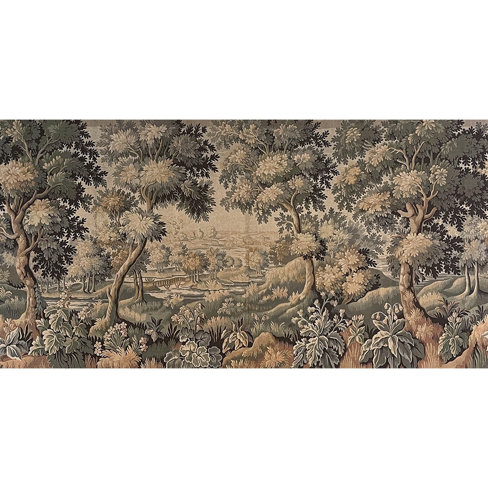 Grand Antique French Tapestry by Gobelins of Paris is a stunning panoramic landscape scene depicting a lush wooded area on the outskirts of a rural village. Crafted on a large scale, it spans almost seven and a half feet tall by almost thirteen feet wide! Styled after the storied Oudenaarde tapestries produced by the Flemish in past centuries, it reveals the level of sophistication that the French achieved using more modern looming methods. Note the exquisite border intact all around that depicts laurel bundles encircled with acanthus leaves and framed by beading. The scene itself depicts a wide variety of flora, utilizing an amazing assemblage of different hues of earth tones creating a subtle, relaxing effect. Little touches like a foot bridge over the water and a small cottage in the distance add a very subtle humanistic touch. Such idealistic renderings reached a new level of popularity during the Renaissance when the Gobelins first practiced their artistic craft. Louis XIV promoted the industry to the point it received worldwide acclaim. The French Ministry of Culture still maintains a tapestry factory in Paris near Les Gobelins métro station in the 13th arrondissement of Paris. It was originally established on the site as medieval dyeing business by the family Gobelin.