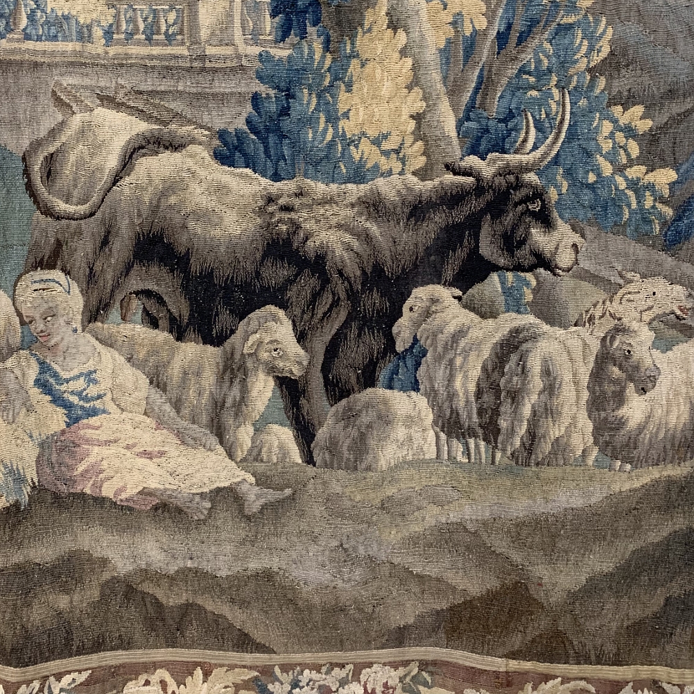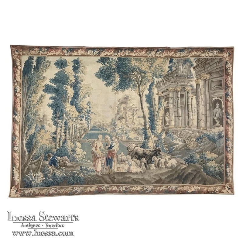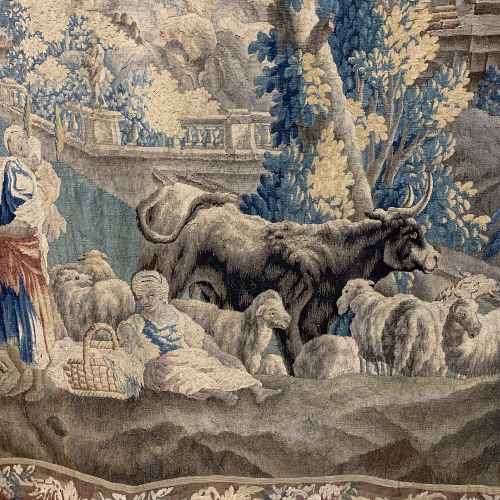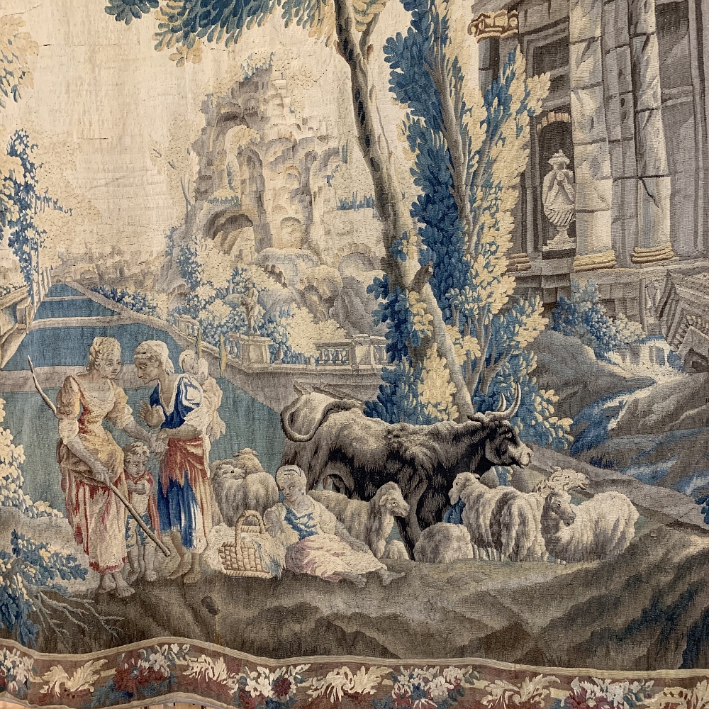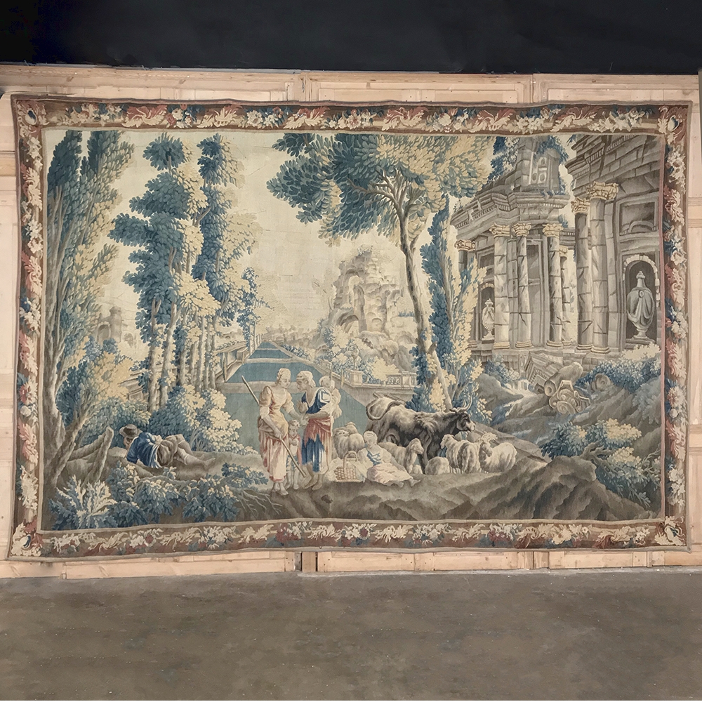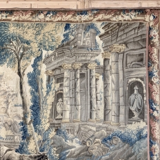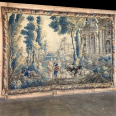 Grand 17th Century Oudenaarde Tapestry is a work of art that only the masters of Flanders could produce. Works from the region were in demand the world over, including kings, dukes, earls and other nobles who wanted the best quality to adorn their chateaux and castles, while at the same time providing a softer texture and warmth to the otherwise cold stone walls. The subject of this master work, which still retains its intricate bordering, depicts what appears to be the remains of a formal garden with architectural ruins to one side, visited by a group of common folks relaxing in the summer sun accompanied by a variety of livestock, all artfully rendered to an exquisite degree by obvious masters of the loomer's art!