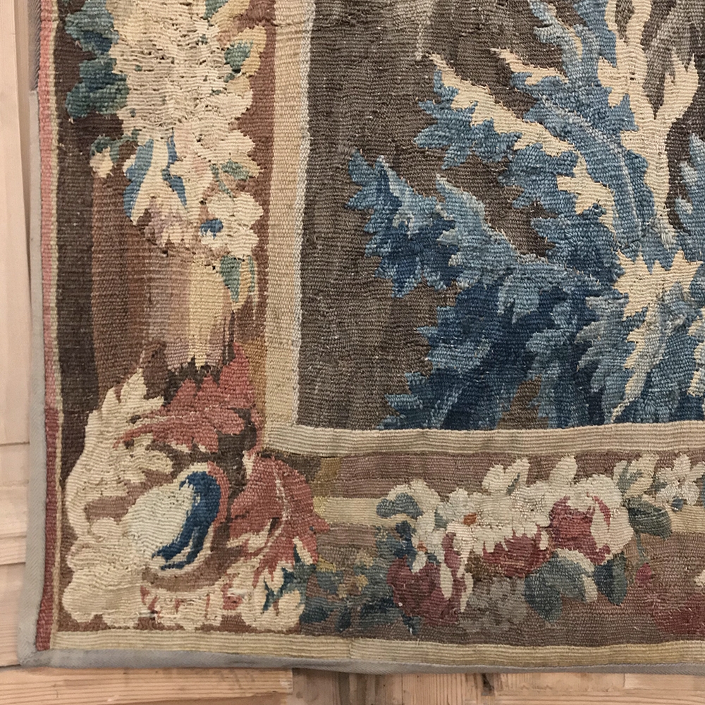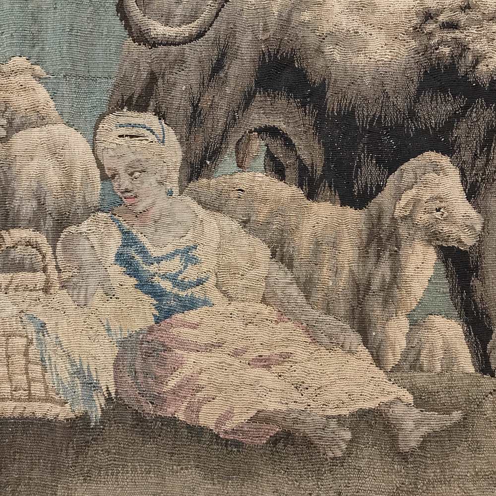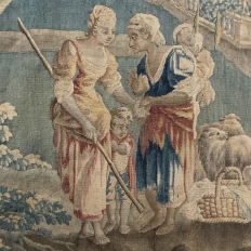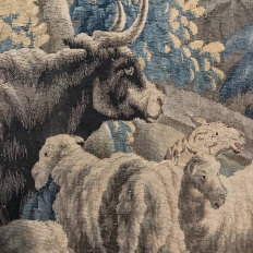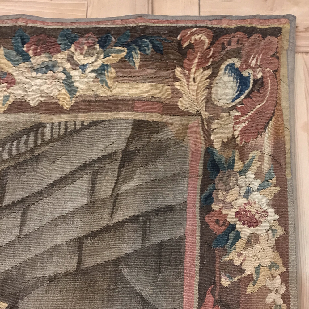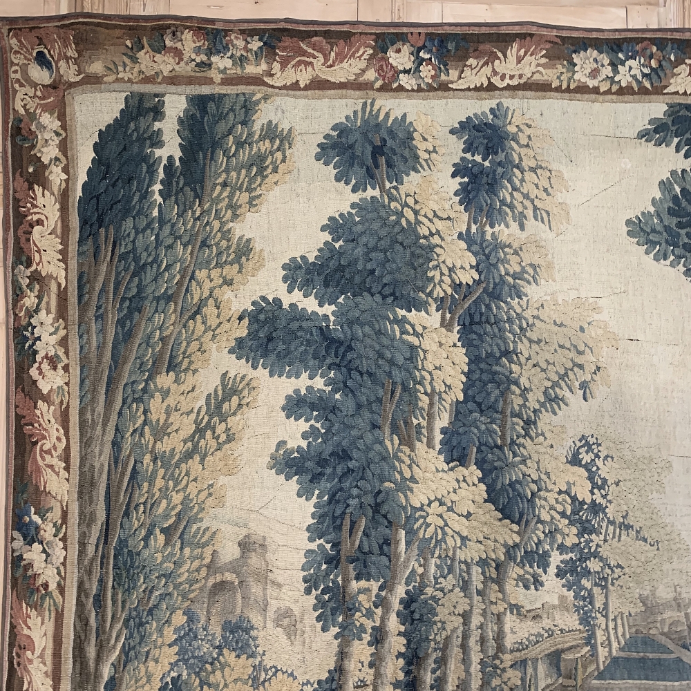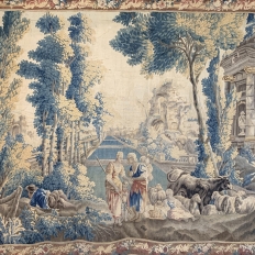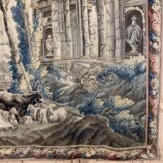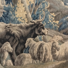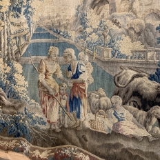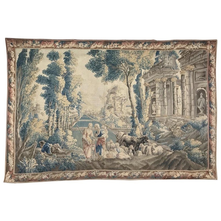 Grand 17th Century Oudenaarde Tapestry is a work of art that only the masters of Flanders could produce. Works from the region were in demand the world over, including kings, dukes, earls and other nobles who wanted the best quality to adorn their chateaux and castles, while at the same time providing a softer texture and warmth to the otherwise cold stone walls. The subject of this master work, which still retains its intricate bordering, depicts what appears to be the remains of a formal garden with architectural ruins to one side, visited by a group of common folks relaxing in the summer sun accompanied by a variety of livestock, all artfully rendered to an exquisite degree by obvious masters of the loomer's art!