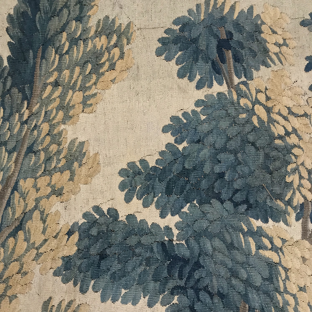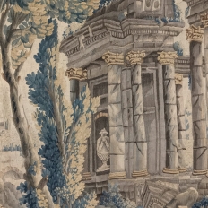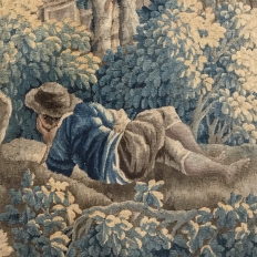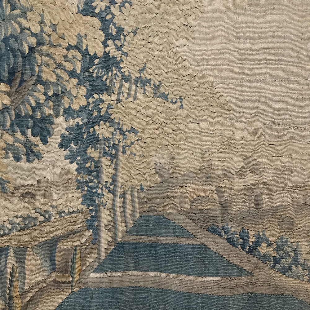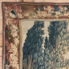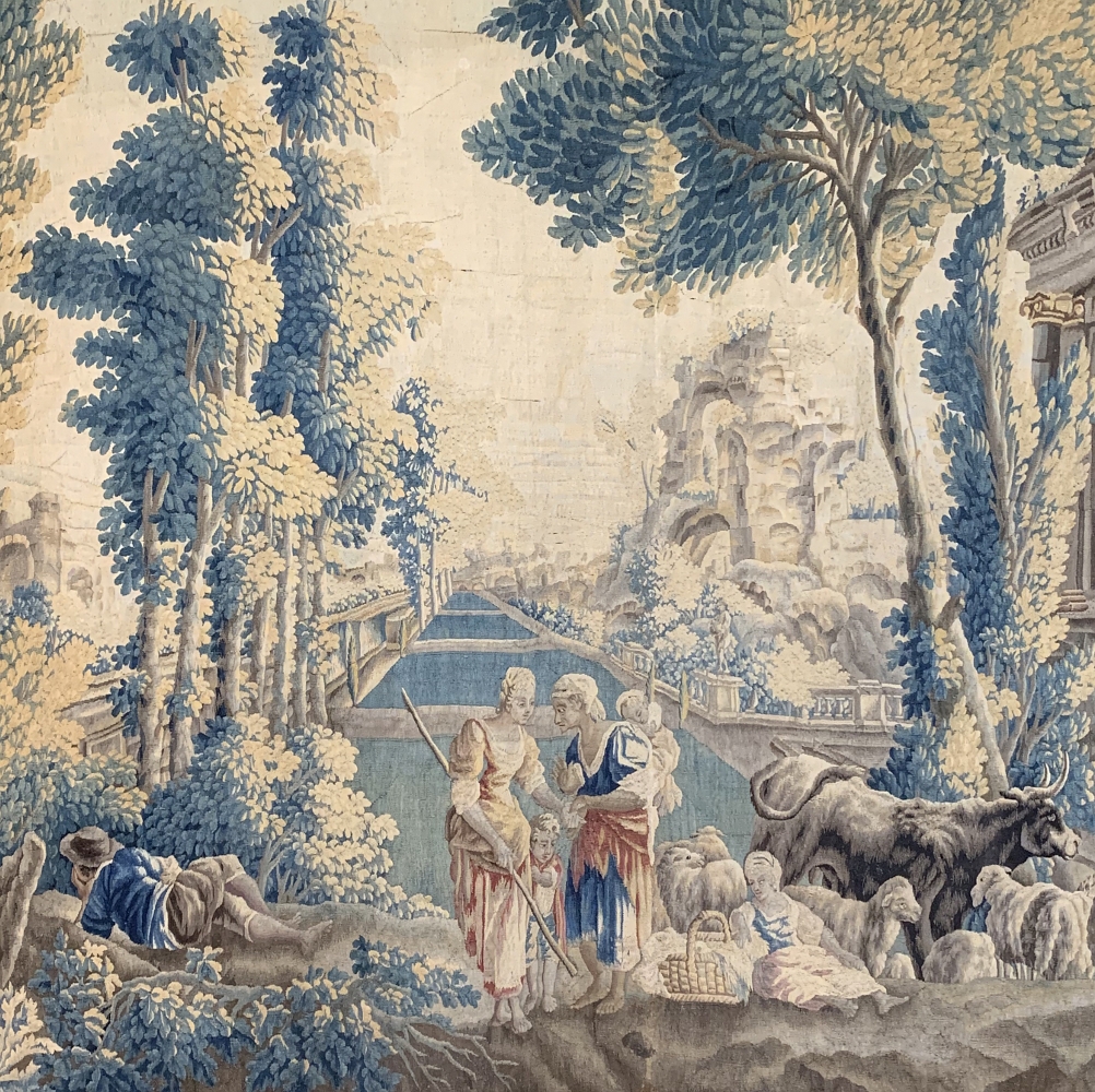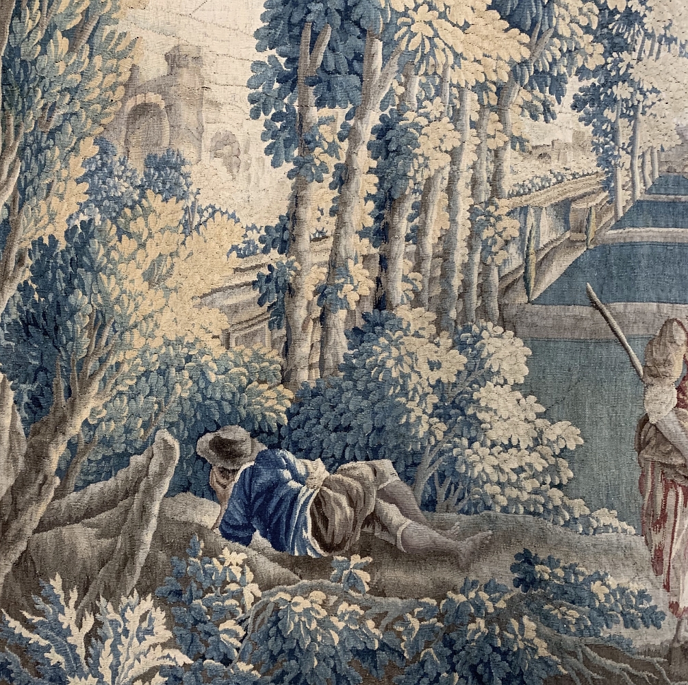 Grand 17th Century Oudenaarde Tapestry is a work of art that only the masters of Flanders could produce. Works from the region were in demand the world over, including kings, dukes, earls and other nobles who wanted the best quality to adorn their chateaux and castles, while at the same time providing a softer texture and warmth to the otherwise cold stone walls. The subject of this master work, which still retains its intricate bordering, depicts what appears to be the remains of a formal garden with architectural ruins to one side, visited by a group of common folks relaxing in the summer sun accompanied by a variety of livestock, all artfully rendered to an exquisite degree by obvious masters of the loomer's art!
