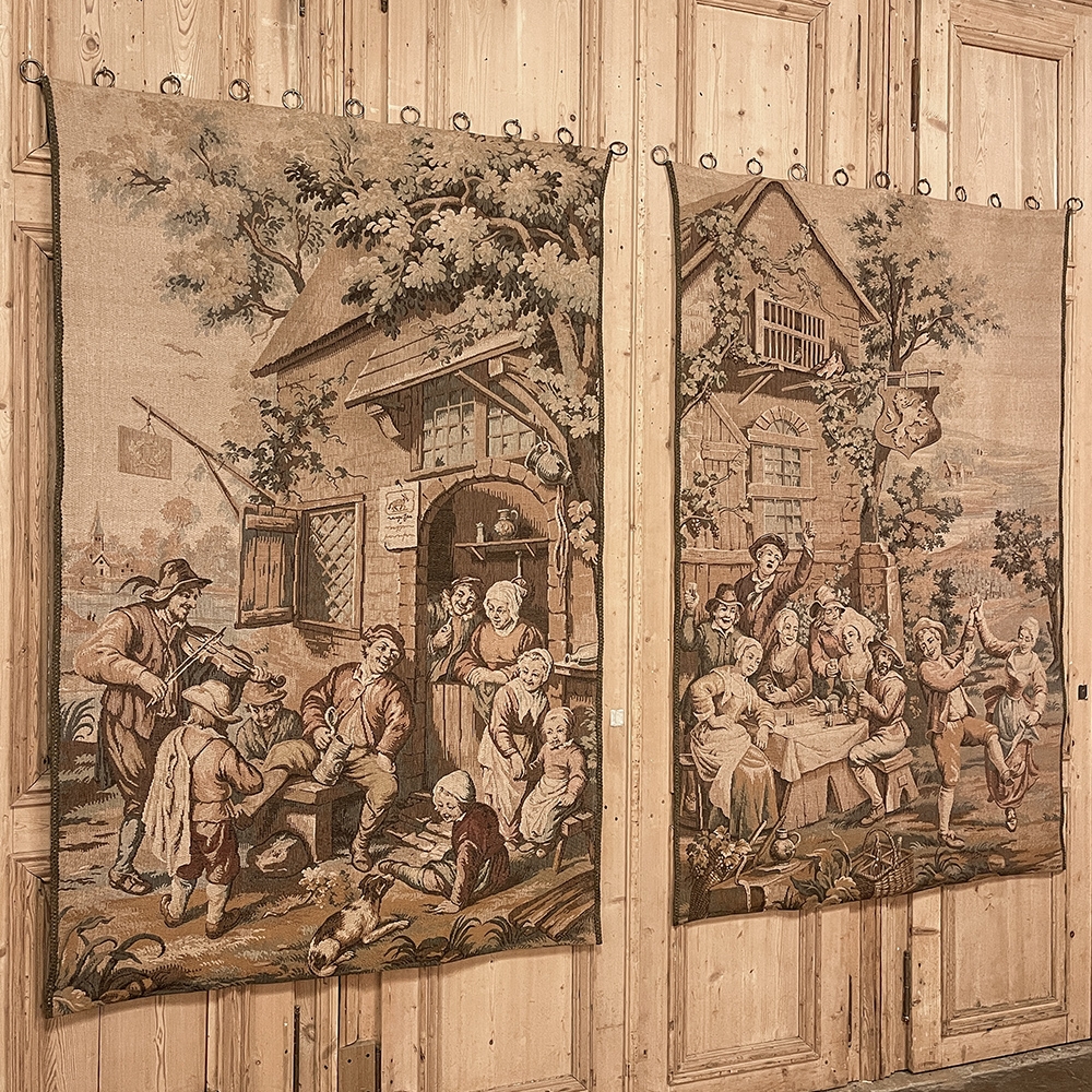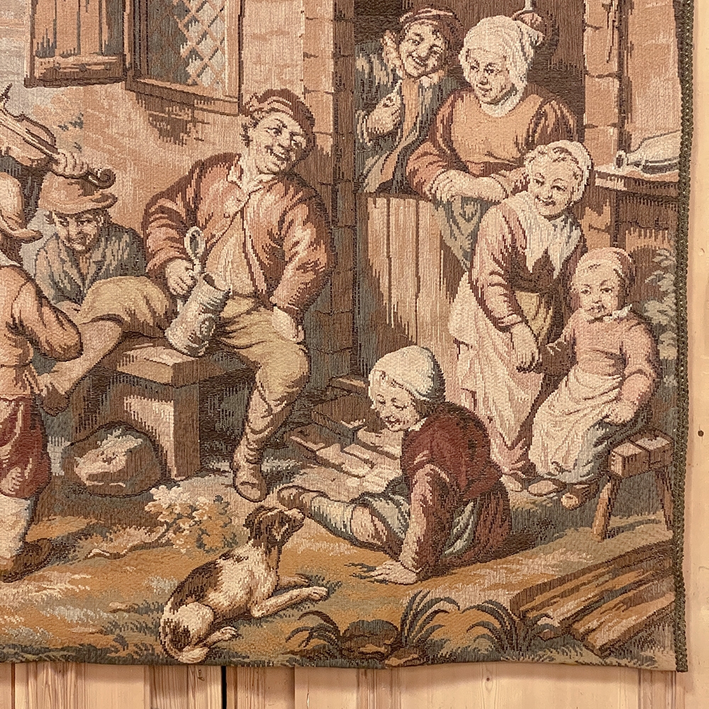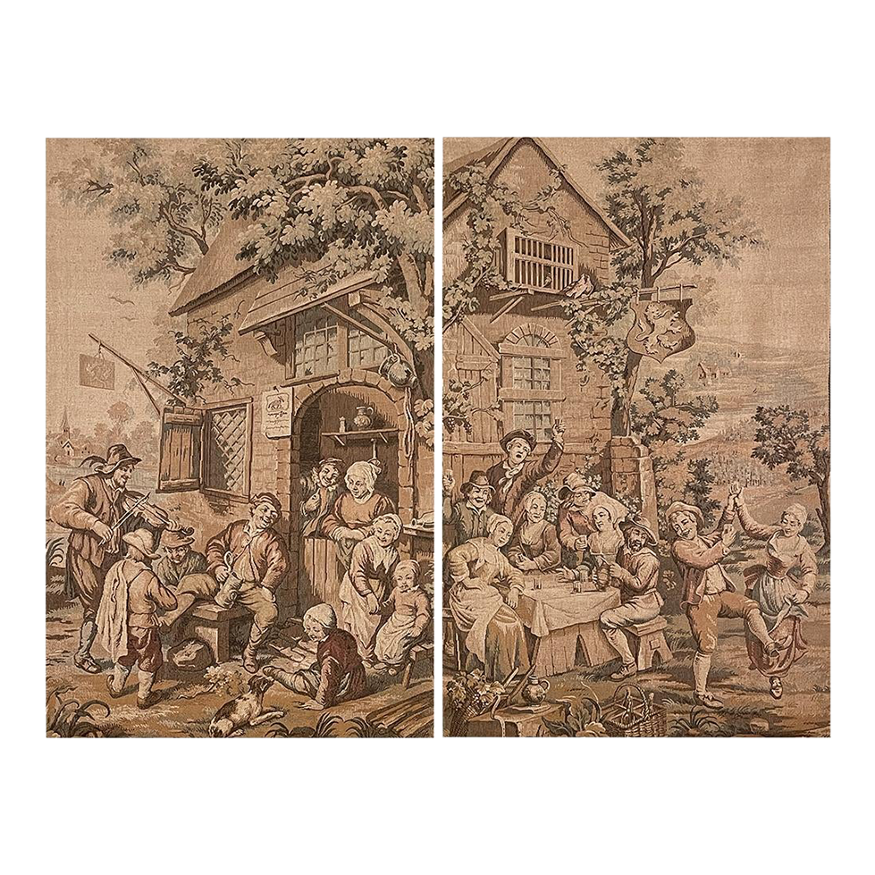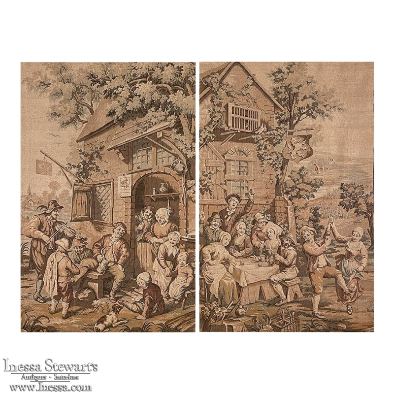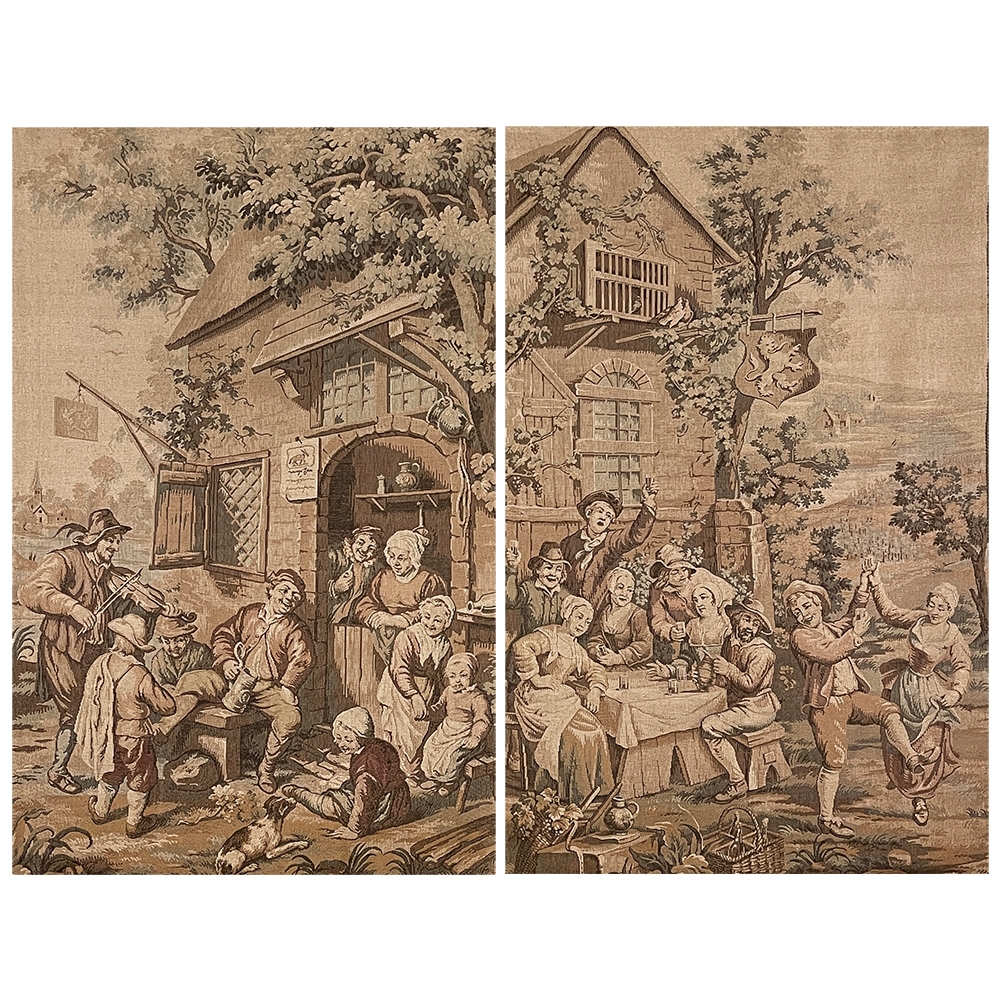 SalePair Antique Tapestries after David Teniers the Younger are designed to display side by side to create a continuous scene. The scene is a delightful rural village setting during a celebration, which was a frequent occurrence that brought the community together in a departure from the daily chores and work. Note the meticulous attention to detail in the structure of the quaint tavern with the windows, signs and surrounding trees. The revelers include all ages and are depicted singing, dancing,, and enjoying the music of the fiddle. Truly a charming scene!