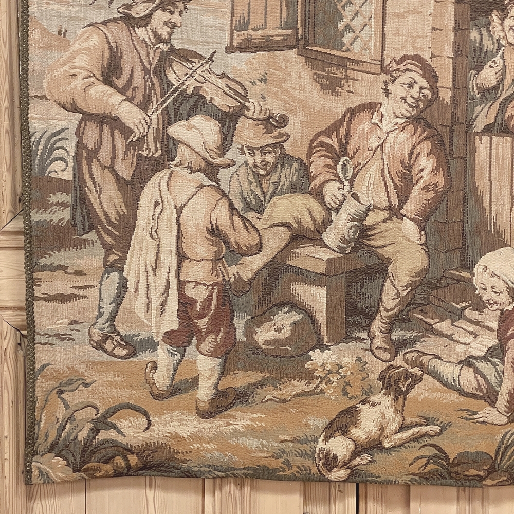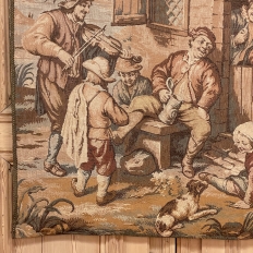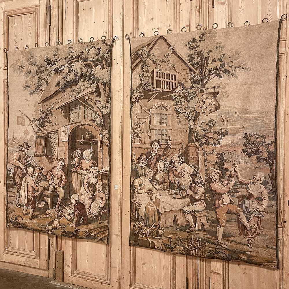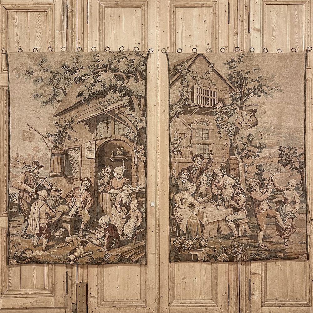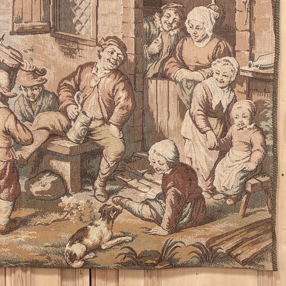 SalePair Antique Tapestries after David Teniers the Younger are designed to display side by side to create a continuous scene. The scene is a delightful rural village setting during a celebration, which was a frequent occurrence that brought the community together in a departure from the daily chores and work. Note the meticulous attention to detail in the structure of the quaint tavern with the windows, signs and surrounding trees. The revelers include all ages and are depicted singing, dancing,, and enjoying the music of the fiddle. Truly a charming scene!