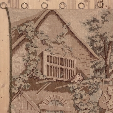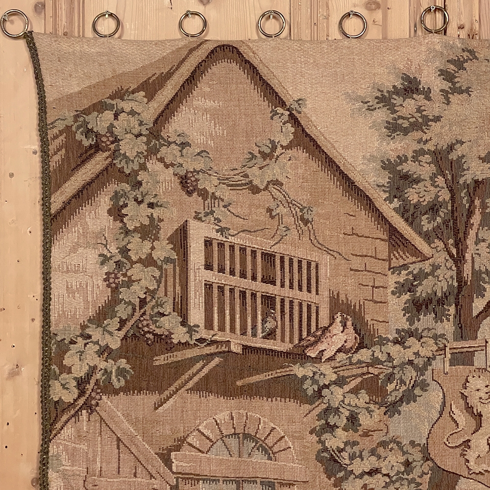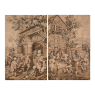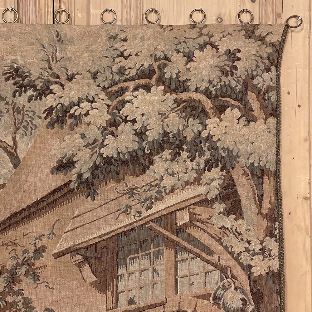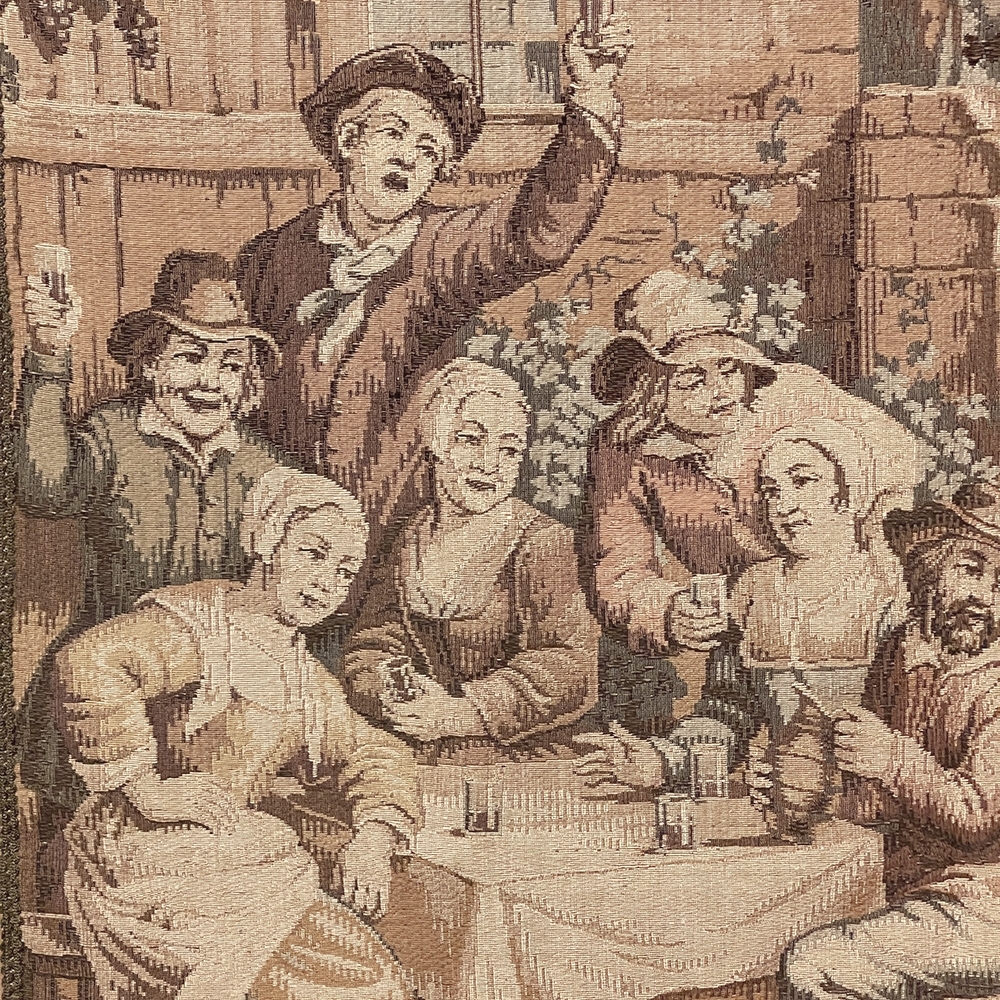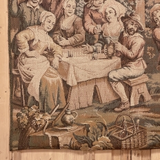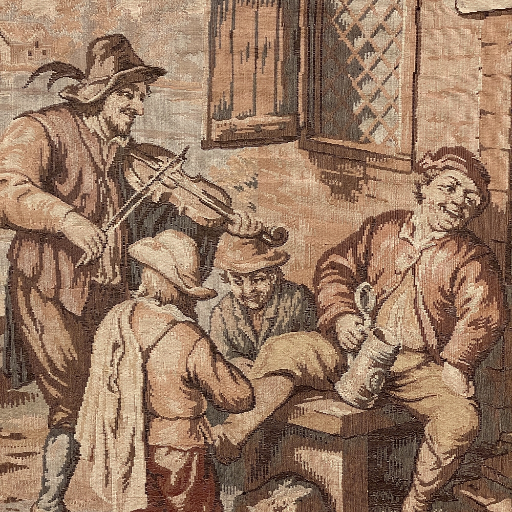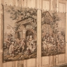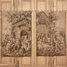 SalePair Antique Tapestries after David Teniers the Younger are designed to display side by side to create a continuous scene. The scene is a delightful rural village setting during a celebration, which was a frequent occurrence that brought the community together in a departure from the daily chores and work. Note the meticulous attention to detail in the structure of the quaint tavern with the windows, signs and surrounding trees. The revelers include all ages and are depicted singing, dancing,, and enjoying the music of the fiddle. Truly a charming scene!