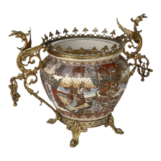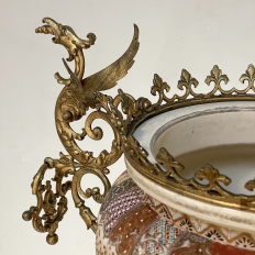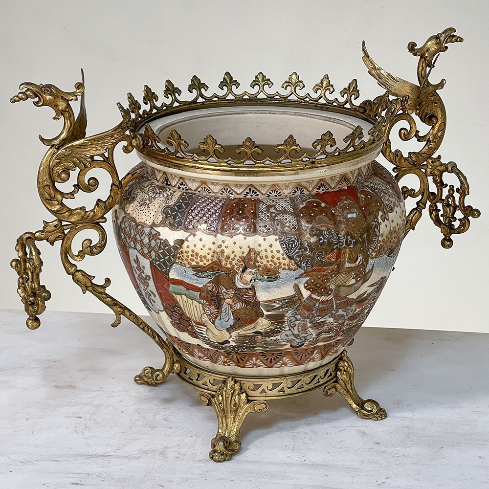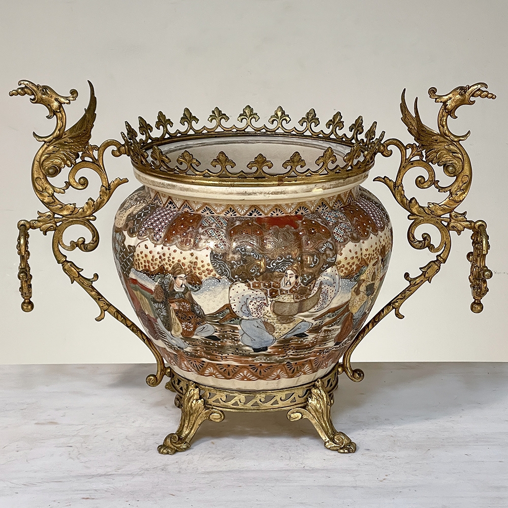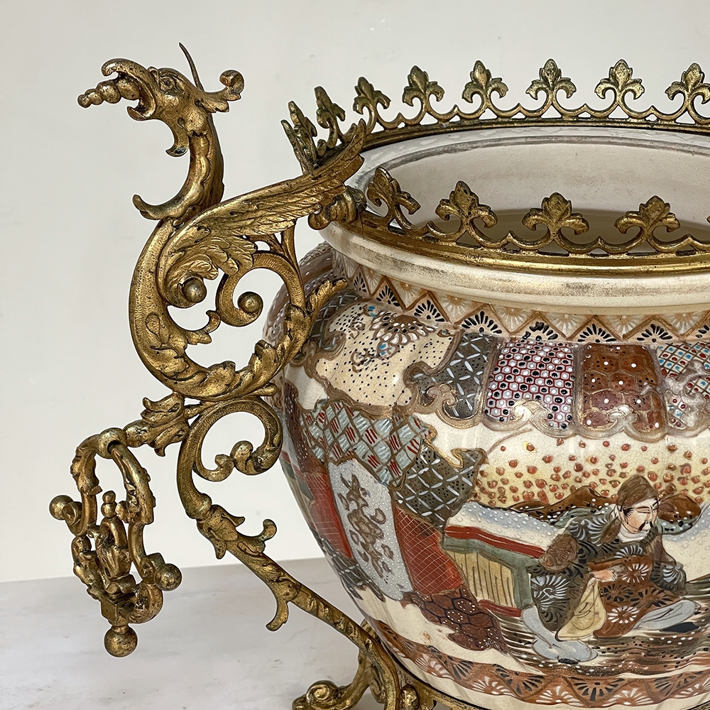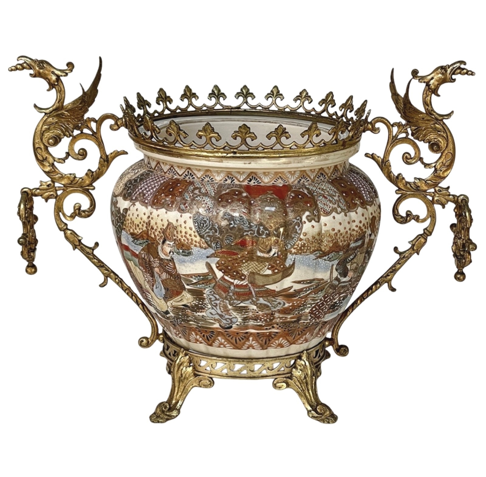 19th Century Bronze Mounted Satsuma Jardiniere is a splendidly preserved artifact from a wonderful period in French history! The porcelain bowls were meticulously hand-painted in what is today called Satsuma pattern, which was made in and around Kagoshima in Kyushu, Japan in the later part of the 19th century through to the early 1920s. Typical of Satsuma pieces, it was created in a yellow complexion and hand-painted with intricate and minute Japanese figures, landscapes and dragons. The pottery was then shipped off to various European markets. In France, bronze mounts were added to make the pieces even more impressive. Intricate scrolls, dragons with outspread wings, and foliate flourishes forming the feet combine with a rim of fleurs de lys resulting in a magical look.