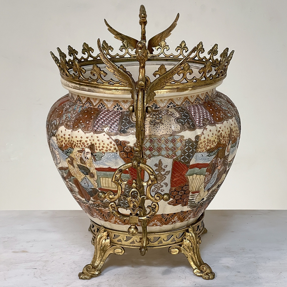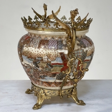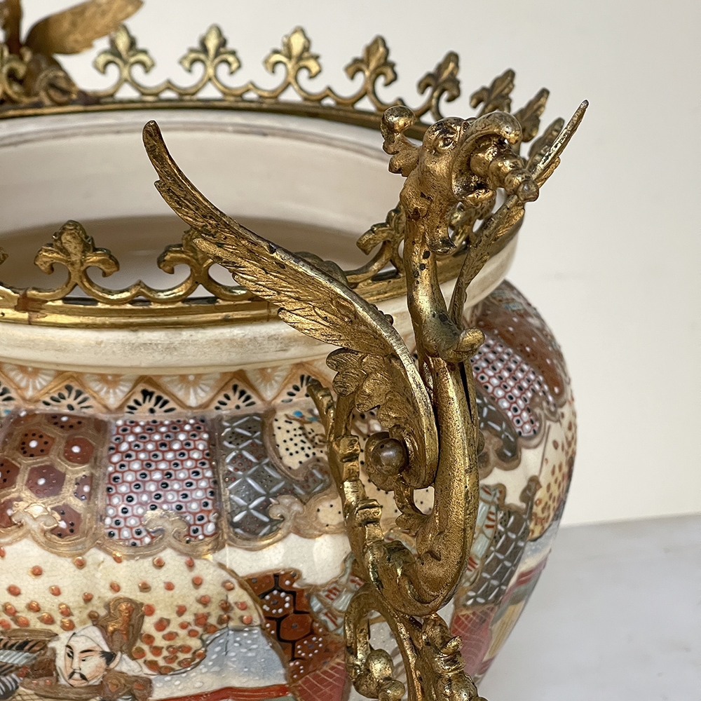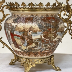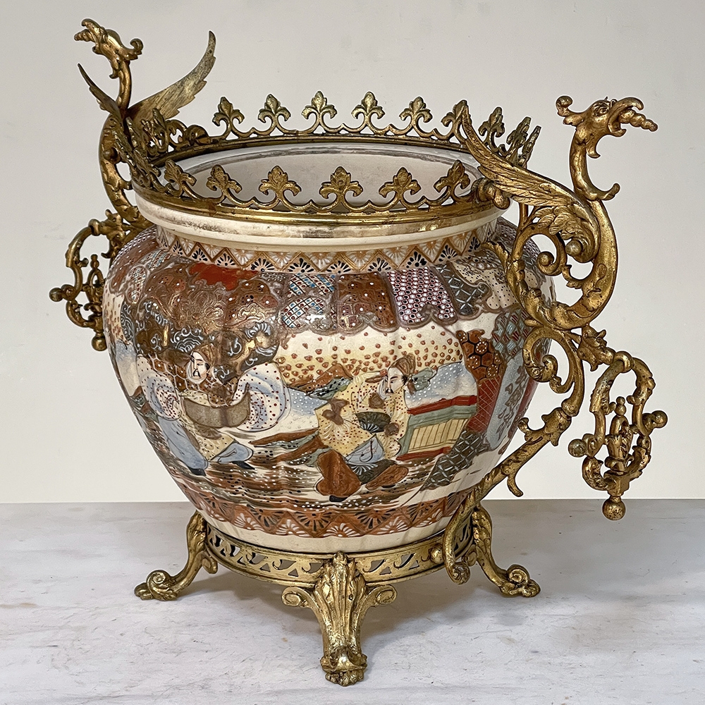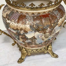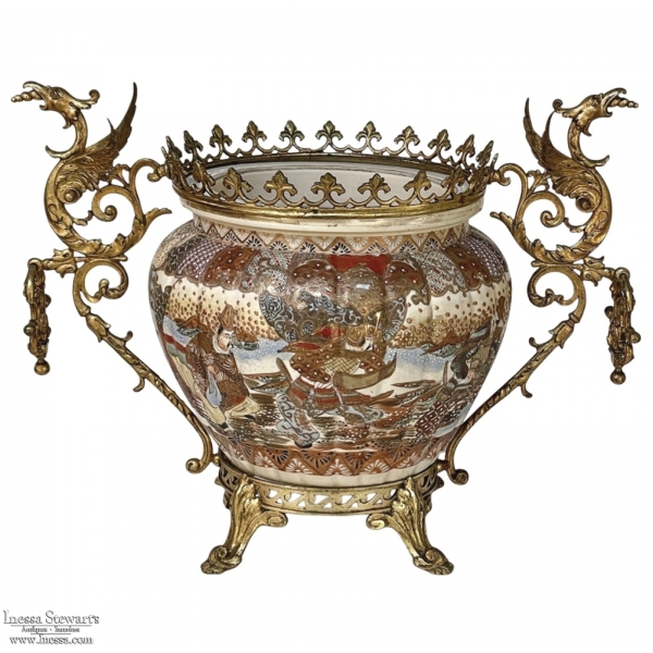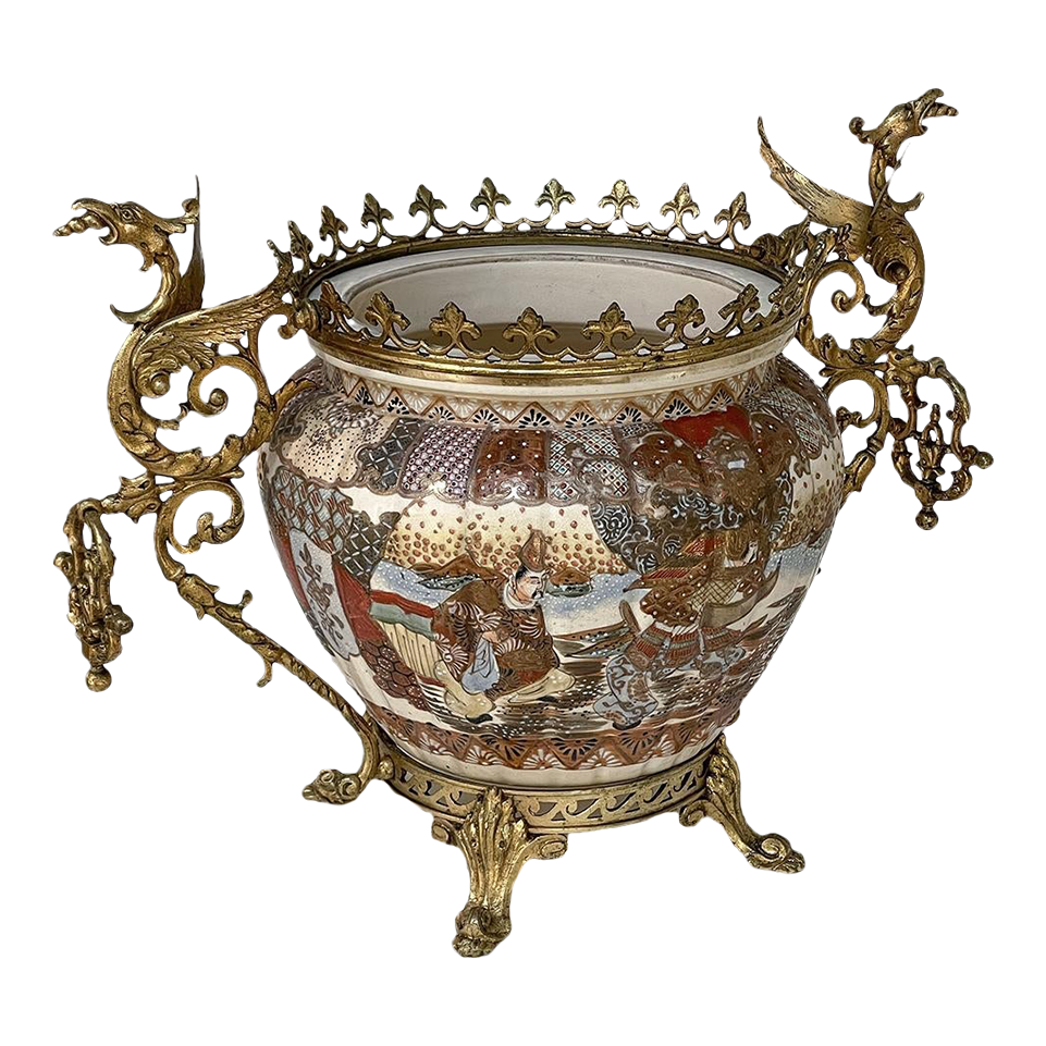 19th Century Bronze Mounted Satsuma Jardiniere is a splendidly preserved artifact from a wonderful period in French history! The porcelain bowls were meticulously hand-painted in what is today called Satsuma pattern, which was made in and around Kagoshima in Kyushu, Japan in the later part of the 19th century through to the early 1920s. Typical of Satsuma pieces, it was created in a yellow complexion and hand-painted with intricate and minute Japanese figures, landscapes and dragons. The pottery was then shipped off to various European markets. In France, bronze mounts were added to make the pieces even more impressive. Intricate scrolls, dragons with outspread wings, and foliate flourishes forming the feet combine with a rim of fleurs de lys resulting in a magical look.