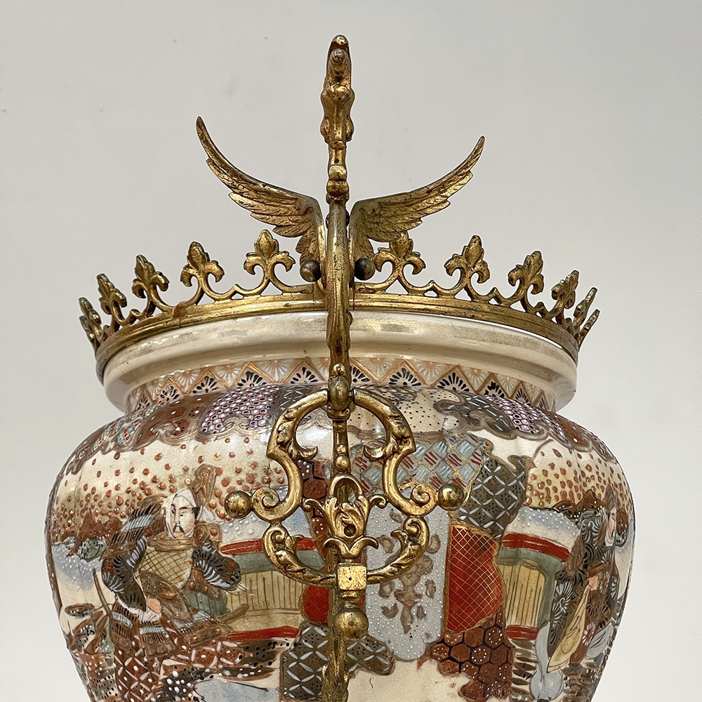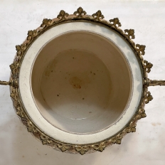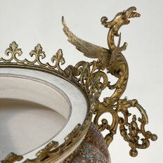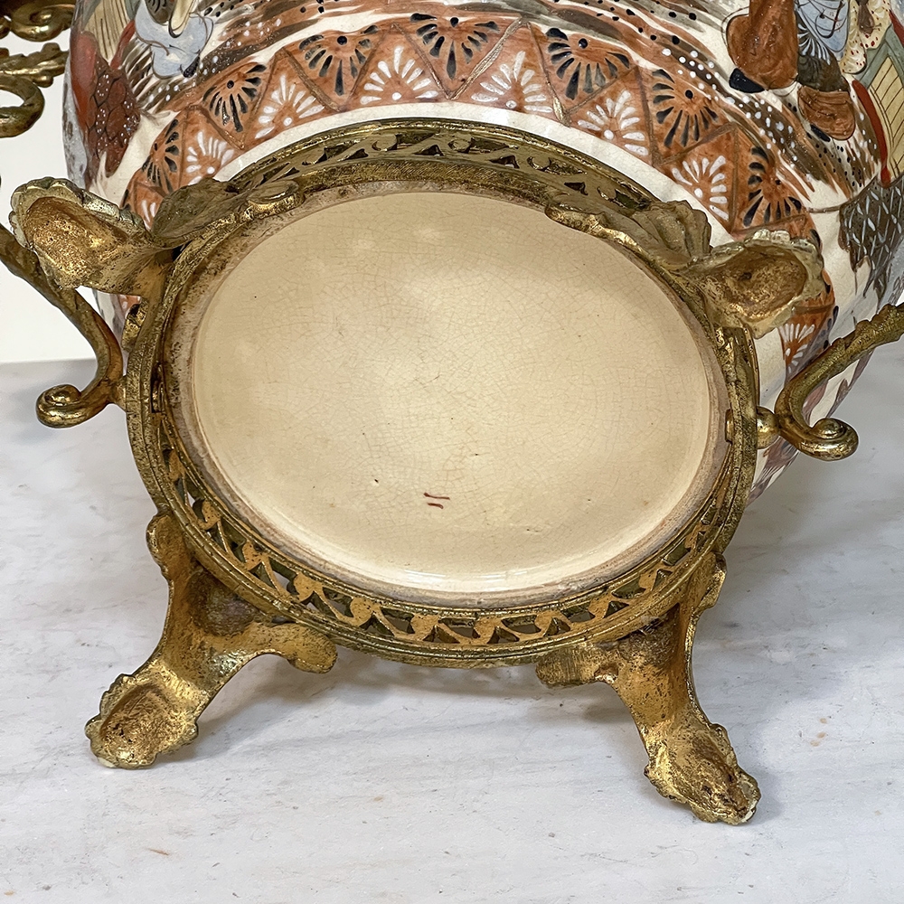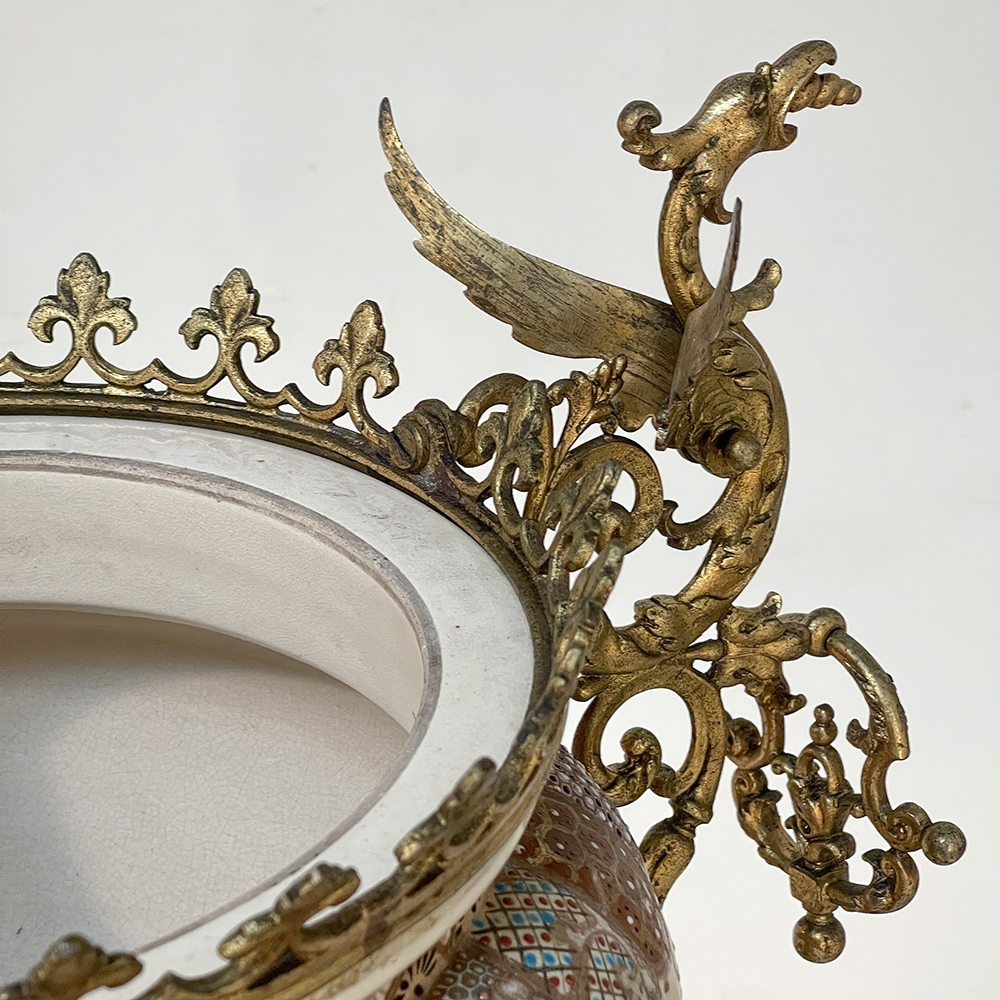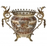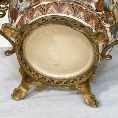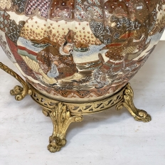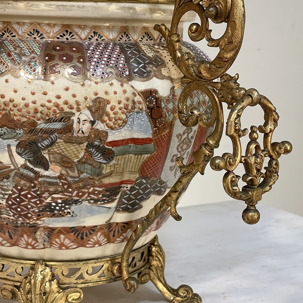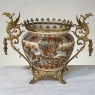 19th Century Bronze Mounted Satsuma Jardiniere is a splendidly preserved artifact from a wonderful period in French history! The porcelain bowls were meticulously hand-painted in what is today called Satsuma pattern, which was made in and around Kagoshima in Kyushu, Japan in the later part of the 19th century through to the early 1920s. Typical of Satsuma pieces, it was created in a yellow complexion and hand-painted with intricate and minute Japanese figures, landscapes and dragons. The pottery was then shipped off to various European markets. In France, bronze mounts were added to make the pieces even more impressive. Intricate scrolls, dragons with outspread wings, and foliate flourishes forming the feet combine with a rim of fleurs de lys resulting in a magical look.