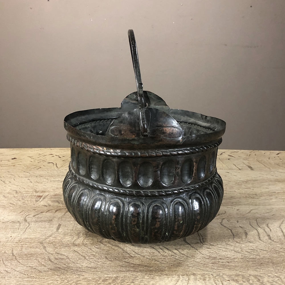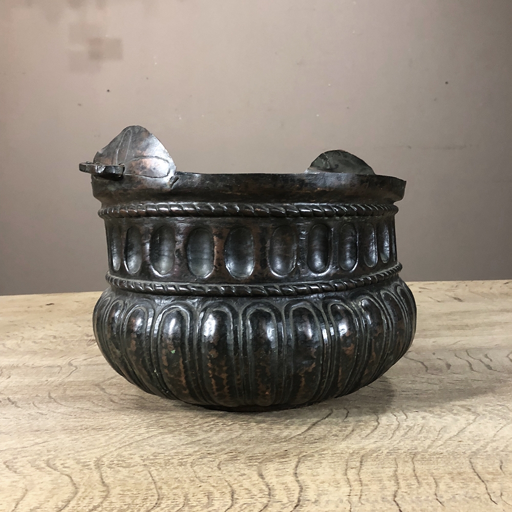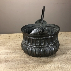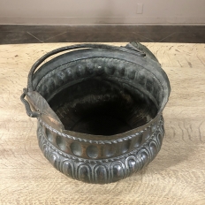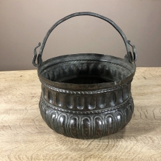 19th Century Embossed Copper Jardiniere – Planter was made from solid copper, and features a graceful bell shape with flared and fluted rim, fitted with a hand forged rod handle. Perfect for displaying florals or using as a decorative accent all on its own!