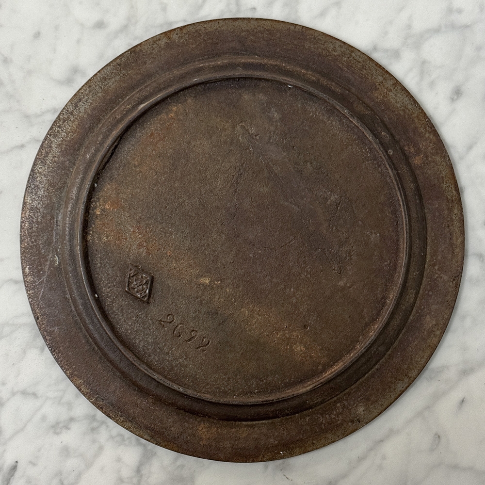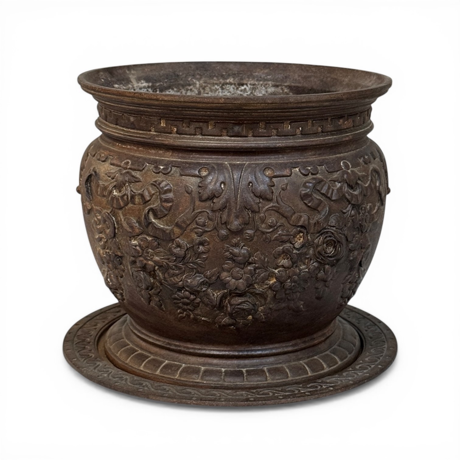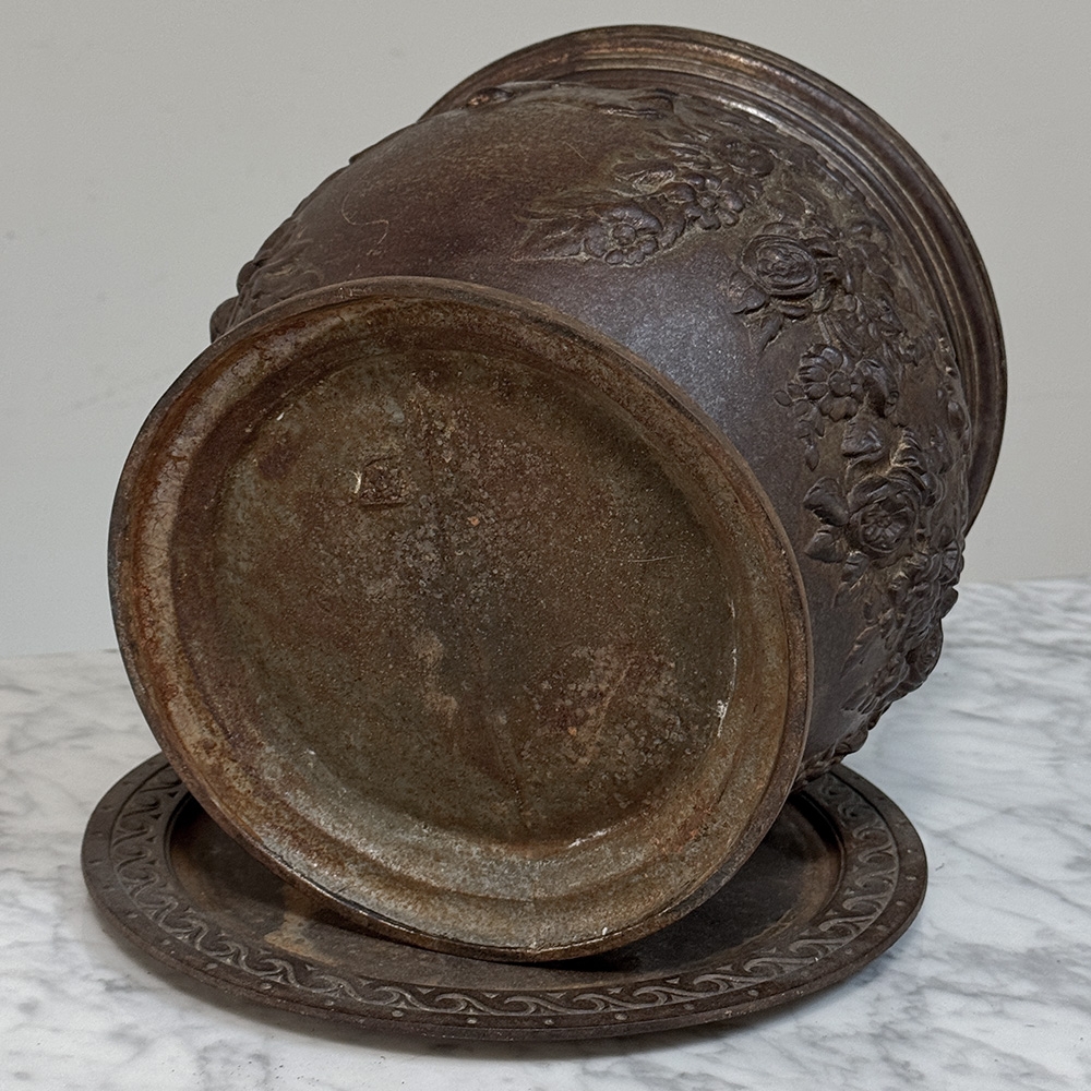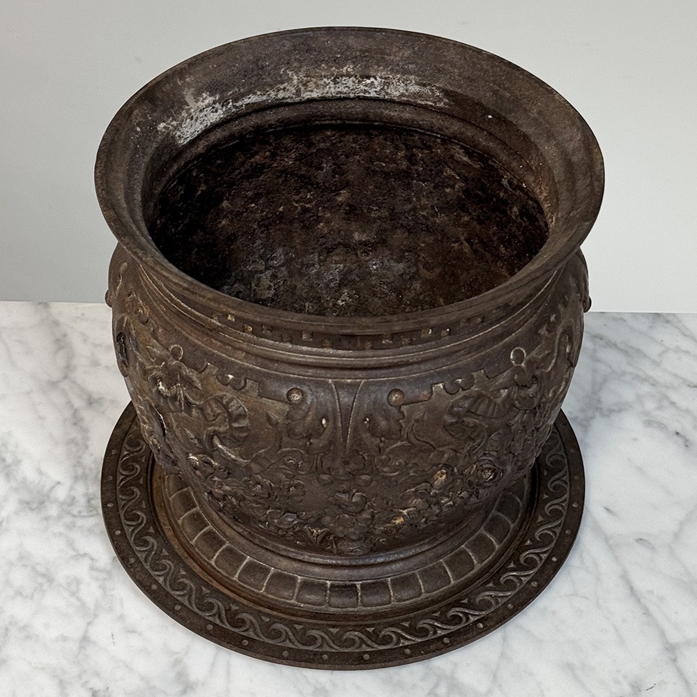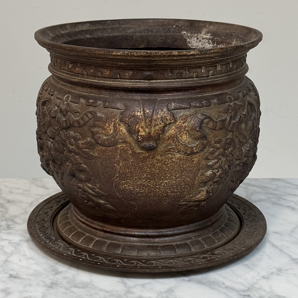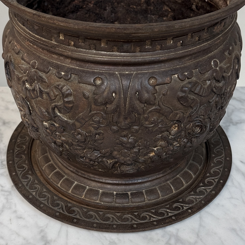 A beautifully detailed 19th century French cast iron cache pot with matching saucer, richly cast with scrolling foliate ornament, floral garlands, and a classical banded rim. The deep, time-softened patina brings warmth to the iron and highlights the remarkable crispness of the relief work, giving the piece both strength and refinement. Substantial and decorative, it makes a wonderful accent for a tabletop, mantel, or conservatory, whether used to hold a plant or simply admired as an object on its own. A lovely example of the way even utilitarian pieces were given artistry and presence in 19th century French interiors.