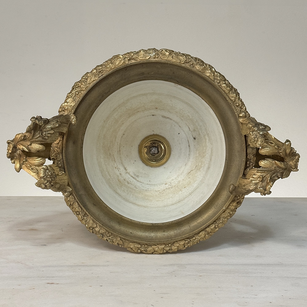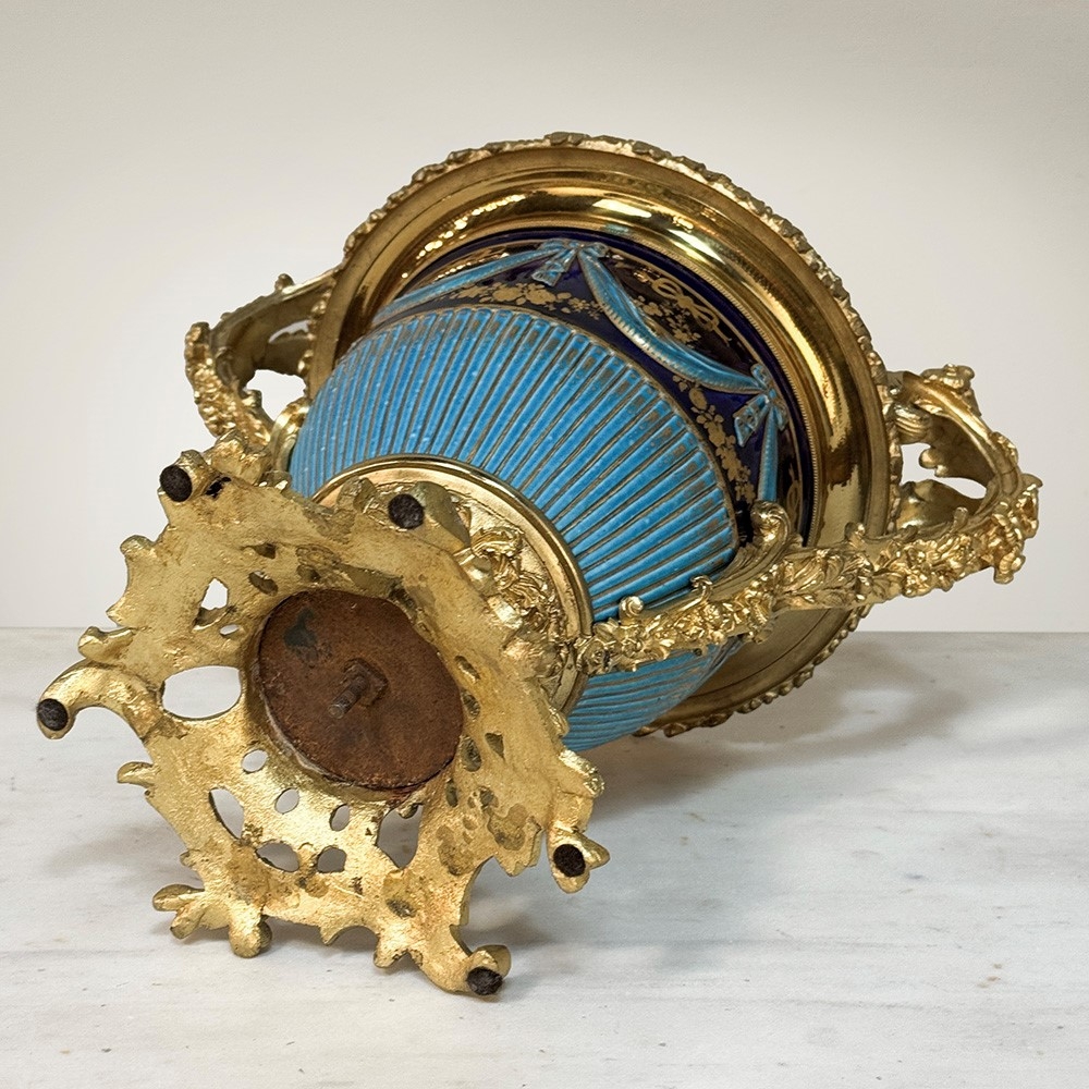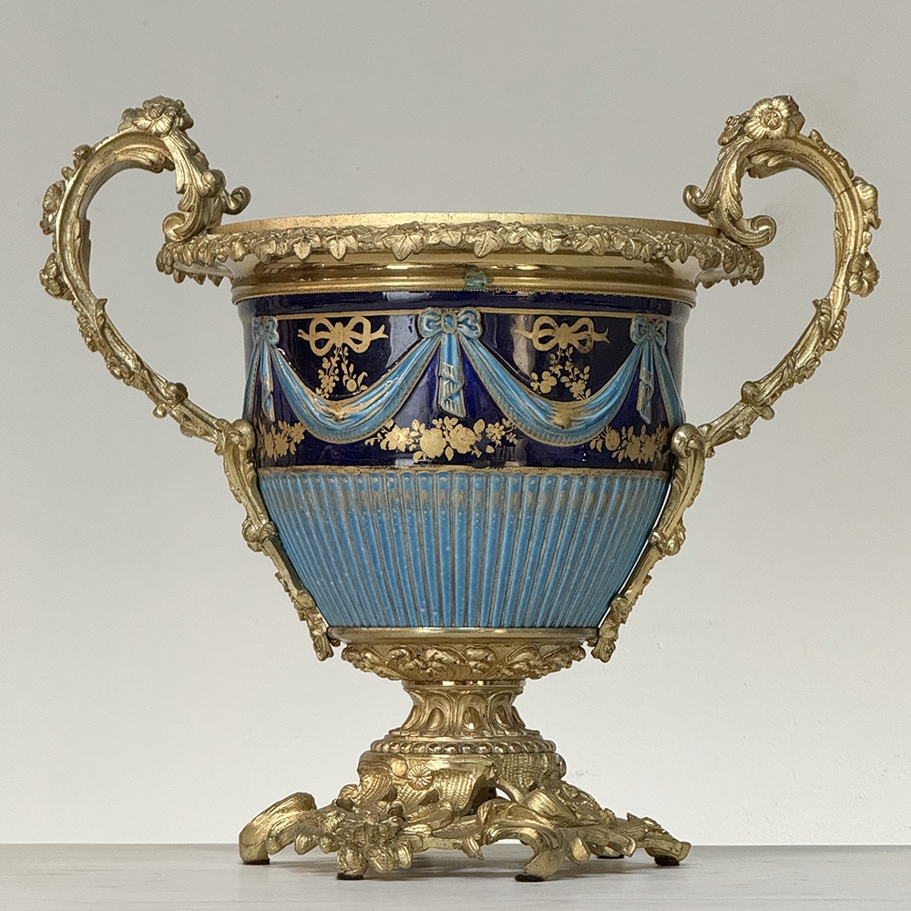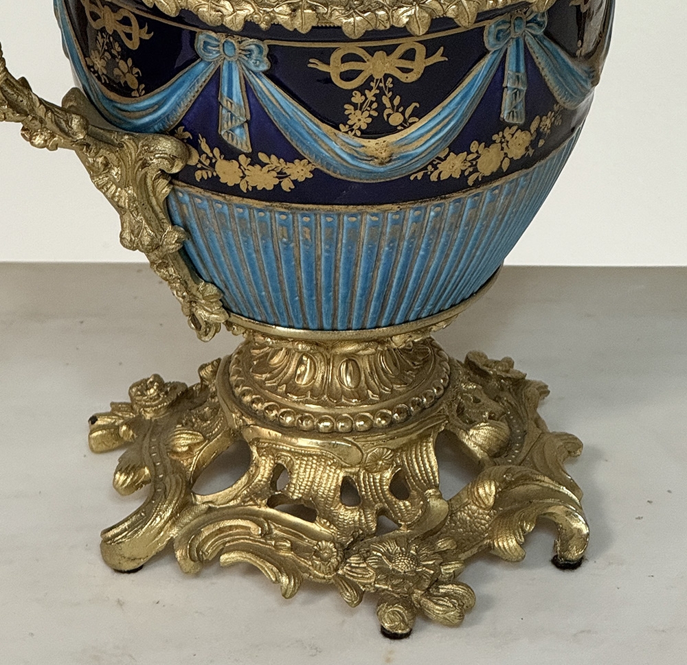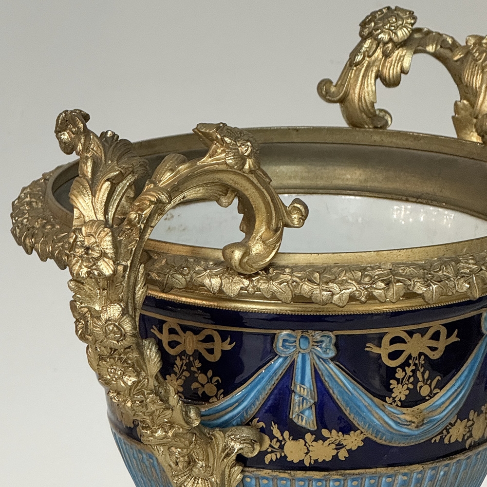 The porcelain is elevated by elaborate gilt bronze mounts~finely cast and chased with scrolling acanthus, foliate detailing, and elegantly formed double handles. During the 19th century, particularly in the Napoleon III period, the mounting of fine porcelain in ormolu became a hallmark of luxury French decorative arts. These mounts were created by skilled bronziers and transformed porcelain vessels into statement pieces suitable for grand interiors.