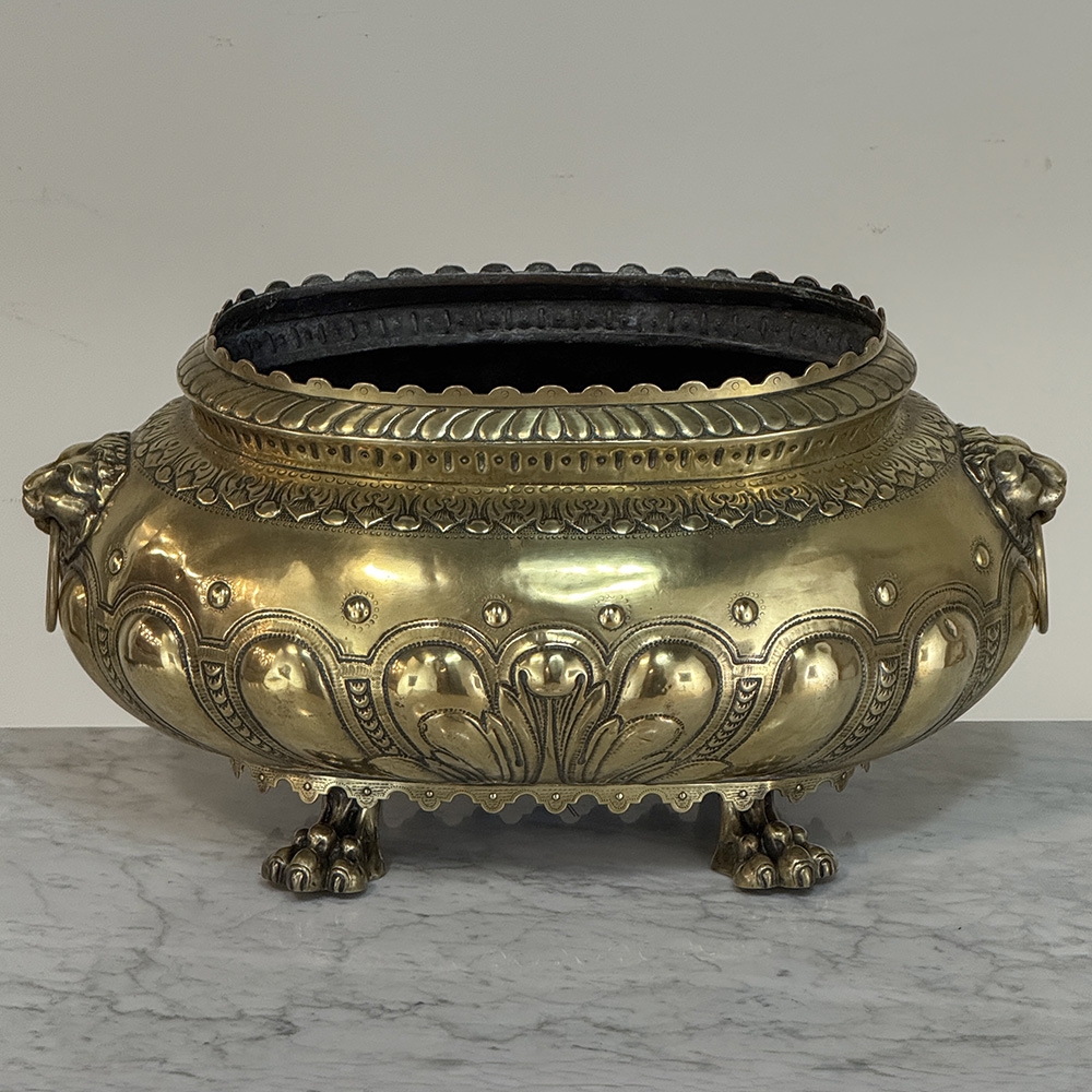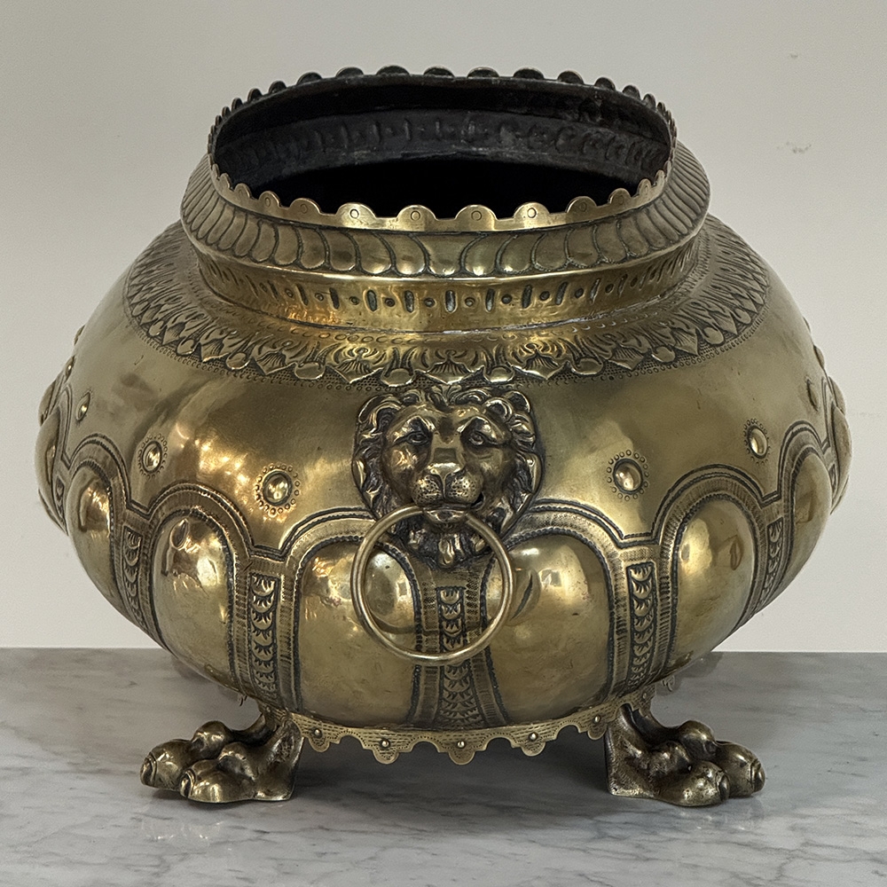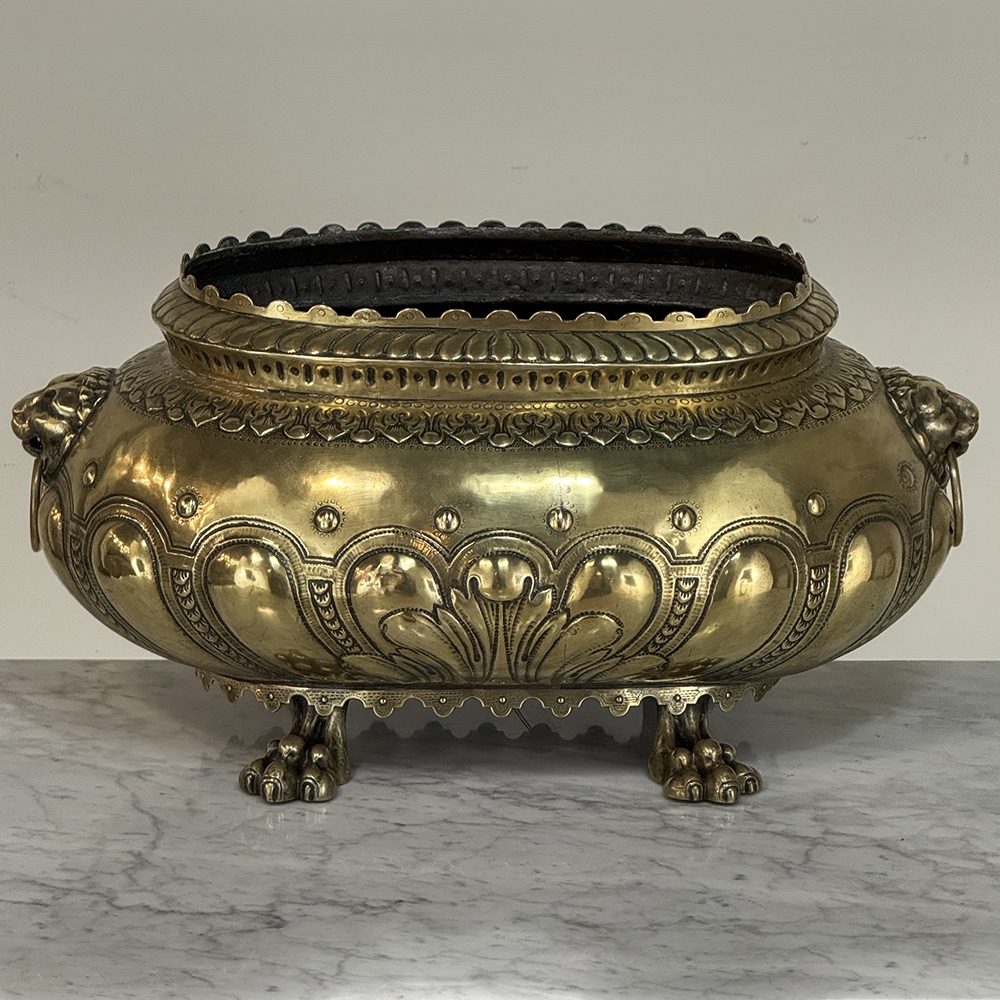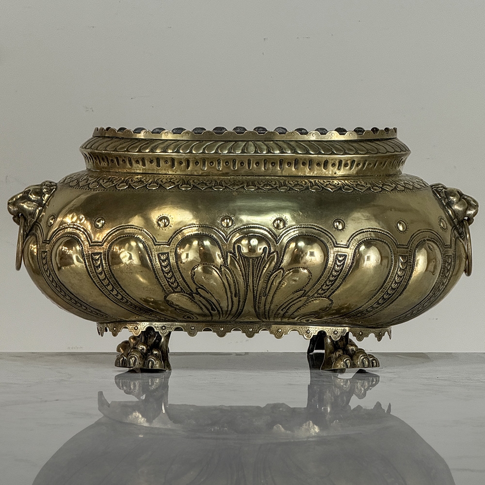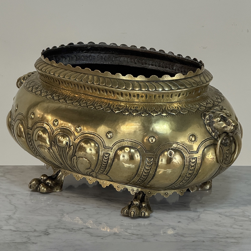 The rounded body is adorned with repoussé motifs and classical ornament, framed by lion head handles at the sides—an enduring symbol of strength and nobility frequently found in Renaissance-inspired decorative arts. The piece rests on stylized paw feet, reinforcing its architectural presence and giving the jardinière a sculptural quality when displayed as a centerpiece.