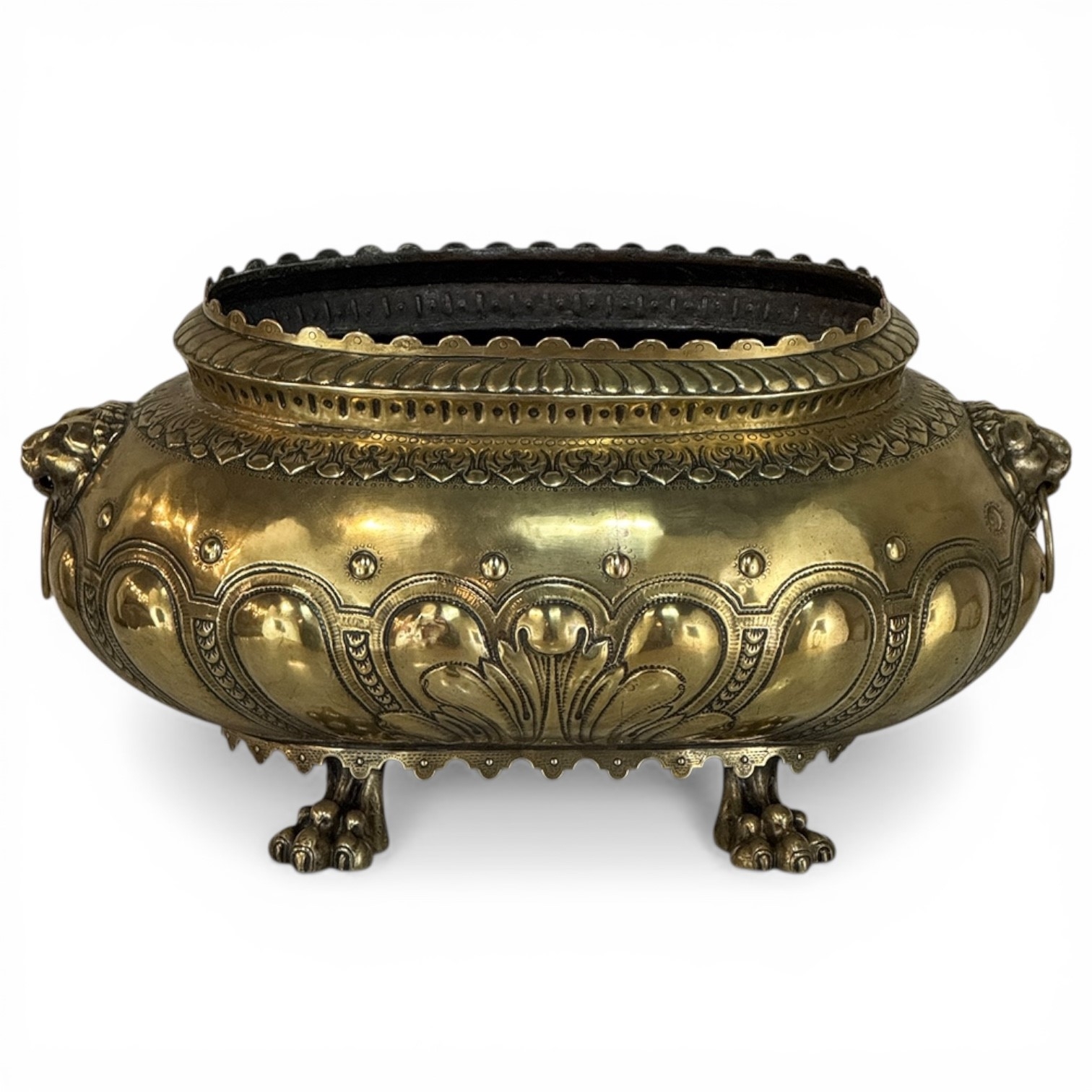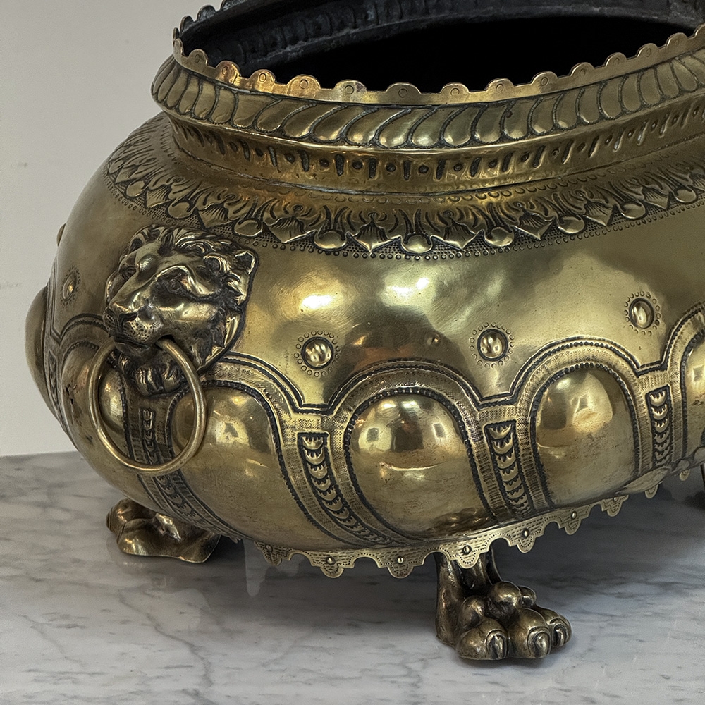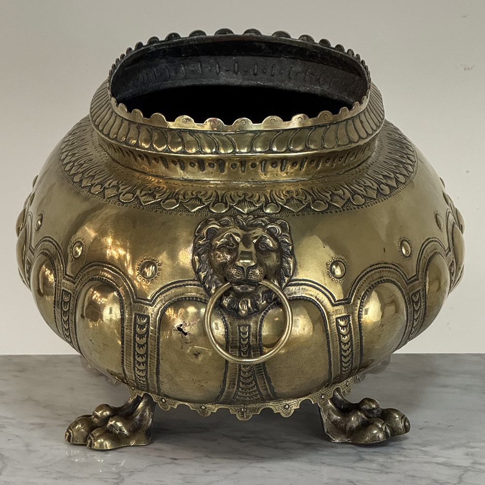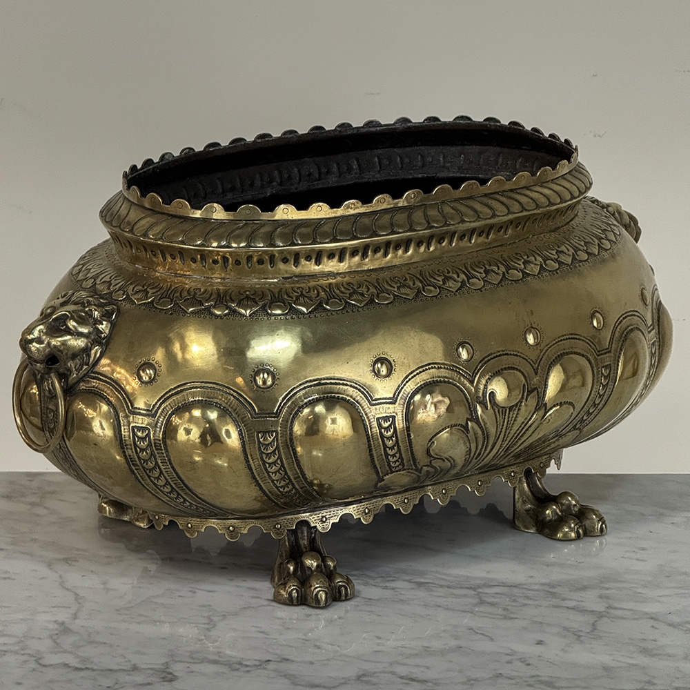 The rounded body is adorned with repoussé motifs and classical ornament, framed by lion head handles at the sides—an enduring symbol of strength and nobility frequently found in Renaissance-inspired decorative arts. The piece rests on stylized paw feet, reinforcing its architectural presence and giving the jardinière a sculptural quality when displayed as a centerpiece.