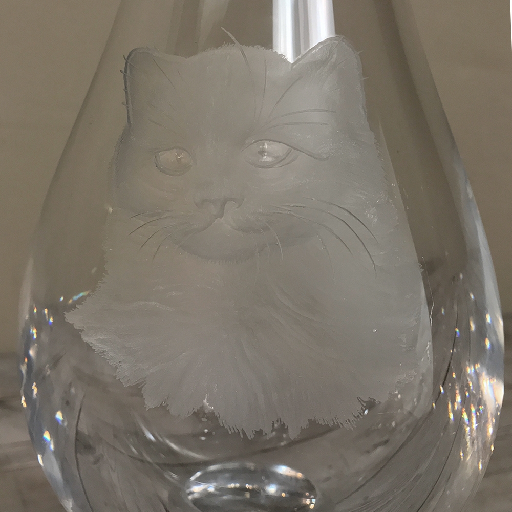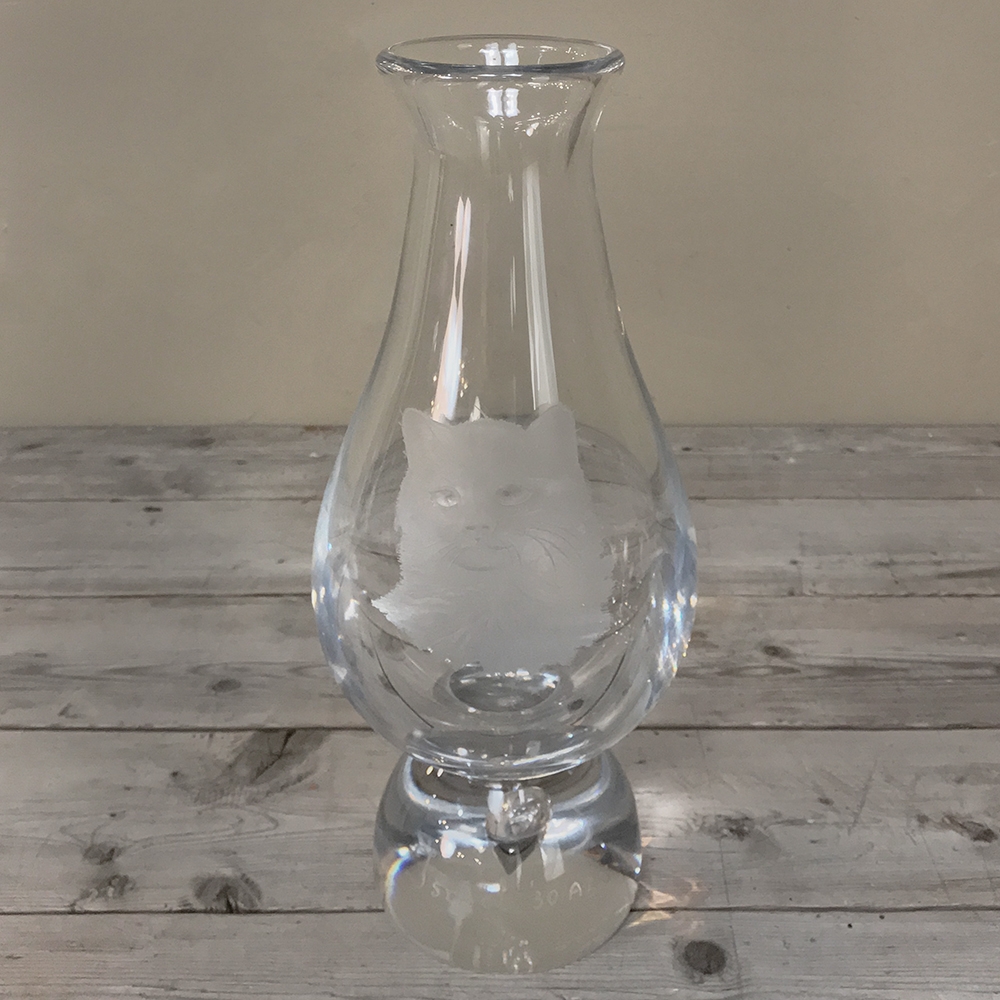 Antique Etched Glass Vase, signed by Val Saint Lambert depicts a remarkably lifelike cat acid-etched into the goblet-shaped vase.