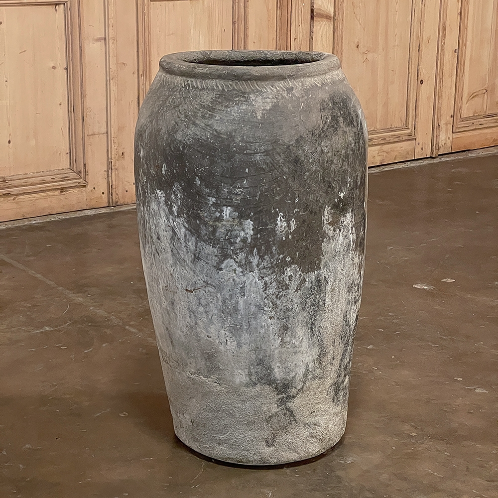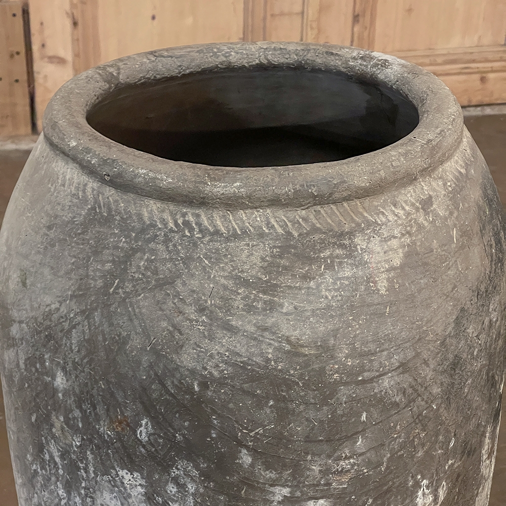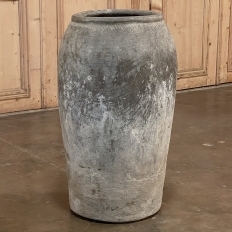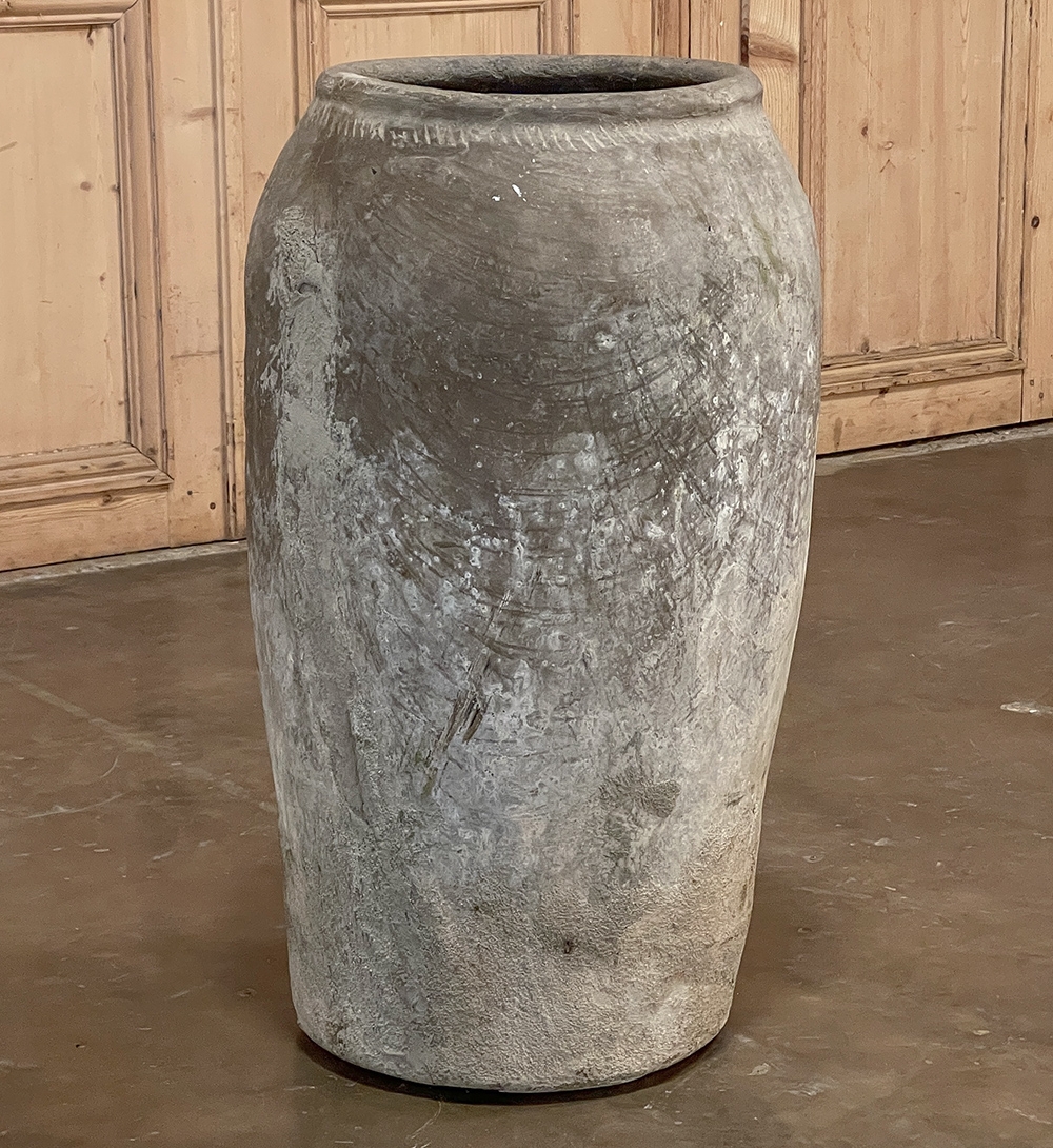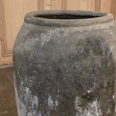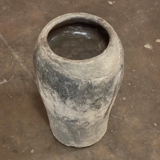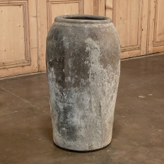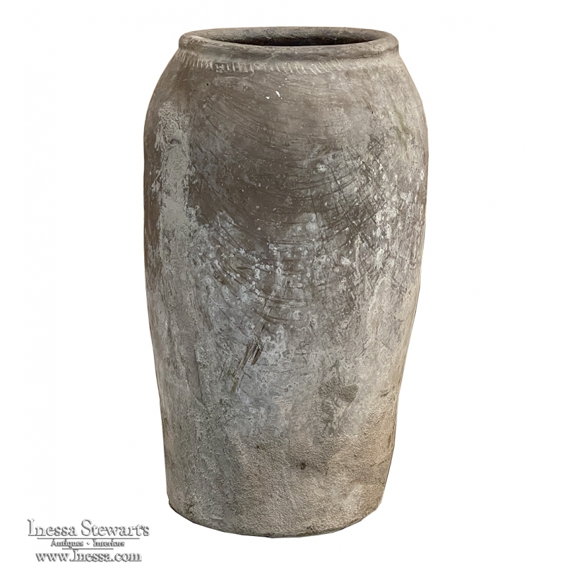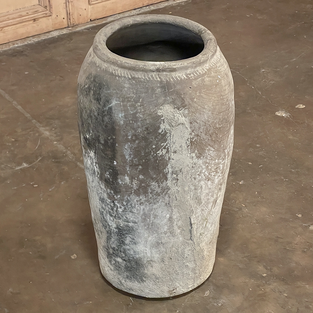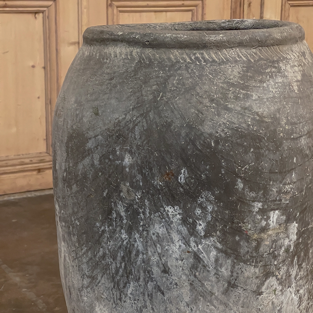 Antique European Terra Cotta Olive Jar will make a great interior accent, or can be used anywhere in the outdoors especially in the garden! Hand-thrown from local clays, it features a classic shape developed over the millennia to retain the most structural strength and last the longest. This example checks both boxes, and provides a lovely visual character in the bargain, with rustic, aged finish naturally acquired over the decades. The gray hues of the clay also make this example much more amenable to blending with color schemes. Such vessels were used to store and transport a wide variety of comestibles and local products over the centuries, and continue today to be highly desirable as garden fixtures, with some even converted for use in fountains.