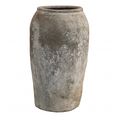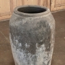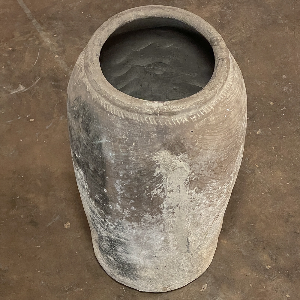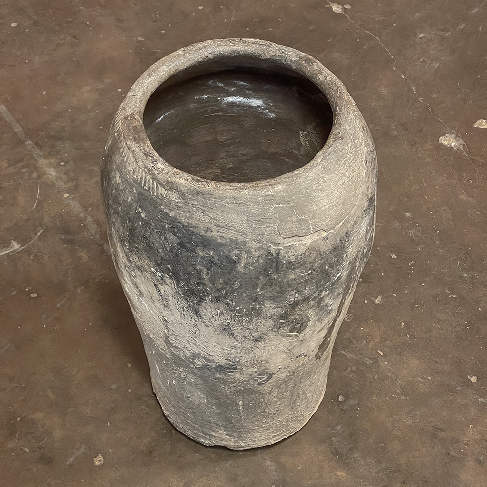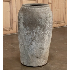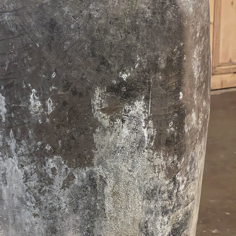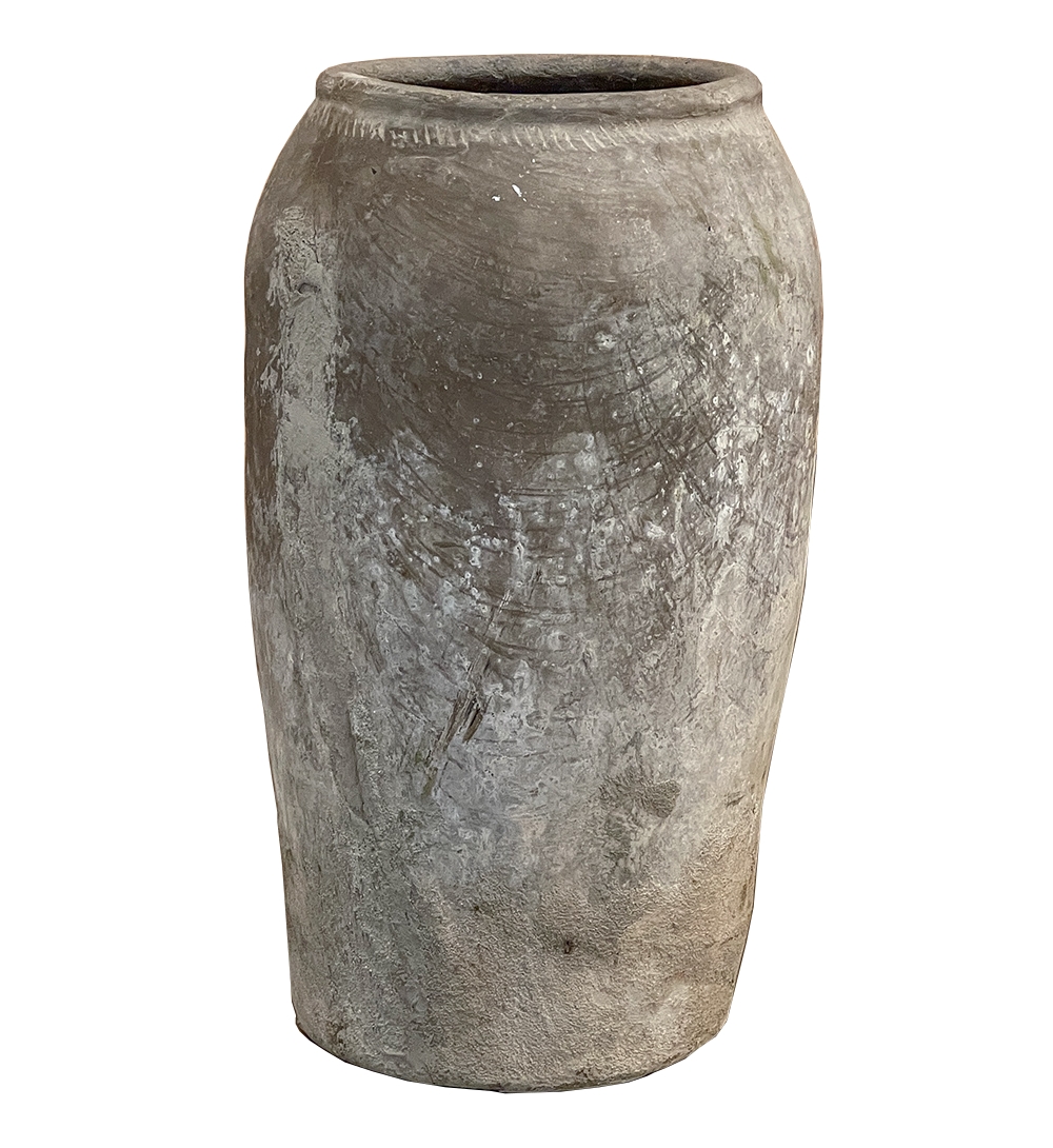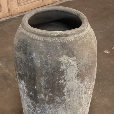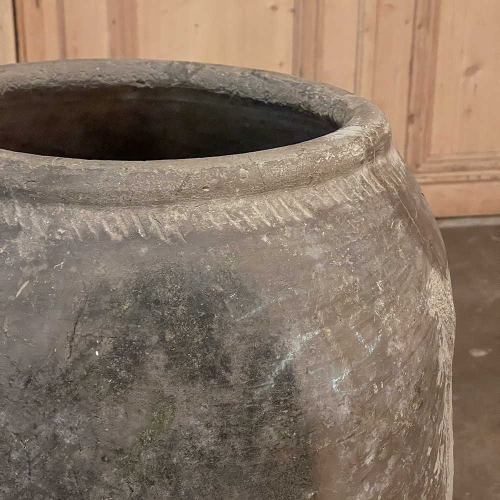 Antique European Terra Cotta Olive Jar will make a great interior accent, or can be used anywhere in the outdoors especially in the garden! Hand-thrown from local clays, it features a classic shape developed over the millennia to retain the most structural strength and last the longest. This example checks both boxes, and provides a lovely visual character in the bargain, with rustic, aged finish naturally acquired over the decades. The gray hues of the clay also make this example much more amenable to blending with color schemes. Such vessels were used to store and transport a wide variety of comestibles and local products over the centuries, and continue today to be highly desirable as garden fixtures, with some even converted for use in fountains.