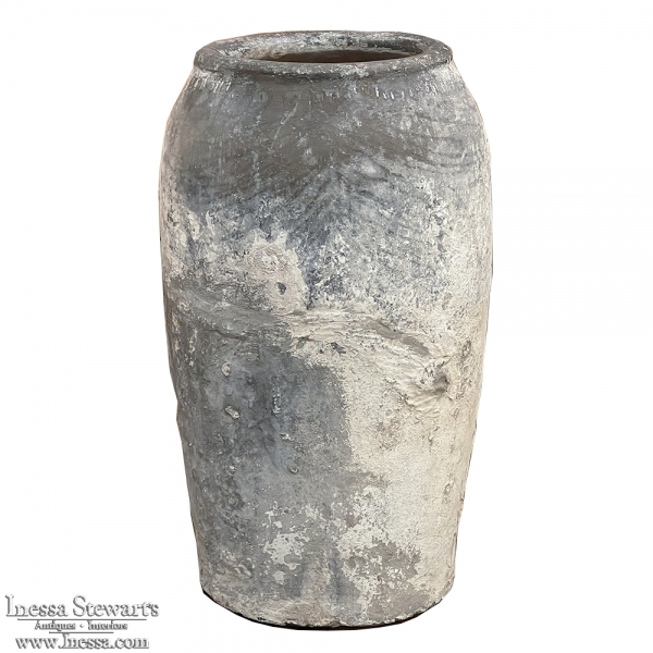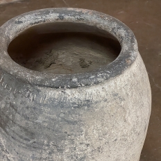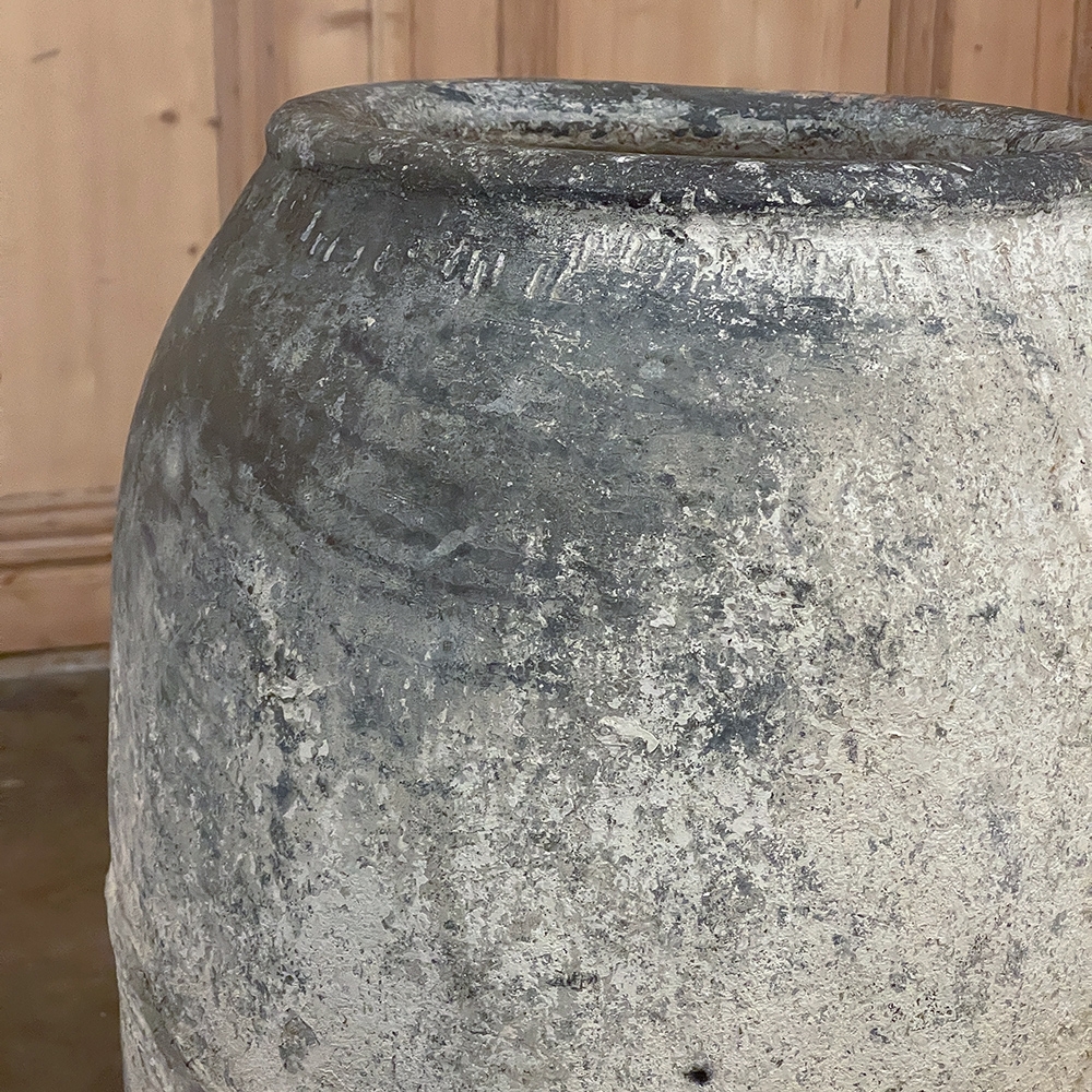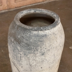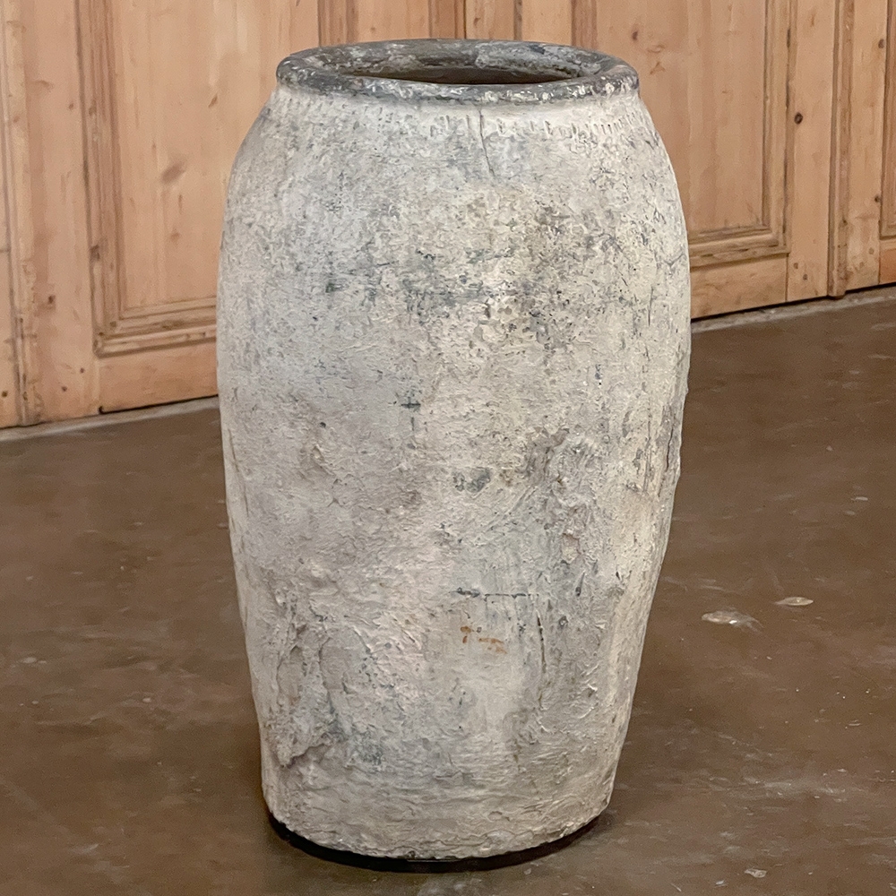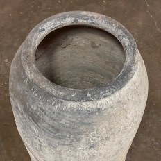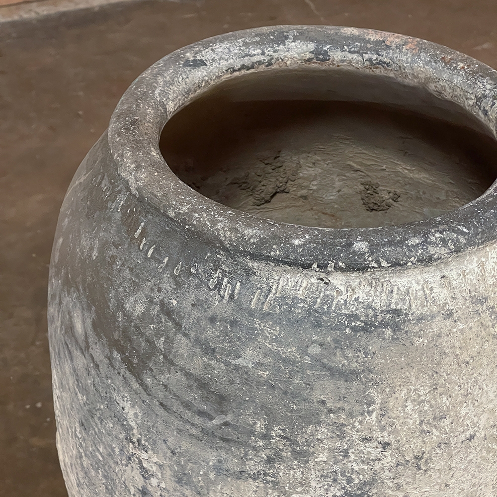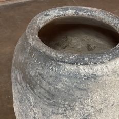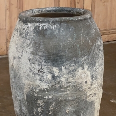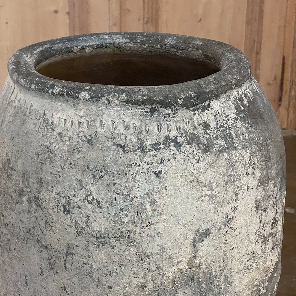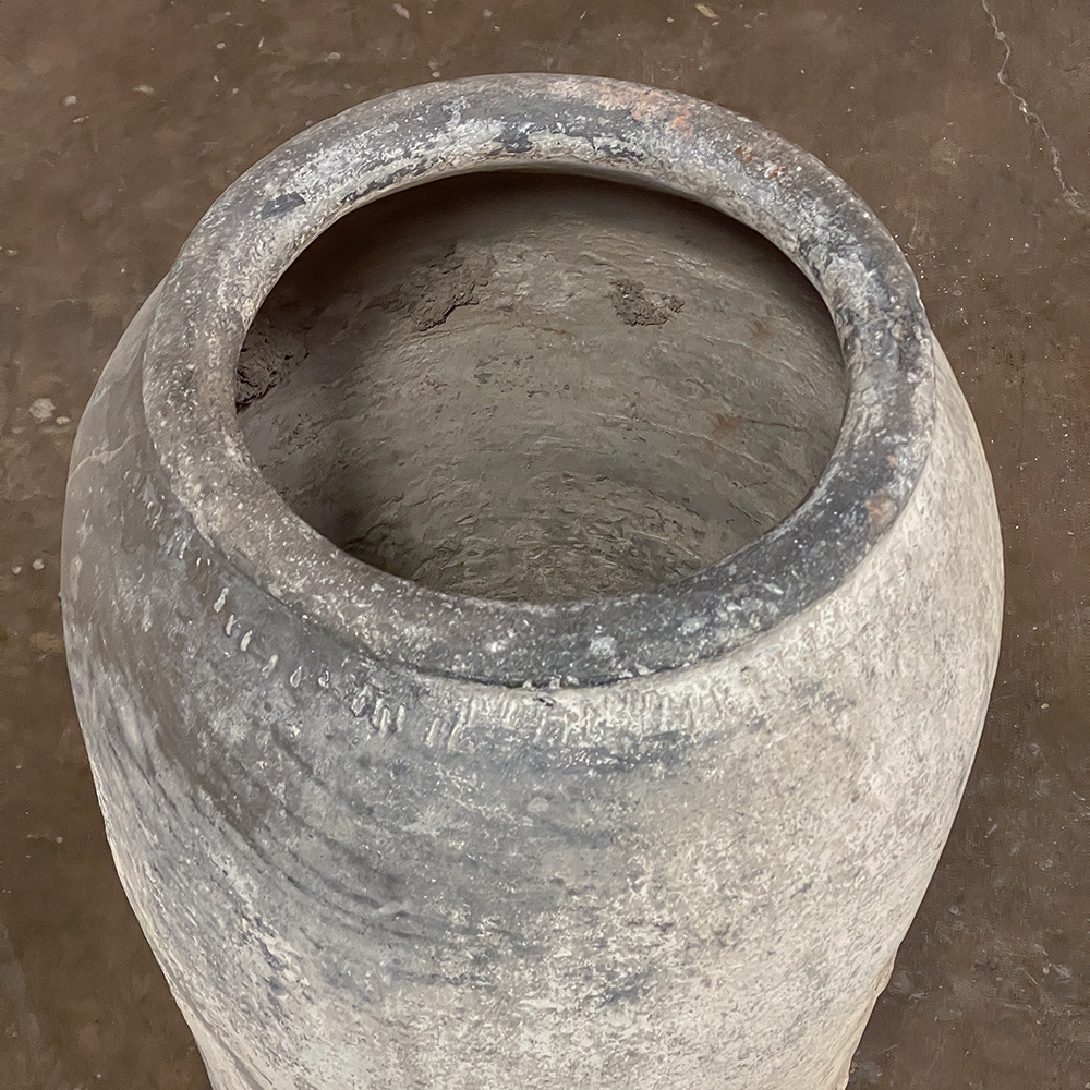 Antique European Terra Cotta Olive Jar will make a great interior accent, or can be used anywhere in the outdoors especially in the garden! Hand-thrown from local clays, it features a classic shape developed over the millennia to retain the most structural strength and last the longest. This example checks both boxes, and provides a lovely visual character in the bargain, with rustic, aged finish naturally acquired over the decades. The gray hues of the clay also make this example much more amenable to blending with color schemes. Such vessels were used to store and transport a wide variety of comestibles and local products over the centuries, and continue today to be highly desirable as garden fixtures, with some even converted for use in fountains.
