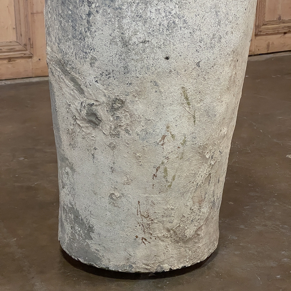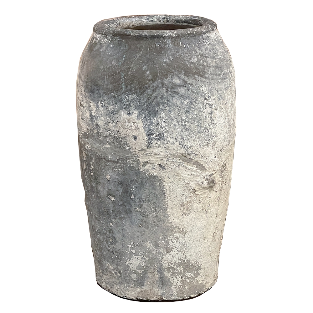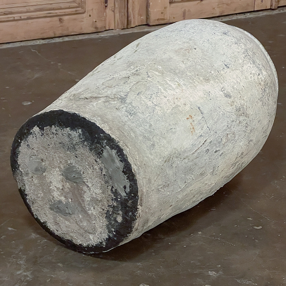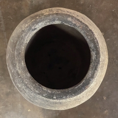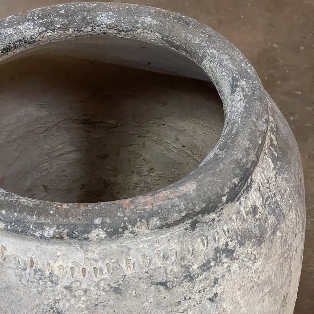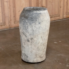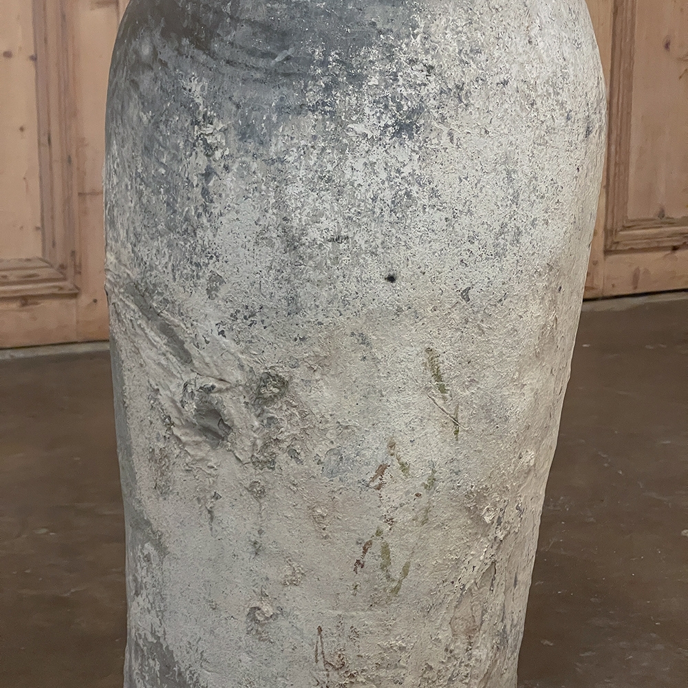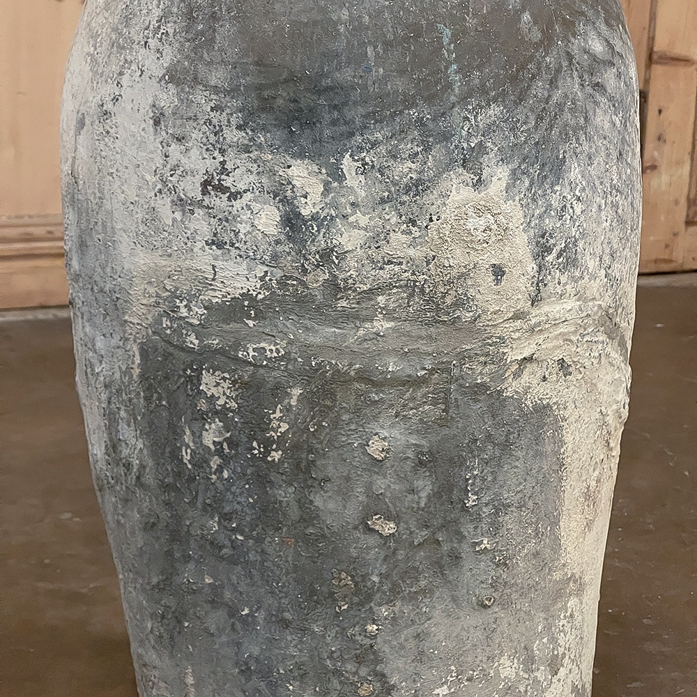 Antique European Terra Cotta Olive Jar will make a great interior accent, or can be used anywhere in the outdoors especially in the garden! Hand-thrown from local clays, it features a classic shape developed over the millennia to retain the most structural strength and last the longest. This example checks both boxes, and provides a lovely visual character in the bargain, with rustic, aged finish naturally acquired over the decades. The gray hues of the clay also make this example much more amenable to blending with color schemes. Such vessels were used to store and transport a wide variety of comestibles and local products over the centuries, and continue today to be highly desirable as garden fixtures, with some even converted for use in fountains.