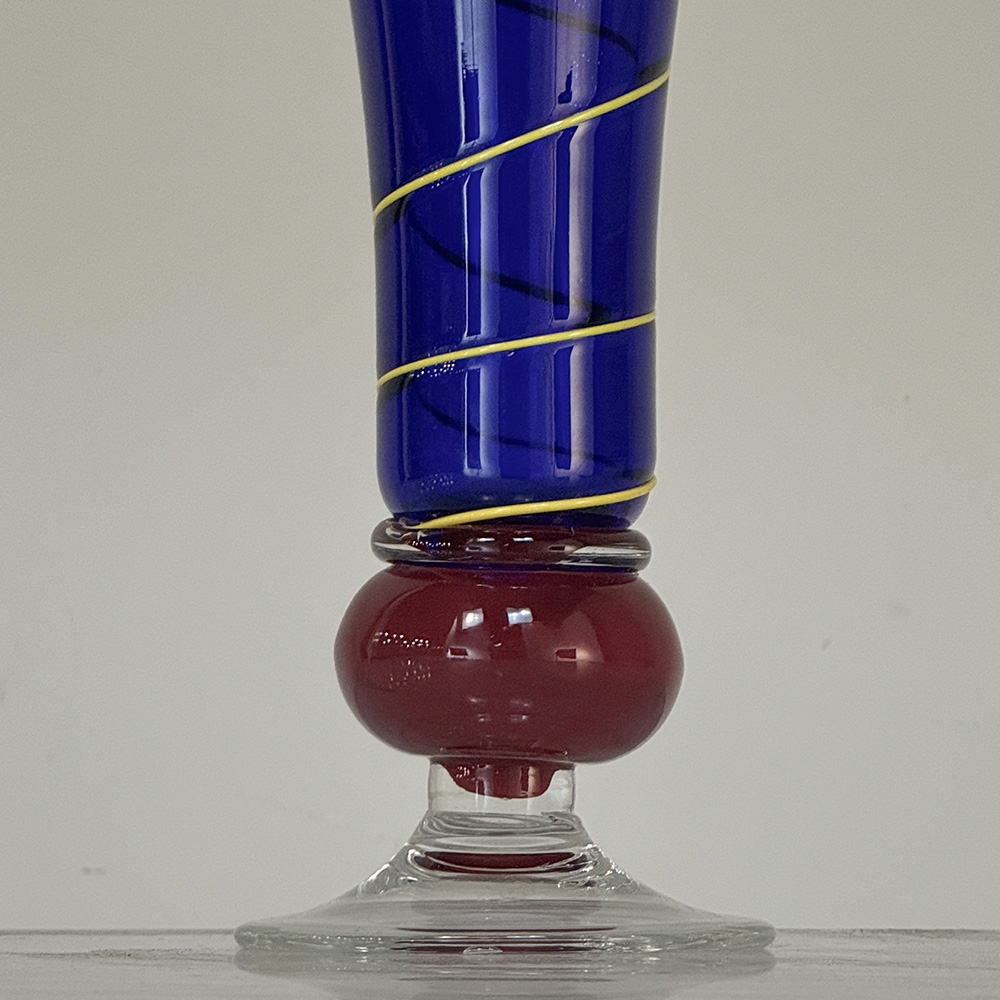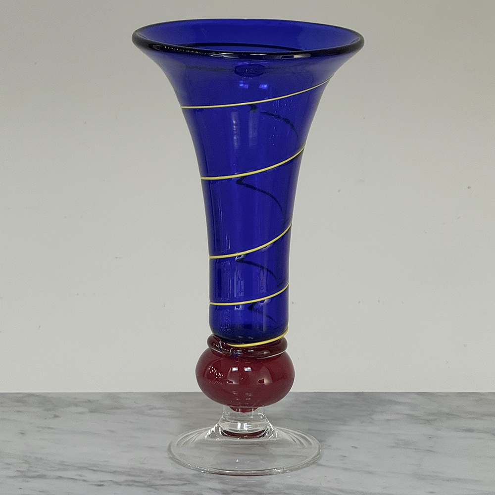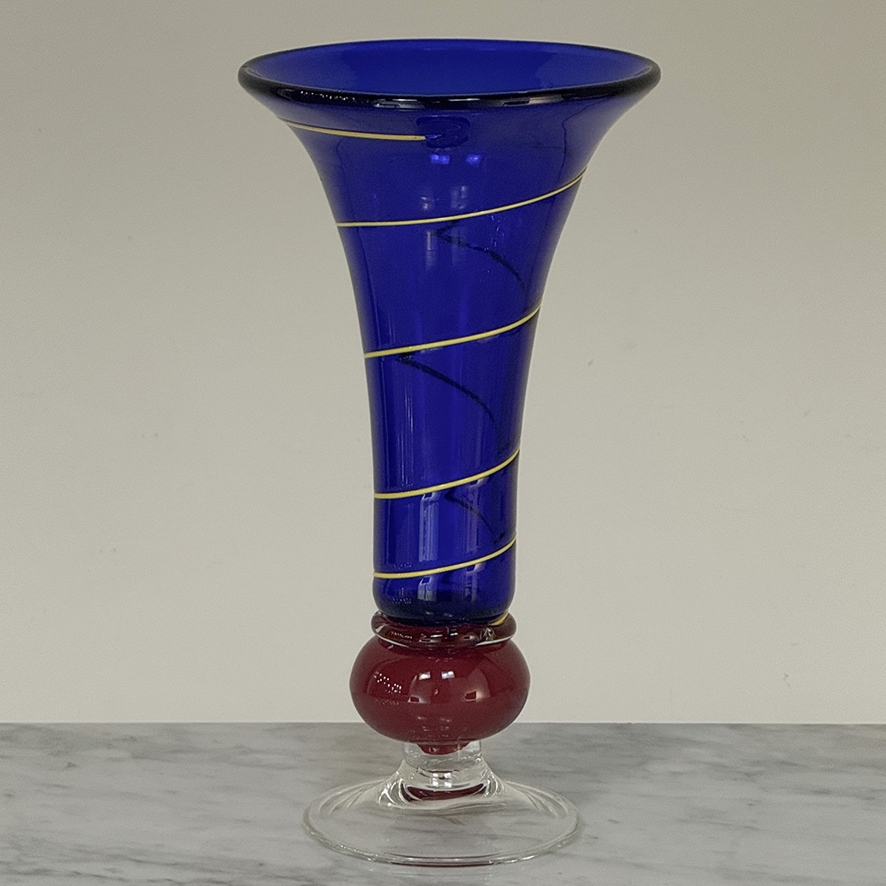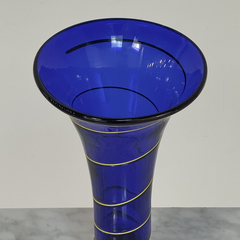 Art Deco Cobalt Blue & Copper Glass Vase with Spiral Design is Italian in origin, where master glass craftsmen have been practicing their trade for centuries. The red bulbous base contrasts nicely with the cobalt blue shaded vase form, which has been enhanced with a spiral strip from top to bottom adding visual intrigue.