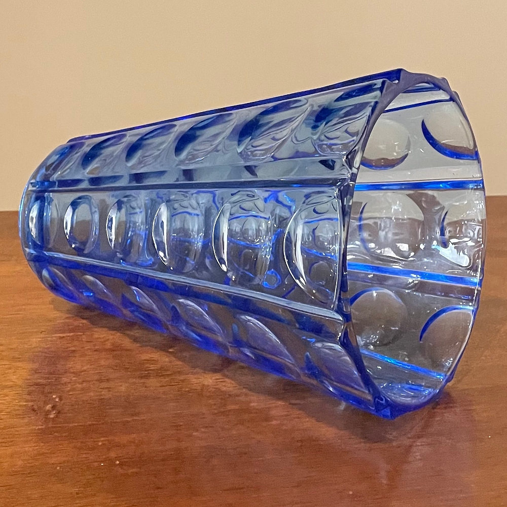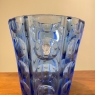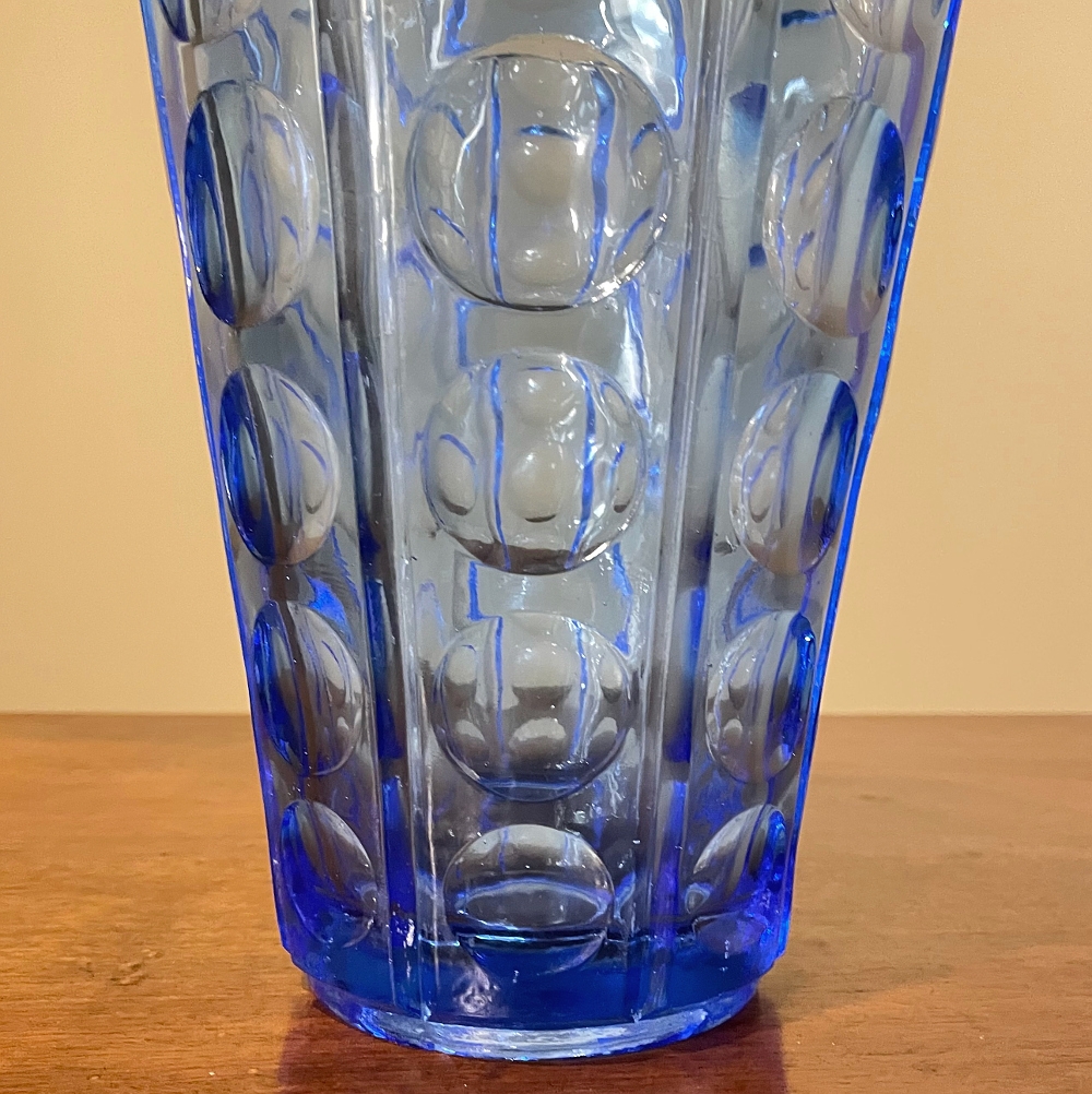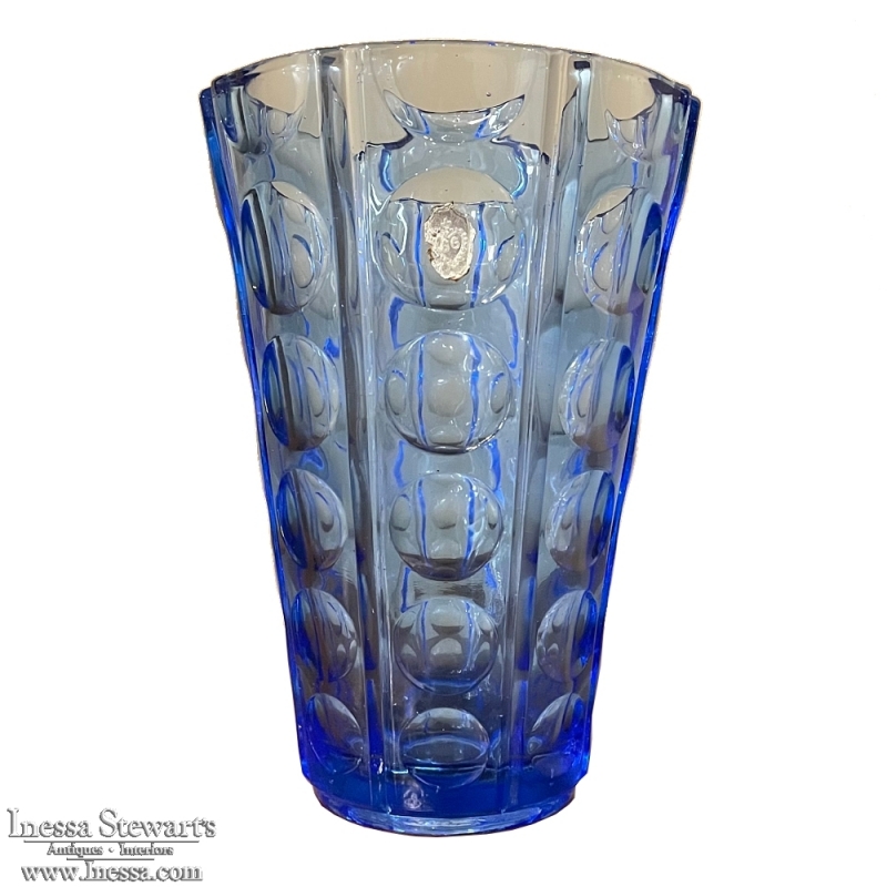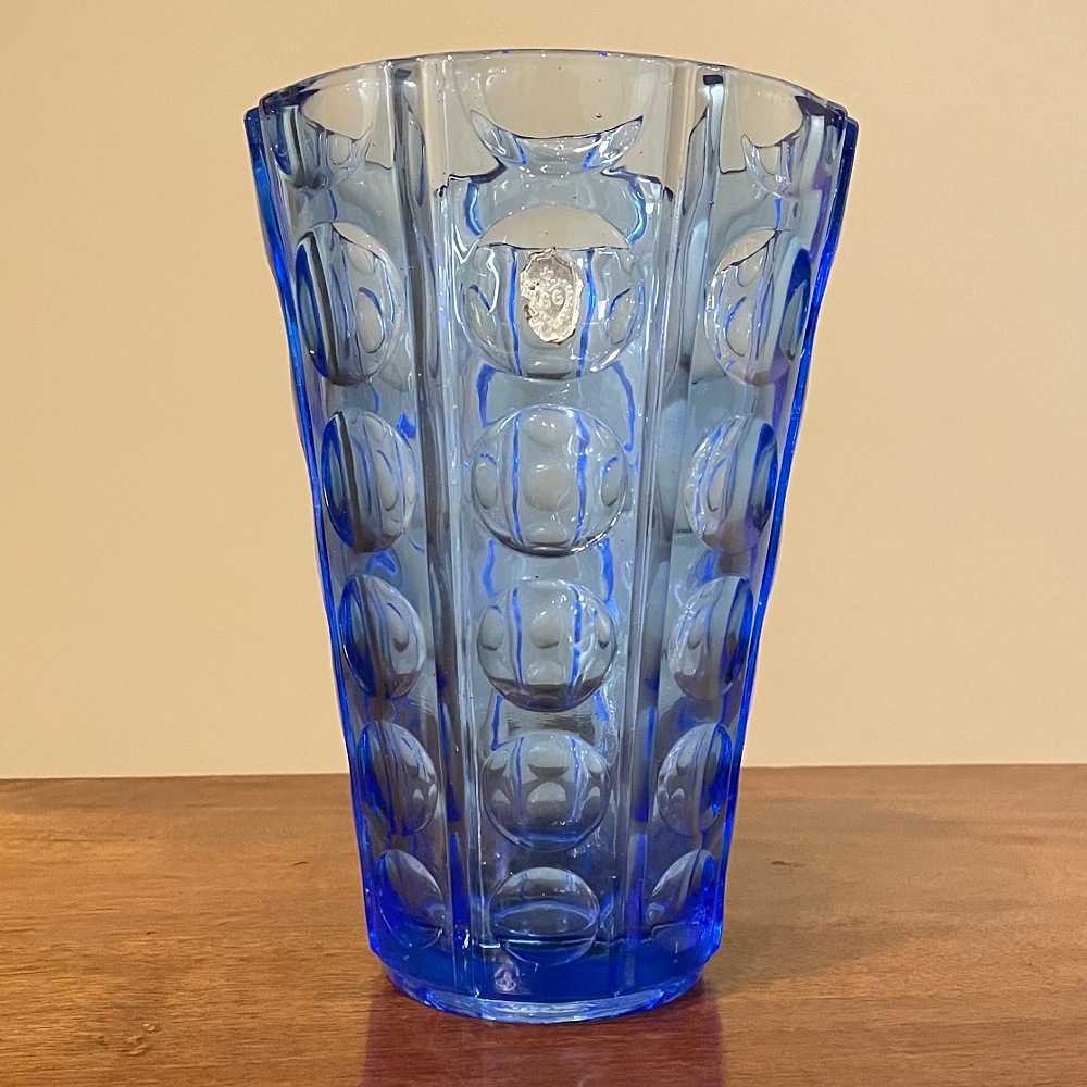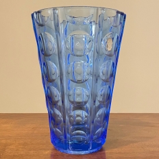 Mid-Century Blue Glass Vase by Saint Gobain is an attractive, ornamental accessory created by the glassworkers of the storied company that dates back 350 years! Founded by Louis XIV to originally create primarily windows and mirrors, it was no doubt employed in the creation of his architectural masterpiece at Versailles. Continuously operating for over three centuries, during the middle of the 20th century the company diversified into a wider variety of glass products, this vase being one of them. The blue coloration is a rich cobalt hue, with pressed indentations for visual effect.