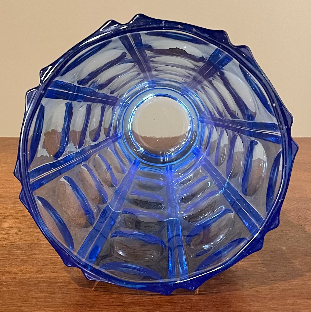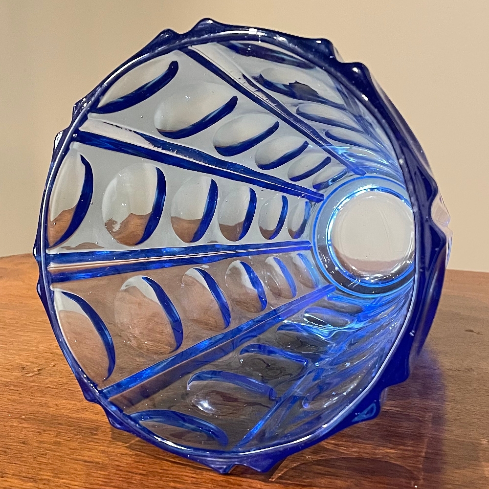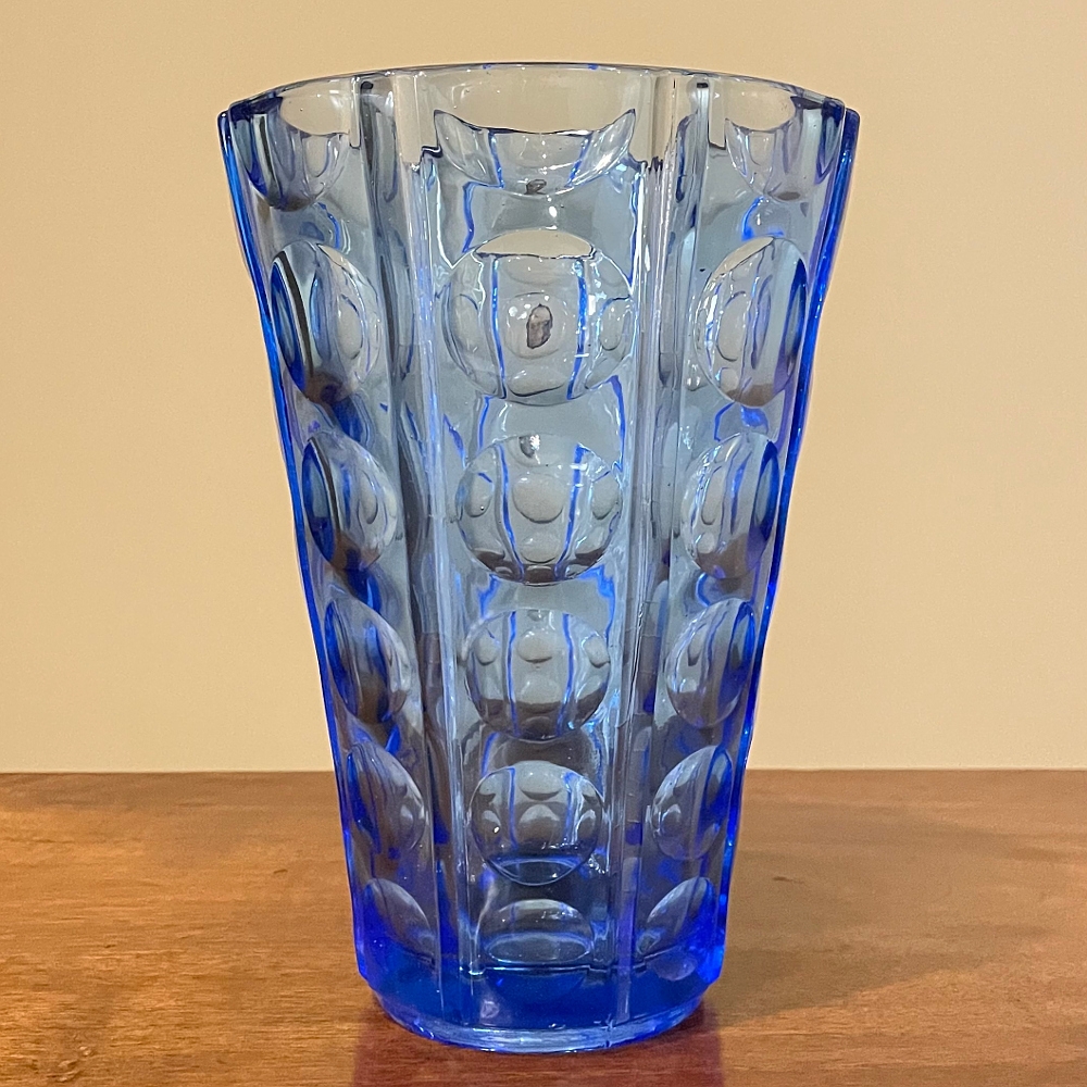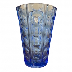Mid-Century Blue Glass Vase by Saint Gobain is an attractive, ornamental accessory created by the glassworkers of the storied company that dates back 350 years! Founded by Louis XIV to originally create primarily windows and mirrors, it was no doubt employed in the creation of his architectural masterpiece at Versailles. Continuously operating for over three centuries, during the middle of the 20th century the company diversified into a wider variety of glass products, this vase being one of them. The blue coloration is a rich cobalt hue, with pressed indentations for visual effect.