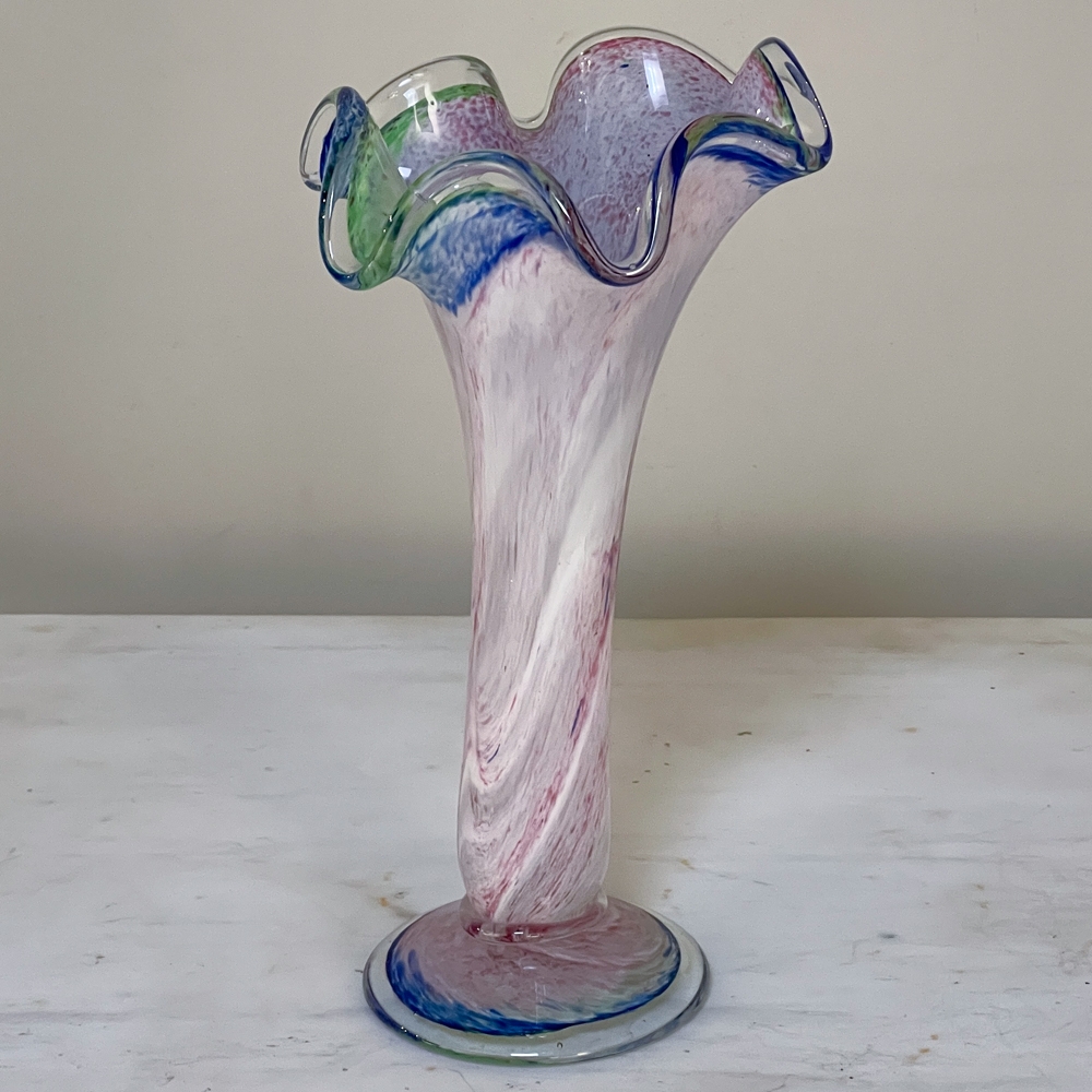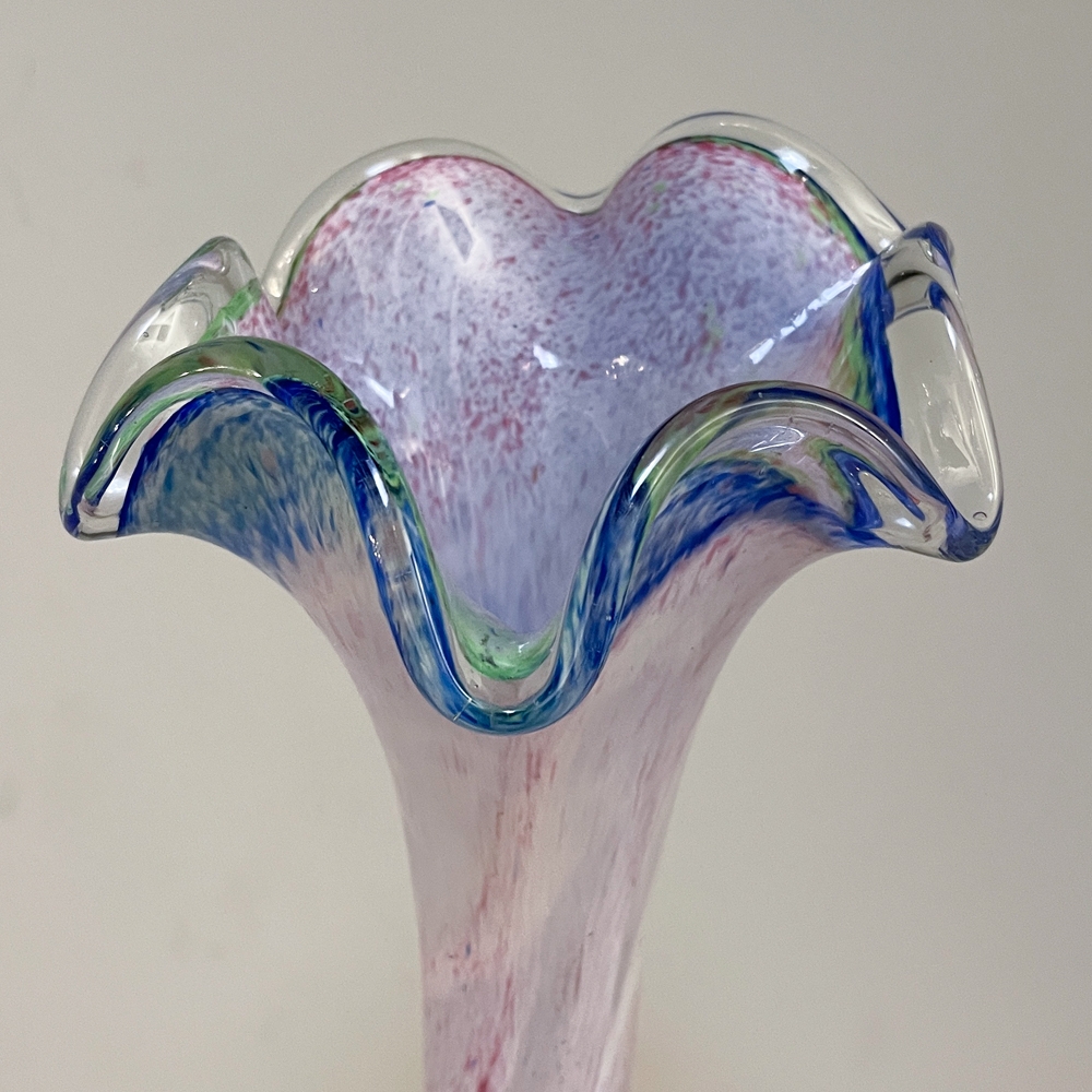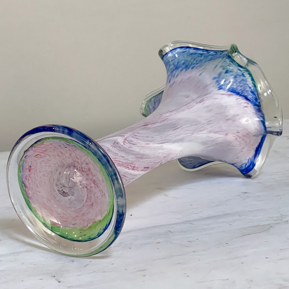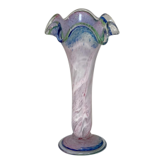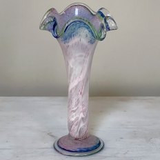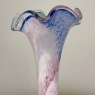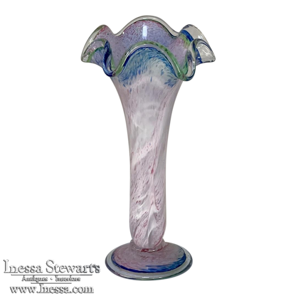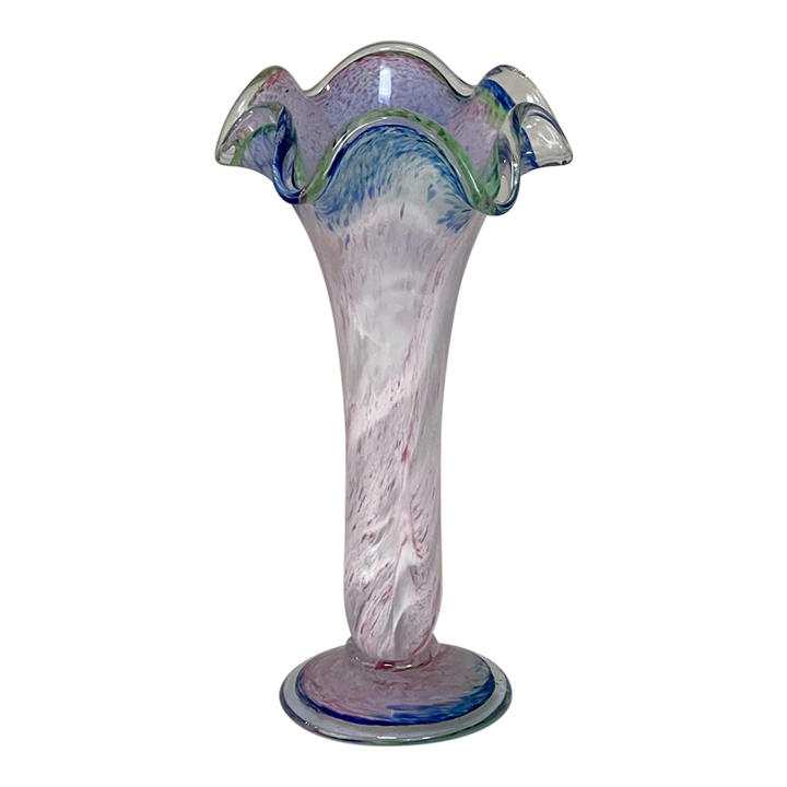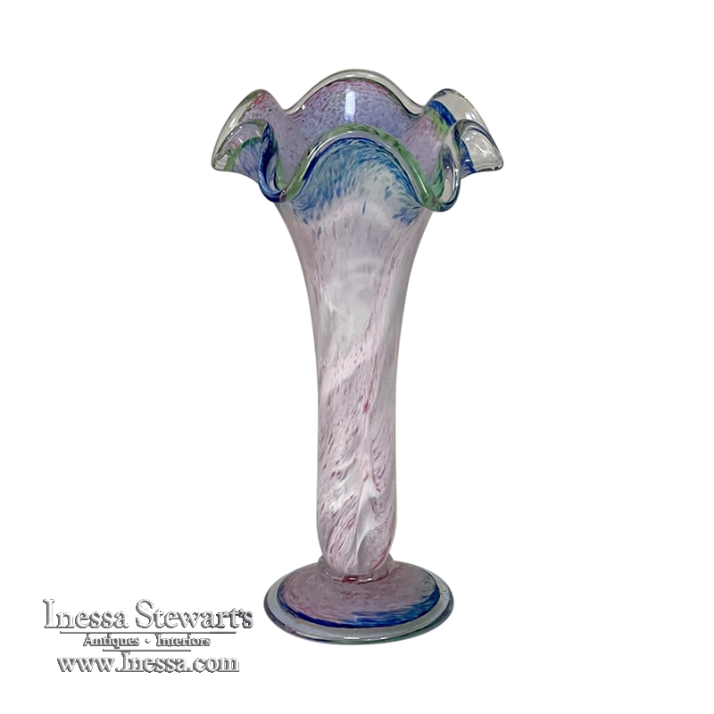 Mid-Century Murano Glass Ruffled Top Vase is a wonderful example of the skill and artistry in decorative glass that has a hallmark of the community outside of Venice for centuries! Flared and scalloped rim and circular base provide a great vessel for displaying fresh flowers, and the interesting patterns in the glass in cobalt blue and lavender colors with just a touch of forest green create such visual appeal that one doesn't need flowers to use it for decoration!
