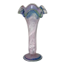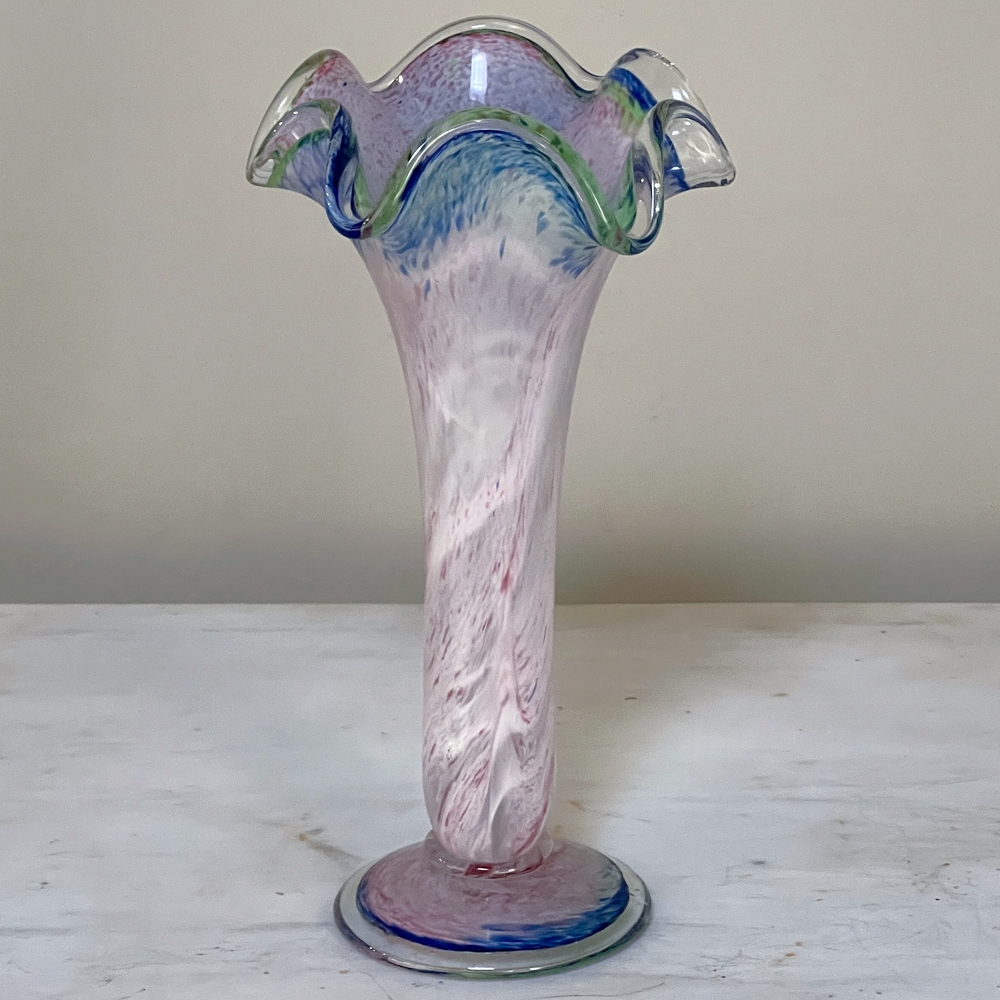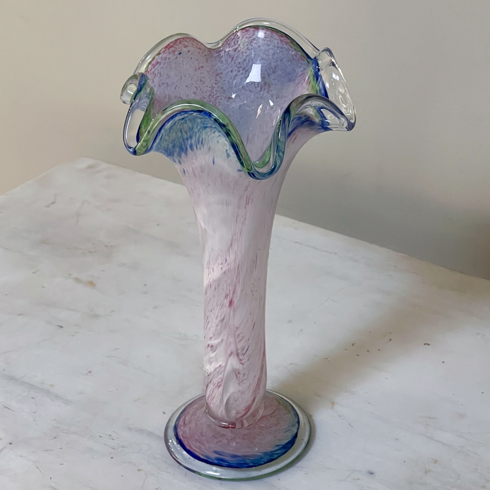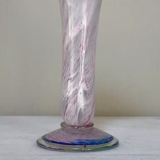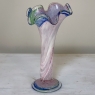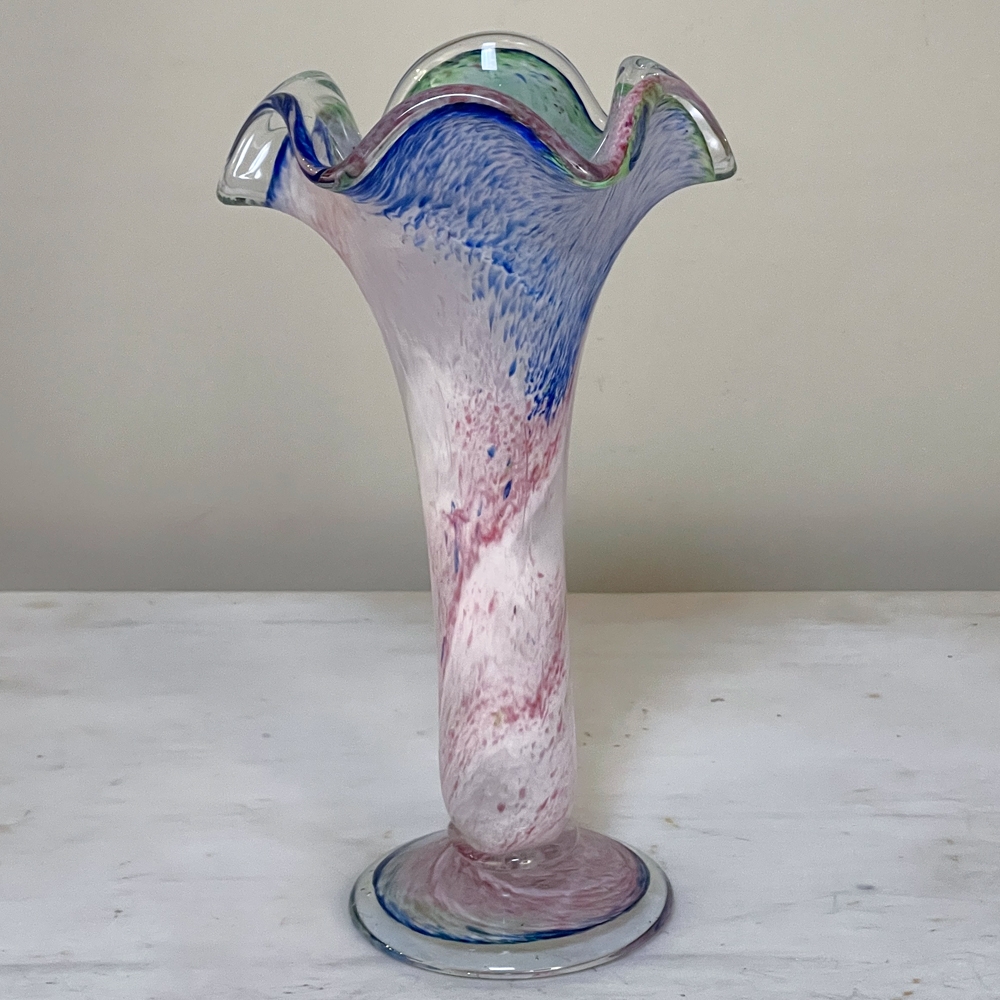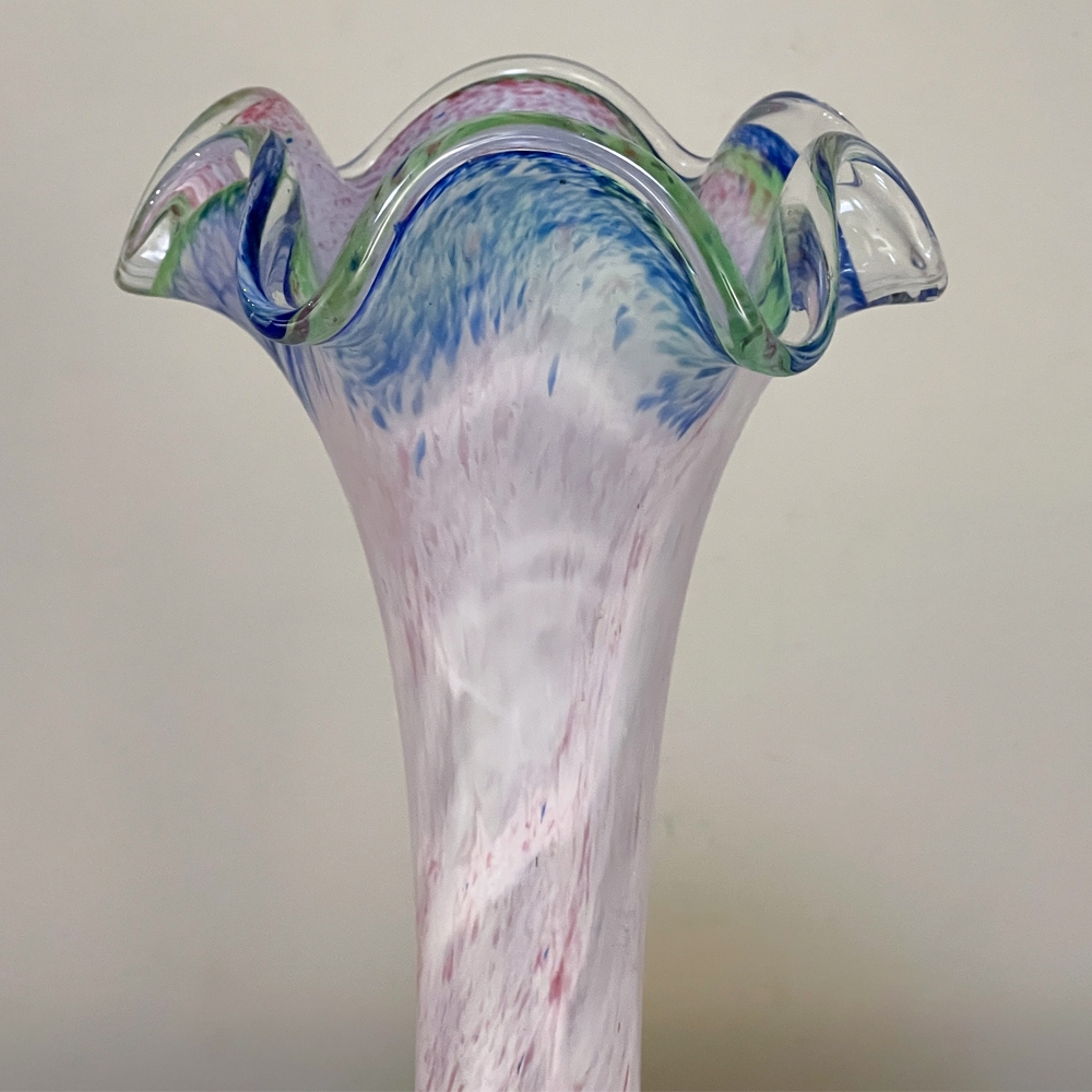 Mid-Century Murano Glass Ruffled Top Vase is a wonderful example of the skill and artistry in decorative glass that has a hallmark of the community outside of Venice for centuries! Flared and scalloped rim and circular base provide a great vessel for displaying fresh flowers, and the interesting patterns in the glass in cobalt blue and lavender colors with just a touch of forest green create such visual appeal that one doesn't need flowers to use it for decoration!