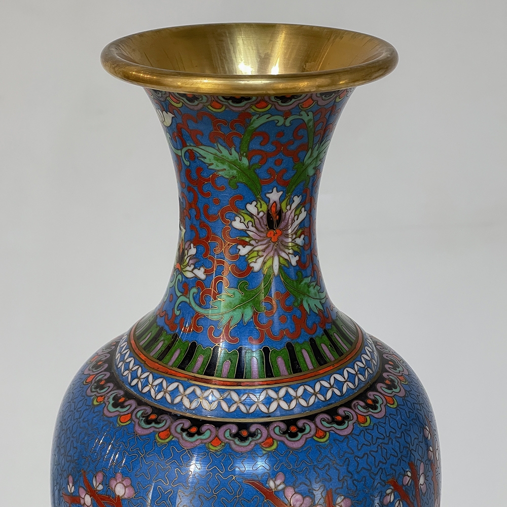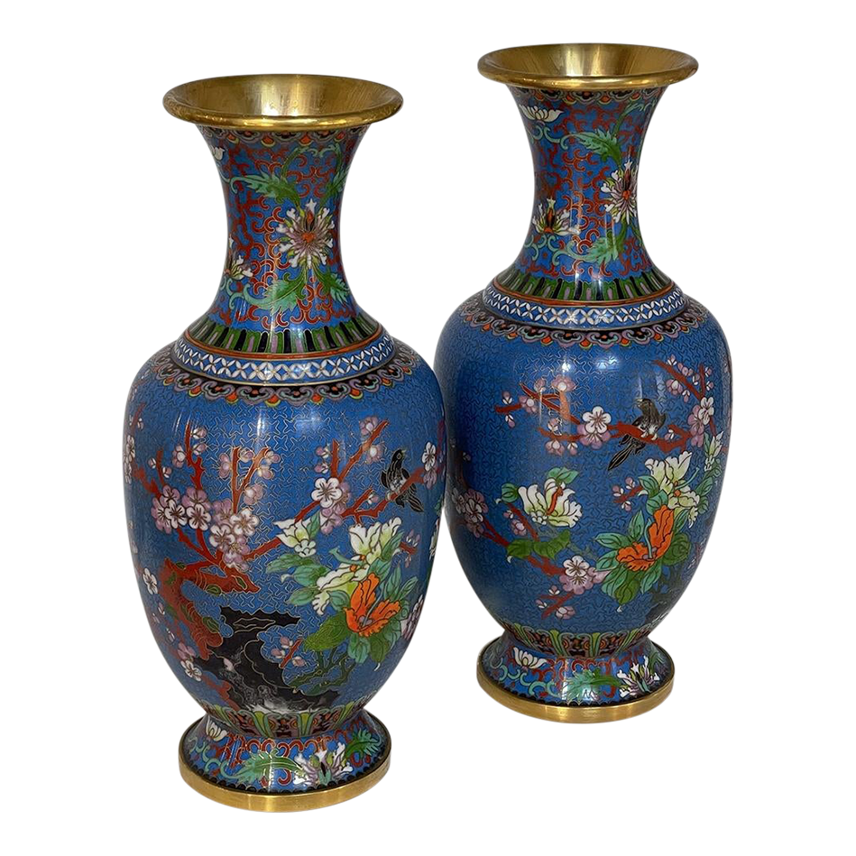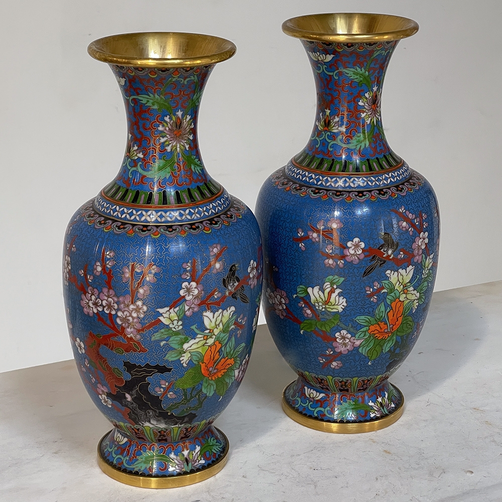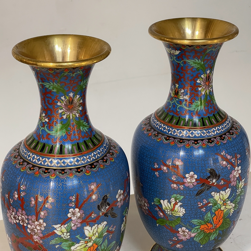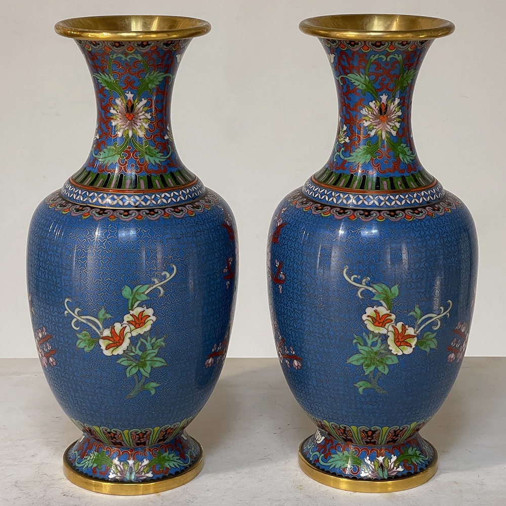 Pair 19th Century Cloissone Vases is an extraordinary example of the breed, displaying its well-preserved, rich coloration and exhibiting a large format design theme celebrating the natural beauty of flowers. Decorated in the round, brass wire was carefully affixed to the brass vase, then the spaces created were filled with various colors of enamel, with the resulting product being fired one last time to create the exquisite works of art before you. Cloissone techniques originated in the Far Orient, and were copied by many nations including France, which chose to call the process Champleve. This pair feature the most popular combinations of colors with a rich dark cerulean blue as the background making the colorful flowers burst to life!