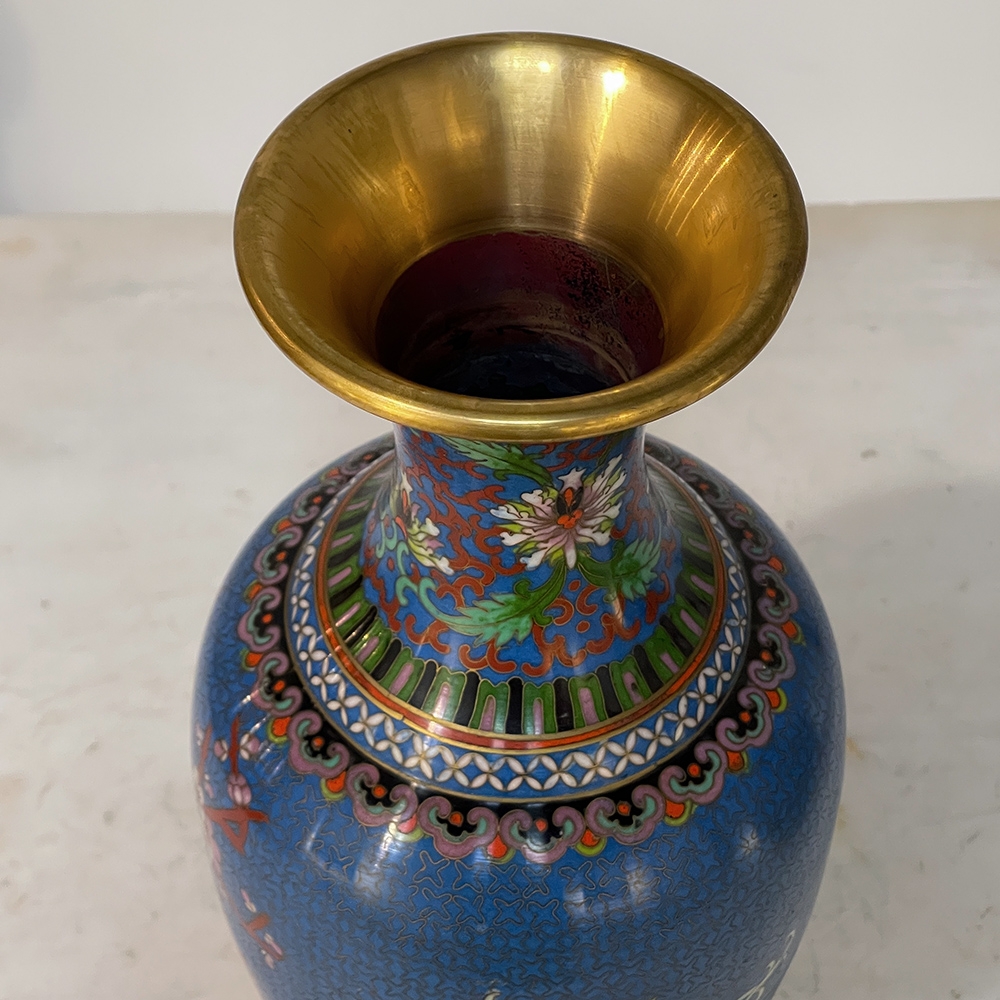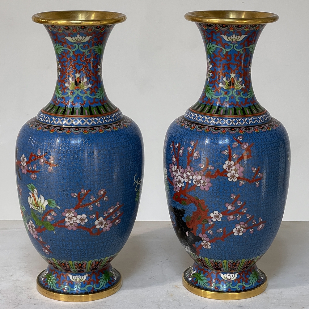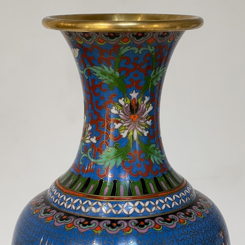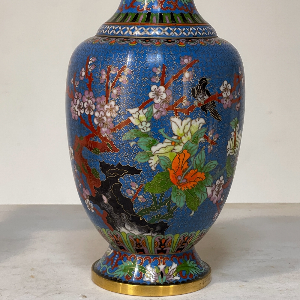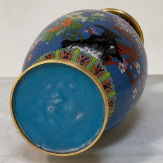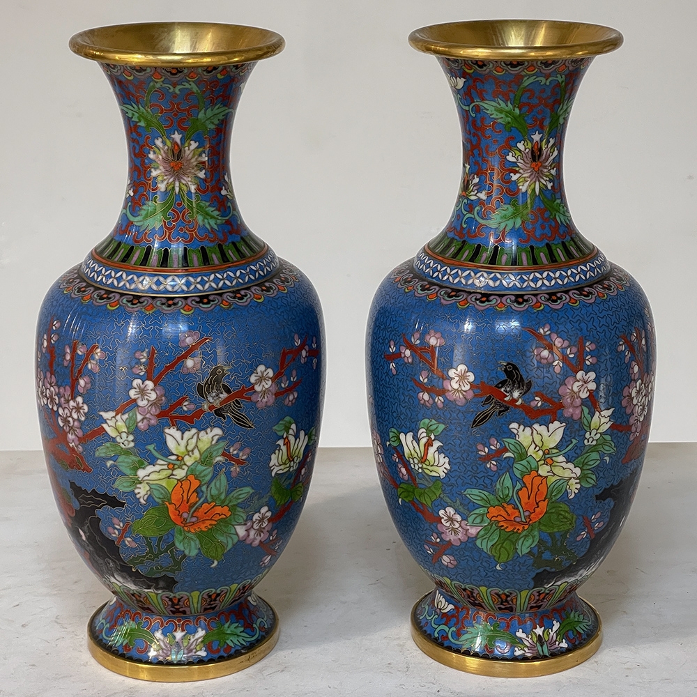 Pair 19th Century Cloissone Vases is an extraordinary example of the breed, displaying its well-preserved, rich coloration and exhibiting a large format design theme celebrating the natural beauty of flowers. Decorated in the round, brass wire was carefully affixed to the brass vase, then the spaces created were filled with various colors of enamel, with the resulting product being fired one last time to create the exquisite works of art before you. Cloissone techniques originated in the Far Orient, and were copied by many nations including France, which chose to call the process Champleve. This pair feature the most popular combinations of colors with a rich dark cerulean blue as the background making the colorful flowers burst to life!