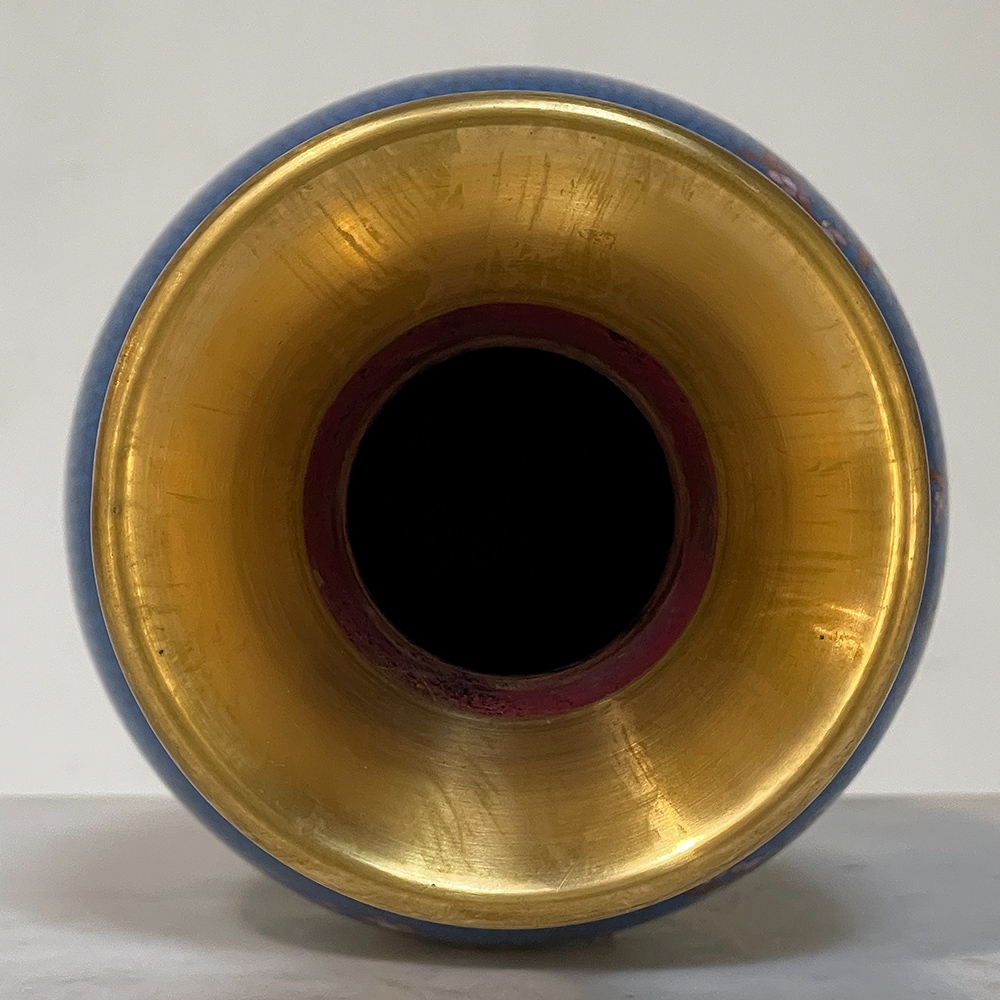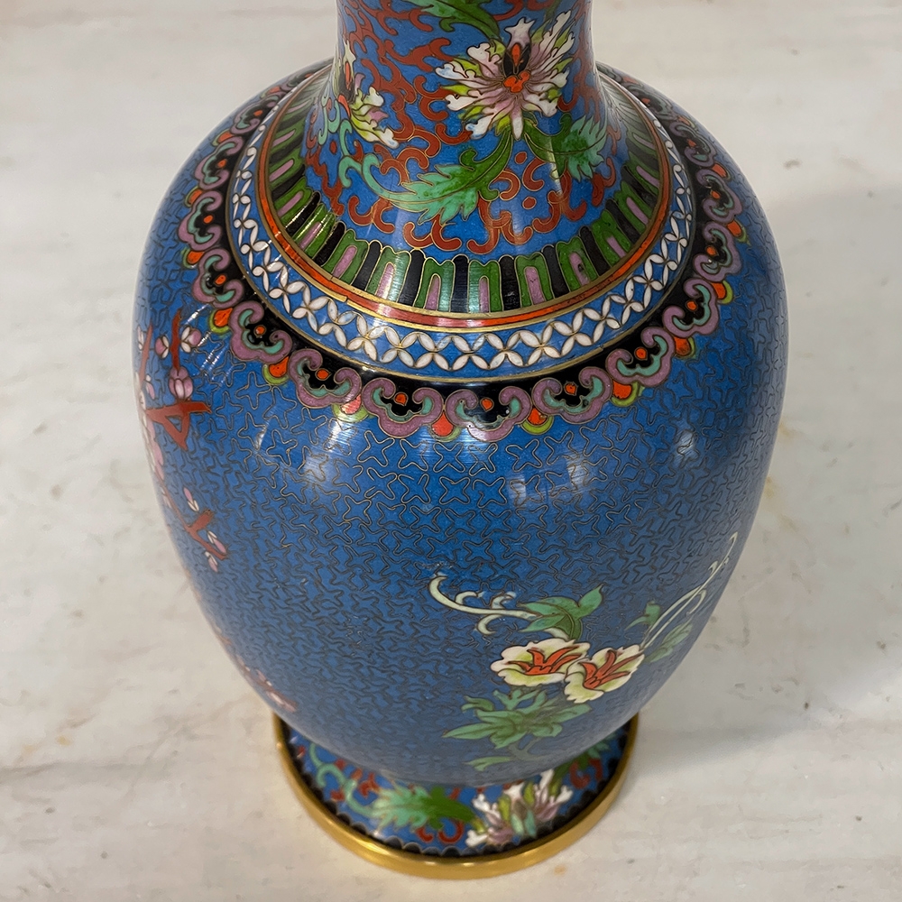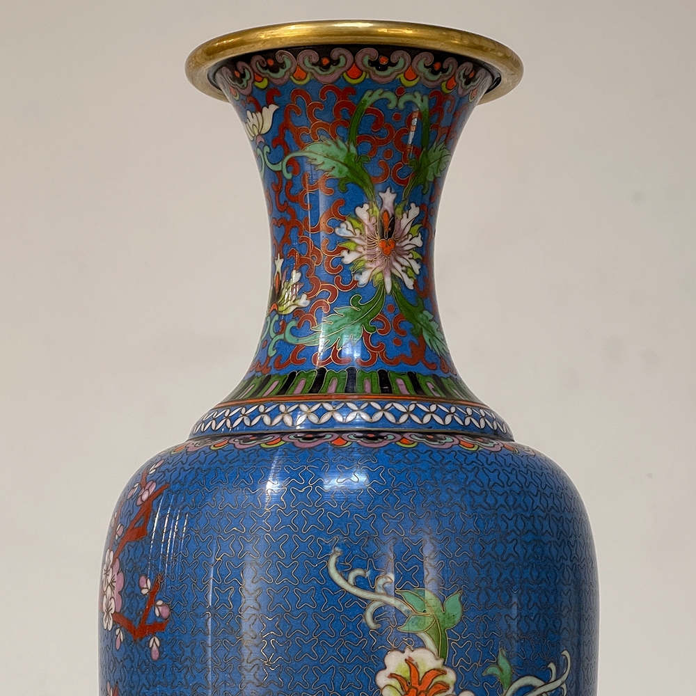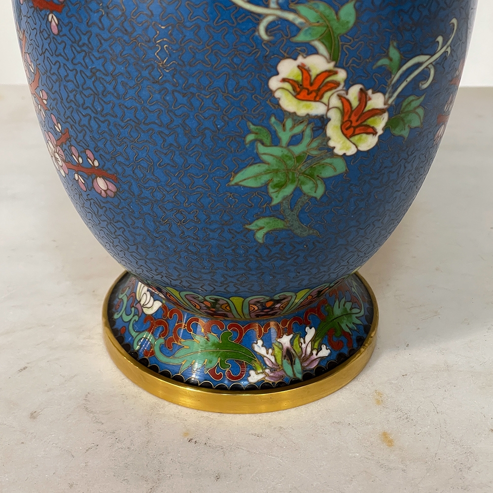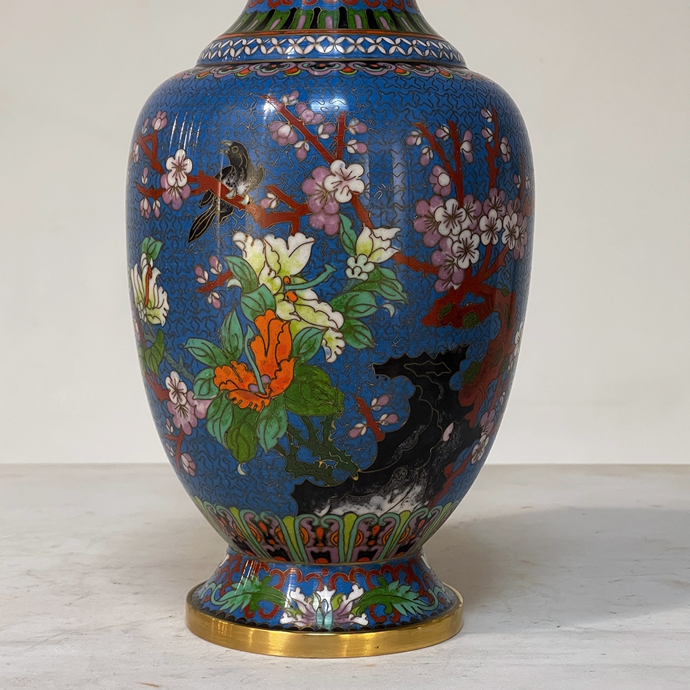 Pair 19th Century Cloissone Vases is an extraordinary example of the breed, displaying its well-preserved, rich coloration and exhibiting a large format design theme celebrating the natural beauty of flowers. Decorated in the round, brass wire was carefully affixed to the brass vase, then the spaces created were filled with various colors of enamel, with the resulting product being fired one last time to create the exquisite works of art before you. Cloissone techniques originated in the Far Orient, and were copied by many nations including France, which chose to call the process Champleve. This pair feature the most popular combinations of colors with a rich dark cerulean blue as the background making the colorful flowers burst to life!