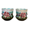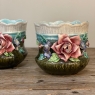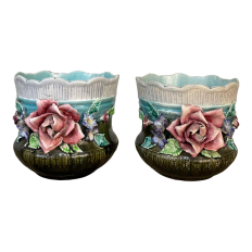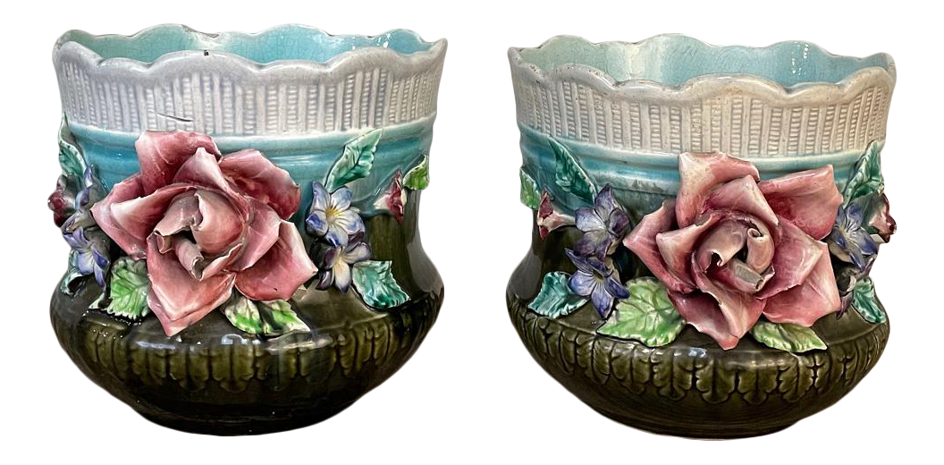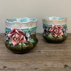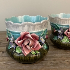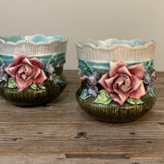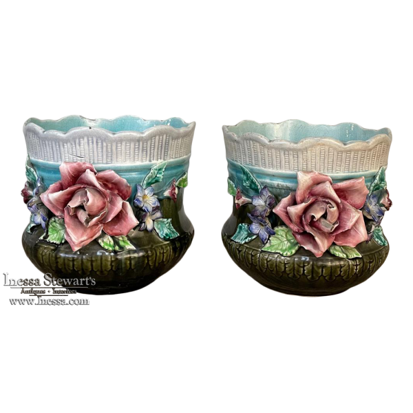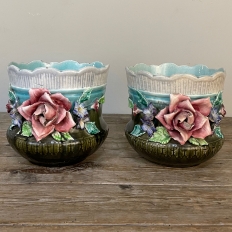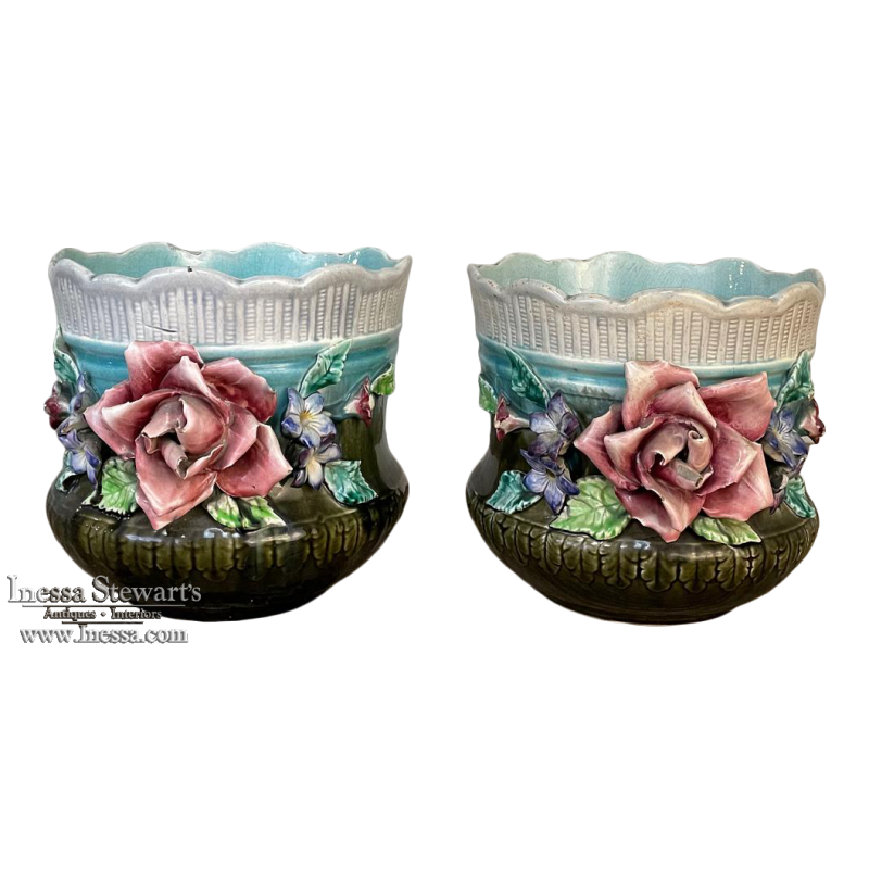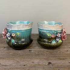 Pair 19th Century French Faience Barbotine Jardinieres ~ Cachet Pots