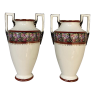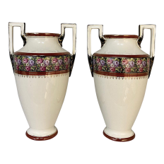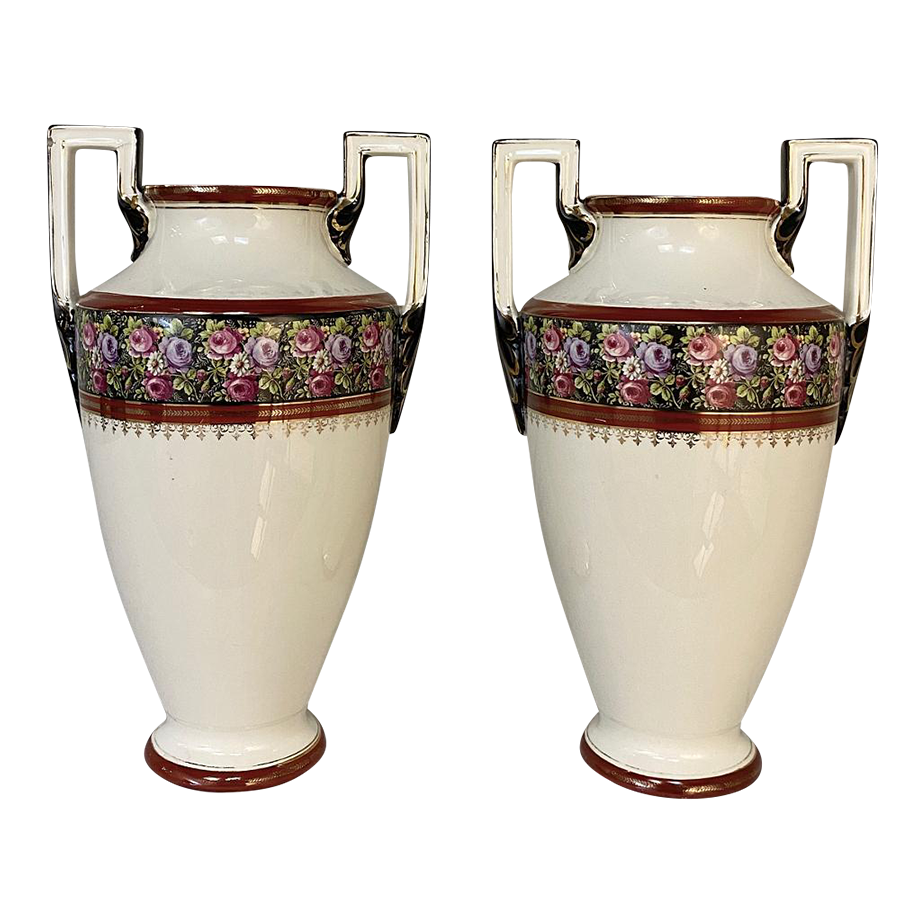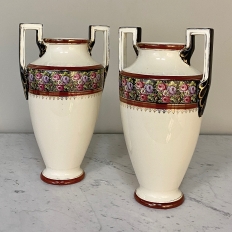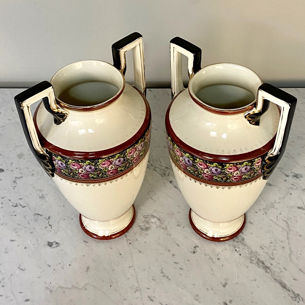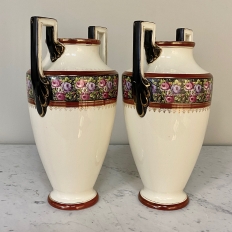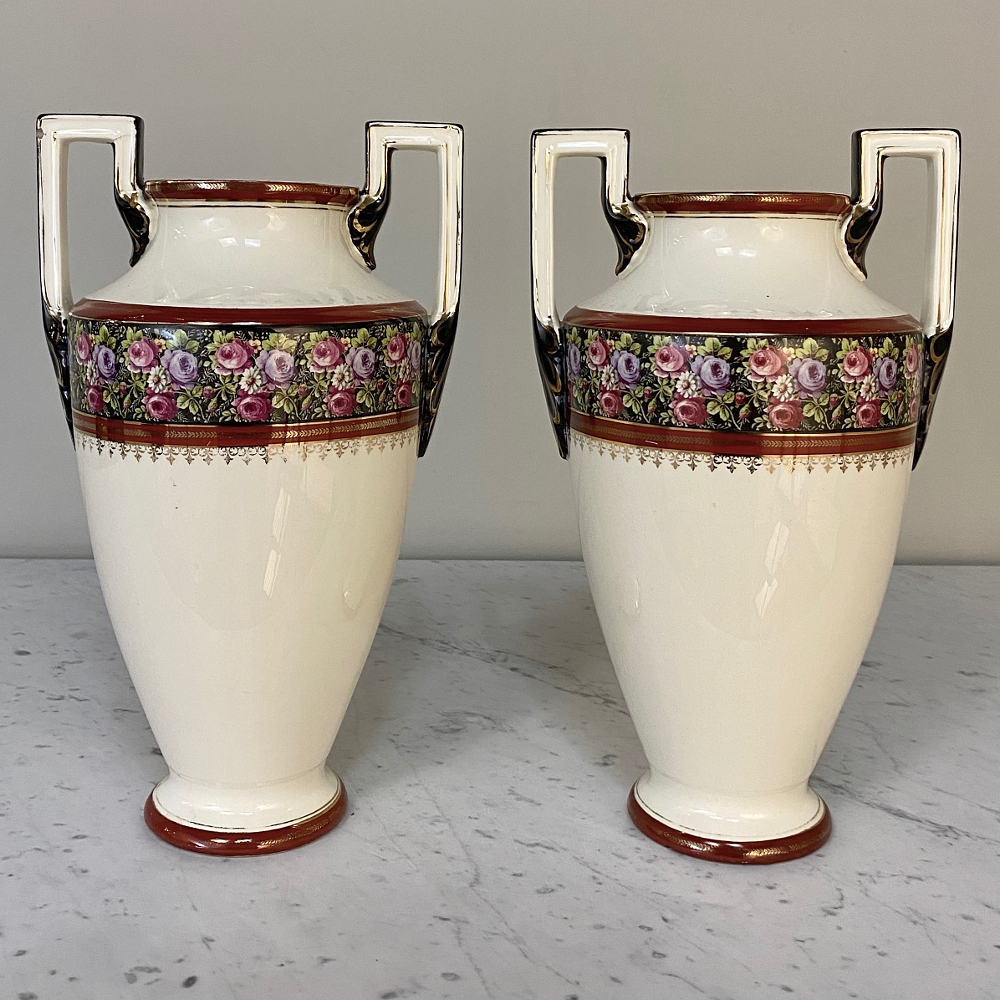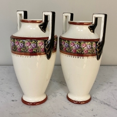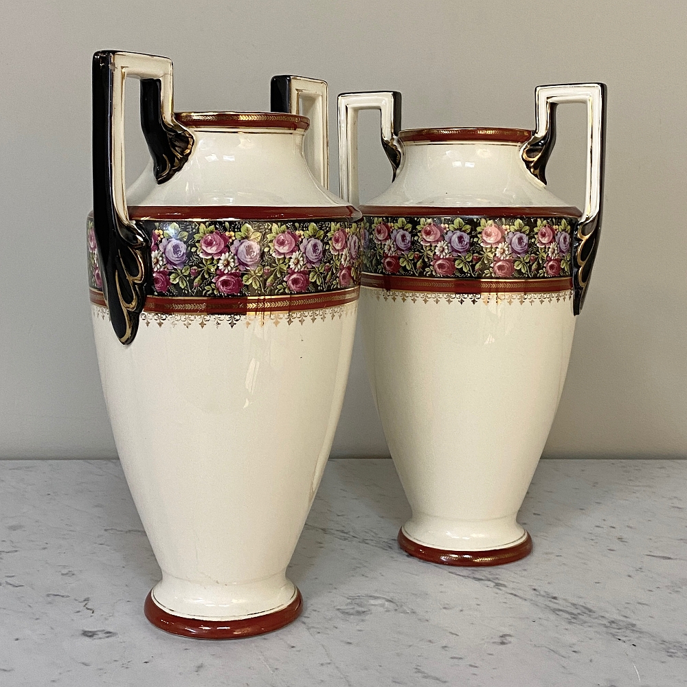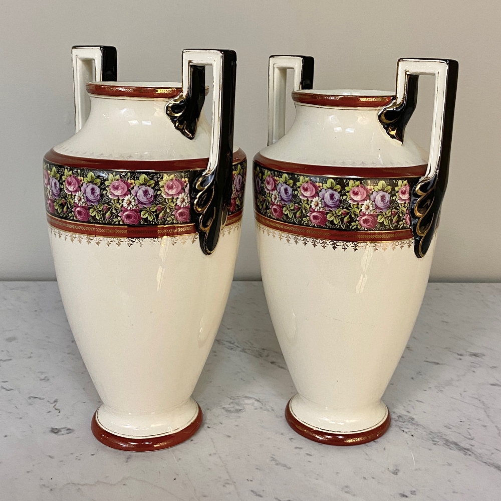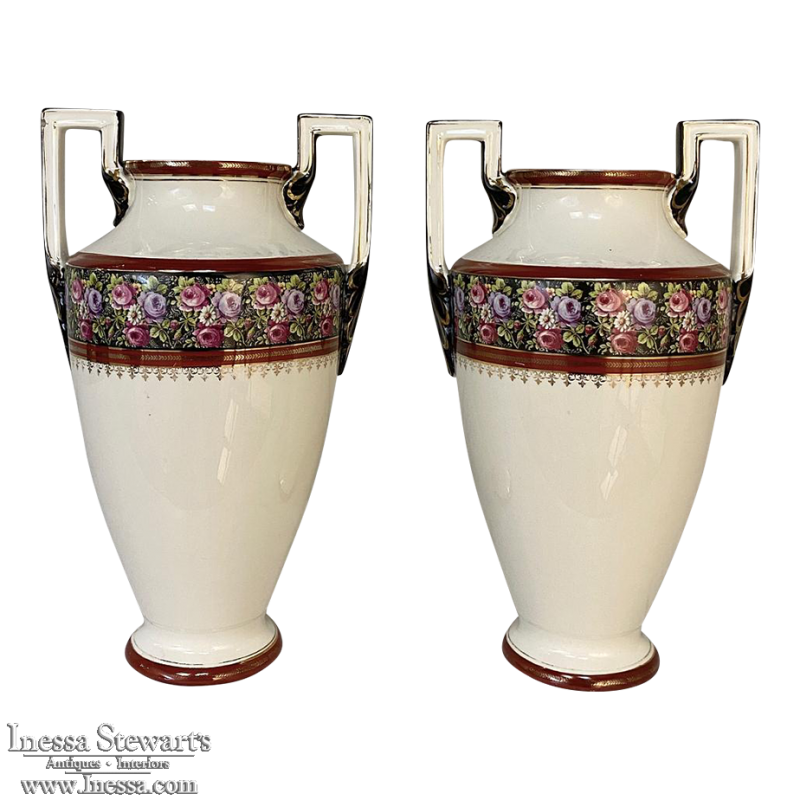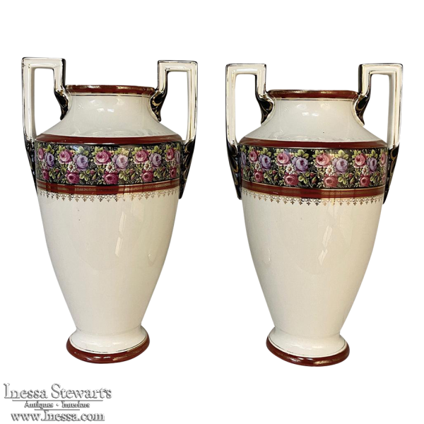 Pair Antique Boch Vases is a splendid example of craftsmanship from the famous maker out of Belgium, with a classical shape inspired by ancient Greek archeological treasures and a colorful display of roses and greenery with fine bordering. In fact, this pair is so beautifully made you don't even have to put fresh flowers or greenery in it ~ it's a decorative accent unto itself!