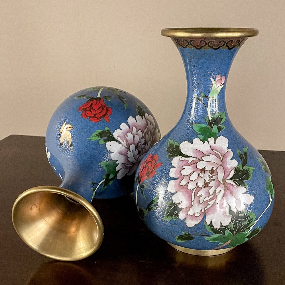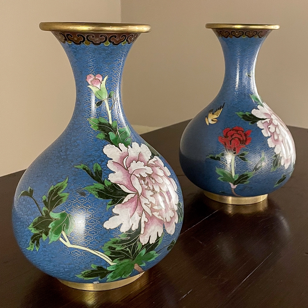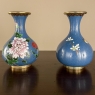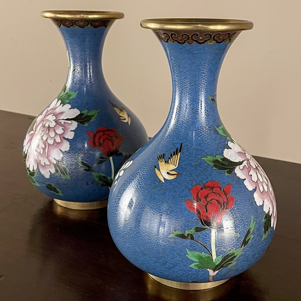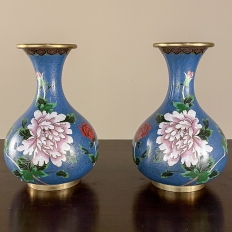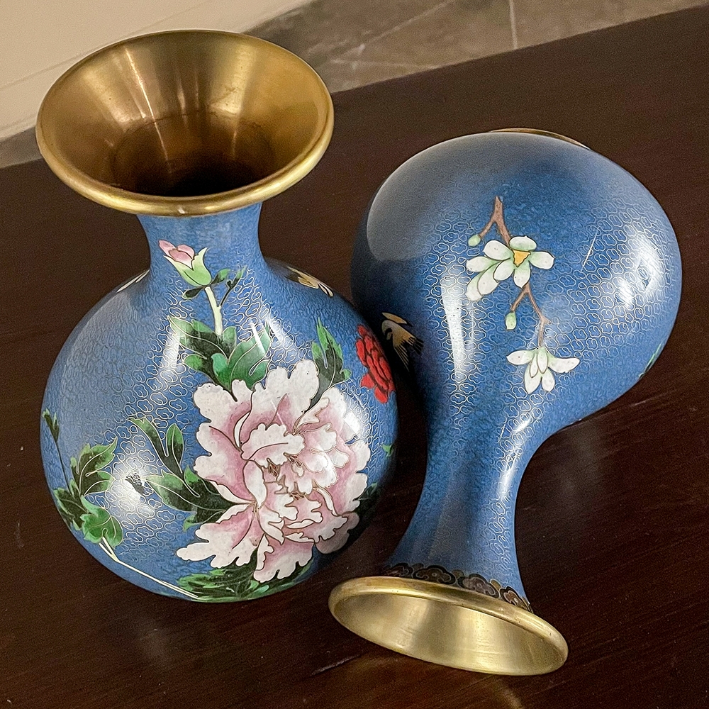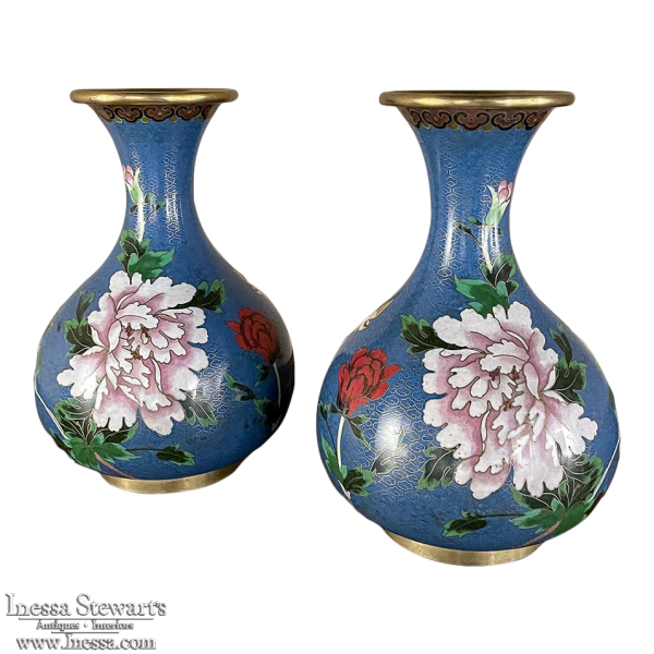 Pair Antique Cloissone Vases is a timeless example of the genre, displaying a well-preserved, rich coloration and exhibiting a floral design theme celebrating the beauty of nature. Decorated in the round, brass wire was carefully affixed to the brass vase, then the spaces created were filled with various colors of enamel, with the result being fired one last time to create the exquisite works of art before you. Cloissone techniques originated in the Far Orient, and were copied by many nations including France, which chose to call the process Champleve. This pair features the most popular combinations of colors with a rich dark cerulean blue as the background making the colorful flowers burst to life!