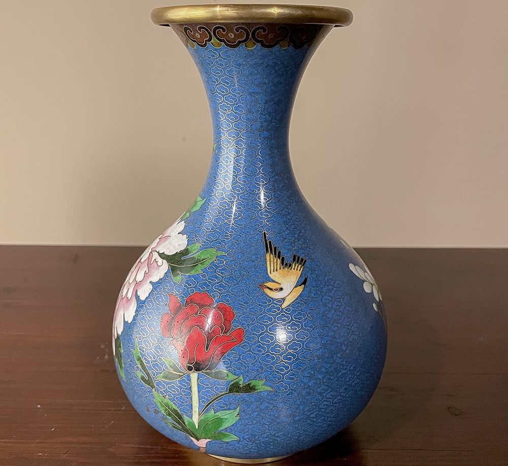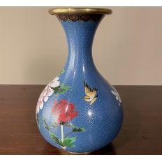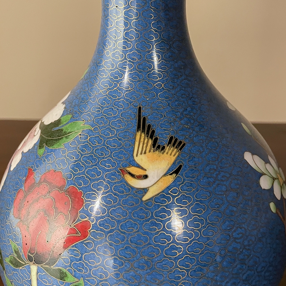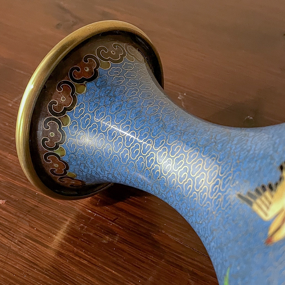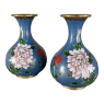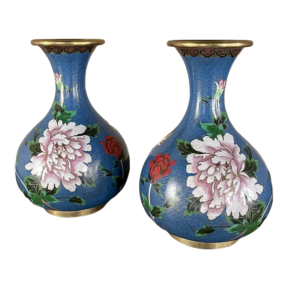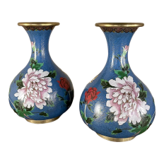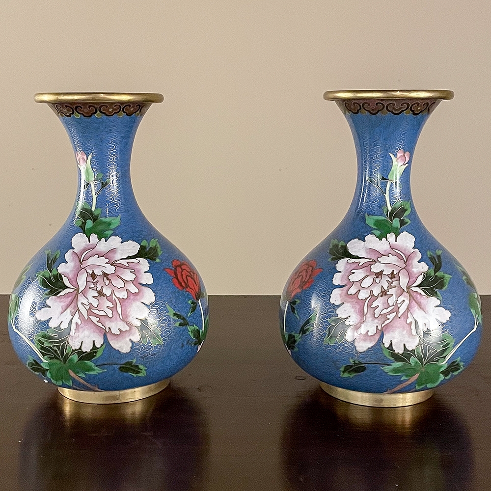 Pair Antique Cloissone Vases is a timeless example of the genre, displaying a well-preserved, rich coloration and exhibiting a floral design theme celebrating the beauty of nature. Decorated in the round, brass wire was carefully affixed to the brass vase, then the spaces created were filled with various colors of enamel, with the result being fired one last time to create the exquisite works of art before you. Cloissone techniques originated in the Far Orient, and were copied by many nations including France, which chose to call the process Champleve. This pair features the most popular combinations of colors with a rich dark cerulean blue as the background making the colorful flowers burst to life!